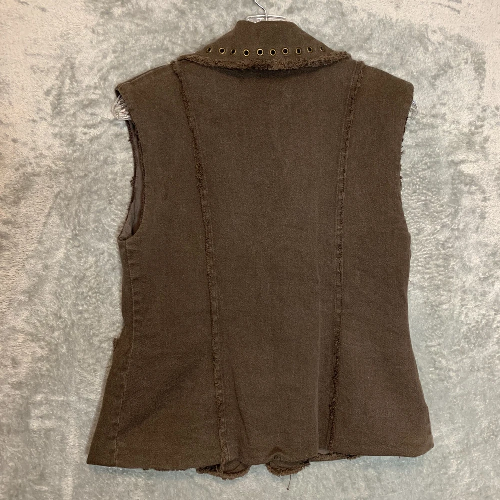 Good Pre Owned condition. Please see photos for details. SUPER FAST SHIPPING!!! We ship next business day! If you aren't happy with your purchase we offer 30 day FREE returns. No questions asked! Women 90s Y2K Streetwear Hip Hop Raw Hem Ring Studded Zip Up Brown Denim Vest S