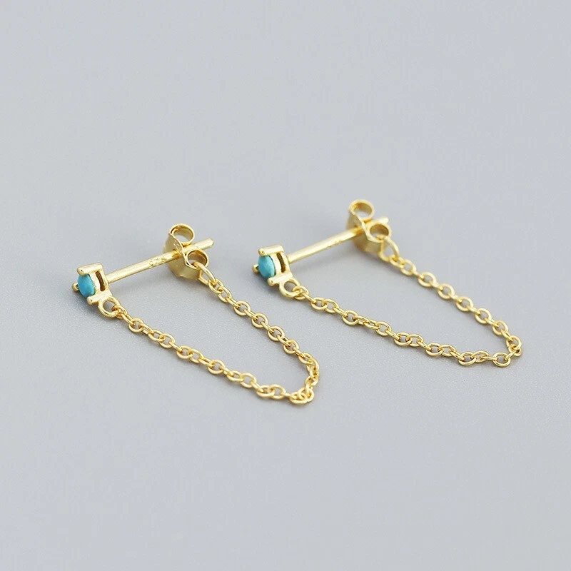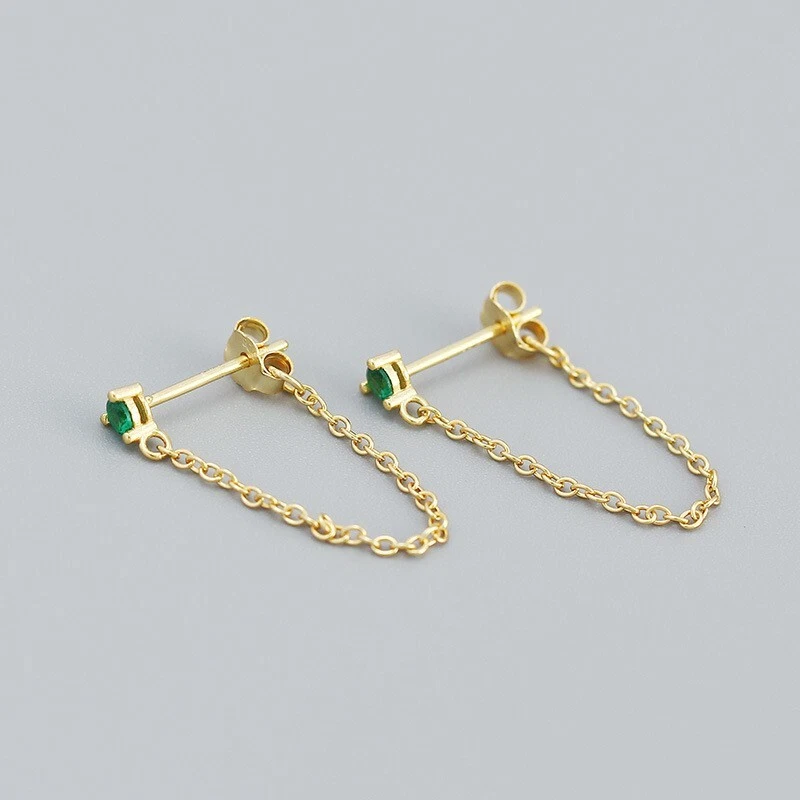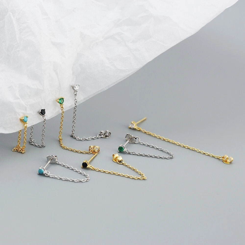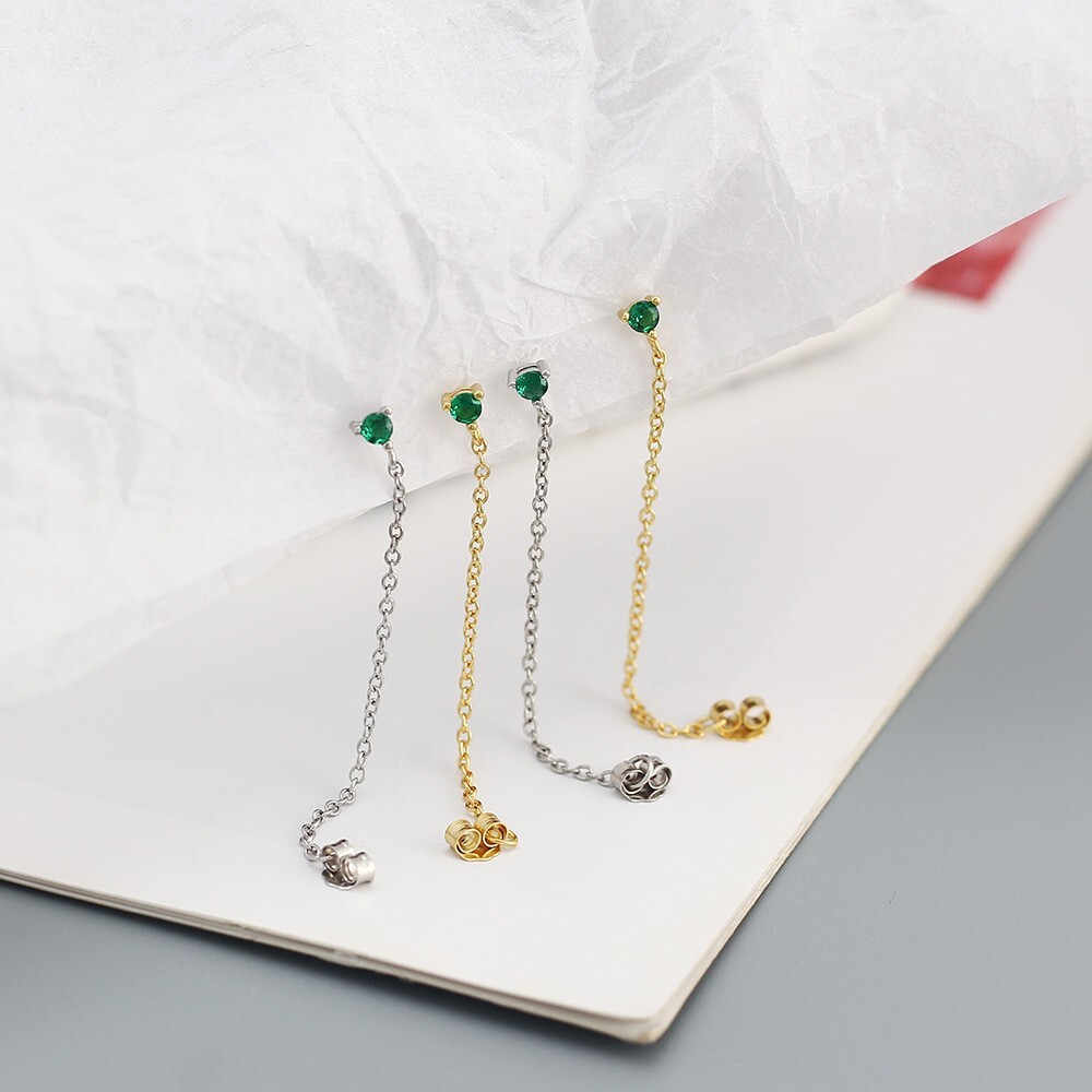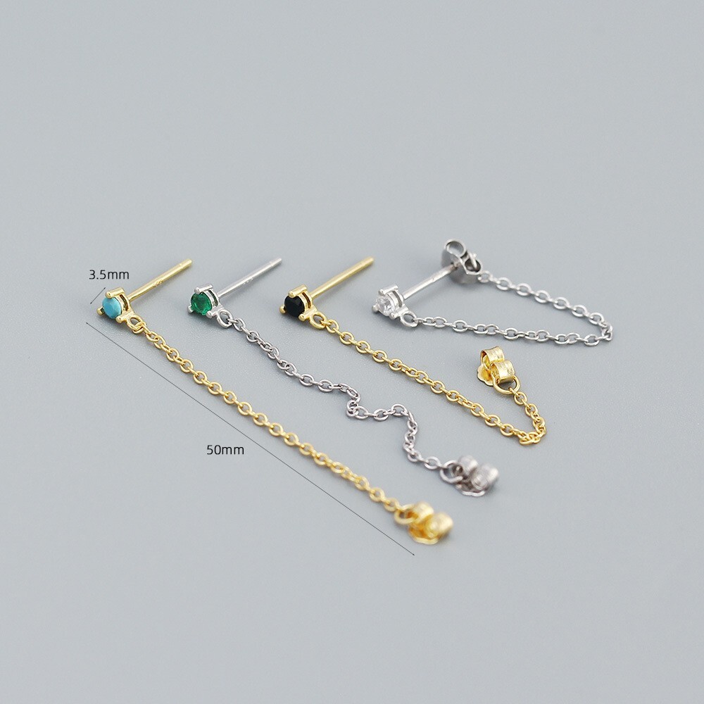 Adorable Round Shaped studs for everyone! Great gift for self rewarding or for your loved one, family, friends. CZ chain earrings, lightweight and easy to wear. This dangle Earrings are made of 18k gold plated S925 Sterling Silver. So they are waterproof, nickel-free, lead-free, cadmium-free and hypoallergenic, which will not turn your skin green or cause anaphylactic reaction. --------------------------------- DETAILS - CZ Part Size: 3.5x3 mm - Chain length: approx. 40mm - Material: Titanium, Gold Plated - Hypoallergenic: Yes - Color: Blue/Green/Black/White - Finish: Gold/Silver --------------------------------- CARE - Please avoid exposing your jewelry to water. - Keep them away from any oils, lotions or perfumes. - Remove before working out and at bedtime. --------------------------------- NOTE - The earrings are sold in pairs. - If you have any questions, please contact me at any time.
