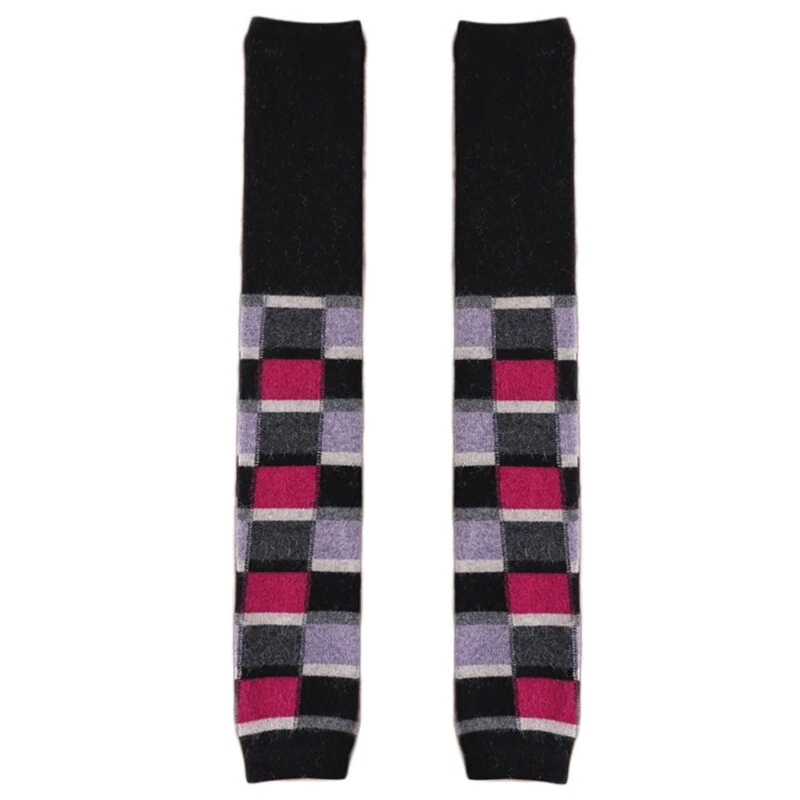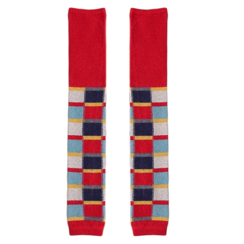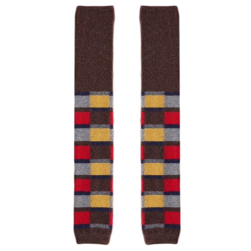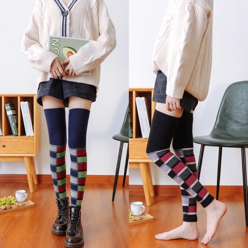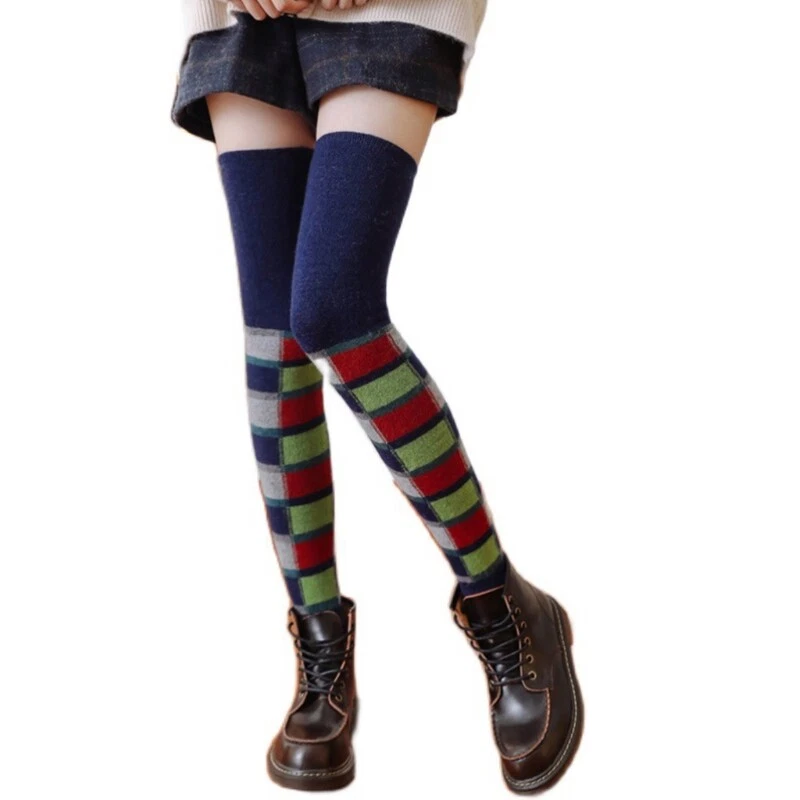 Women Knit Faux Wool Thigh High Socks Multicolor Plaid Print Long Leg Warmers