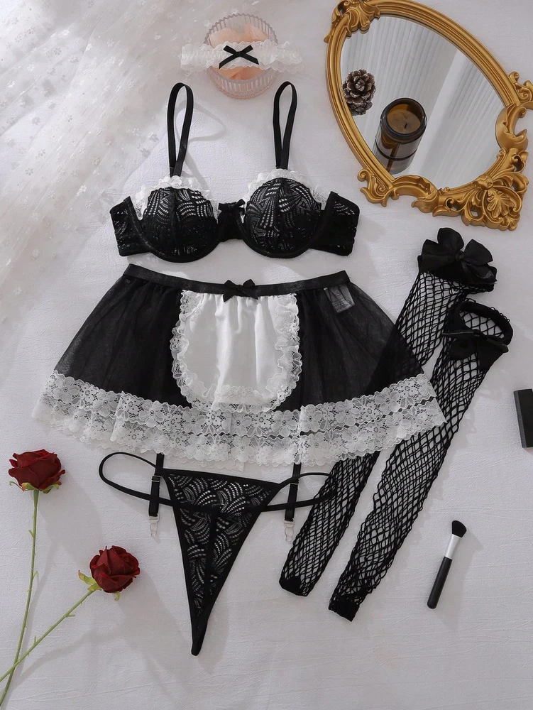 Features: Material : 85%Ployester,15%Acrylic Color:Black Womens Maid Costume Nightwear Lace Trim Dress with Apron Choker Cuffs. Made of soft fabric, breathable, comfy to touch and wear, makes you feeling well. Perfect for theme party, H alloween, role play, honeymoon, Valentine’s Day Set Include : 1 x Lingerie Set