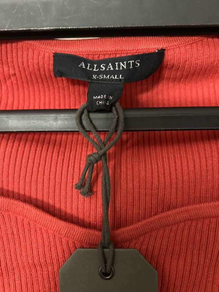 Elevate your wardrobe with this stunning red cropped ribbed sweater from AllSaints. This classic pullover style sweater features a square neckline, long sleeves, and a solid pattern. The XS size is perfect for those who want a comfortable and flattering fit. The sweater also boasts a cropped design, making it perfect for pairing with high-waisted jeans or skirts. Its ribbed accents add a touch of texture and depth to the sweater. Whether you're dressing it up or down, this sweater is sure to make a statement.