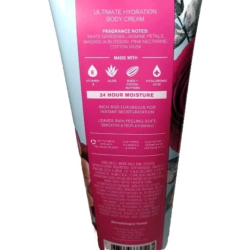 Scent:JasmineSkin Type:Normal SkinSize:RegularFormulation:CreamCountry/Region of Manufacture:United StatesIngredients:Vitamin E, Shea Butter, Aloe, Hyaluronic AcidProduct Line:Bath & Body Works Dark KissType:Body CreamColor:PinkFeatures:Animal Cruelty-Free, Contains VitaminsBrand:Bath & Body WorksBody Area:BodyVolume:10 fl ozDepartment:WomenMPN:none
