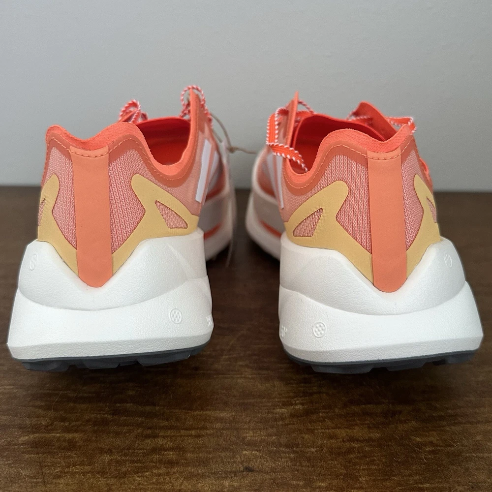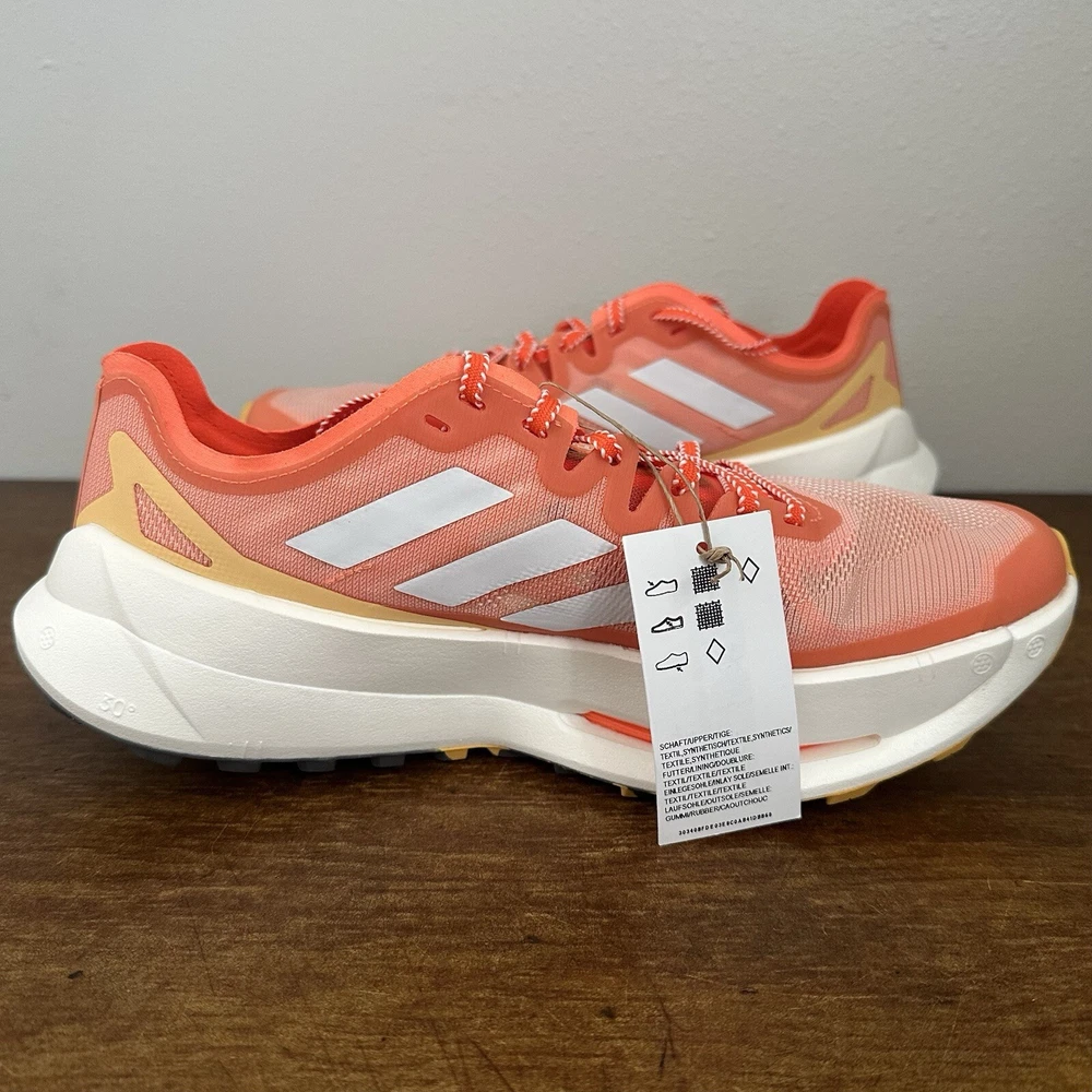 Step into your outdoor adventures with the adidas TERREX Agravic Speed Ultra Amber Tint Semi Spark, a sneaker designed to keep pace with your active lifestyle. Featuring a vibrant orange colorway that commands attention, this shoe is as stylish as it is functional. The synthetic upper material provides durability while the breathable and cushioned features ensure maximum comfort for your walking, hiking, and running endeavors. The low top silhouette and standard shoe width cater to a snug and secure fit, enhanced by the classic lace-up closure. The TERREX Agravic model, with its solid pattern and prominent adidas logo accents, offers a seamless blend of performance and sports-inspired aesthetics. Ready for any activity that comes your way, these athletic shoes are a smart addition to your footwear collection. New without box