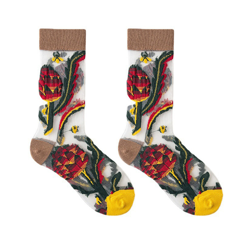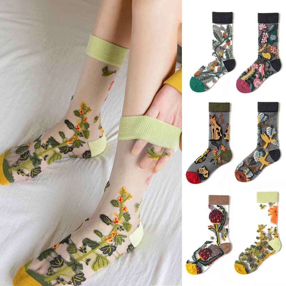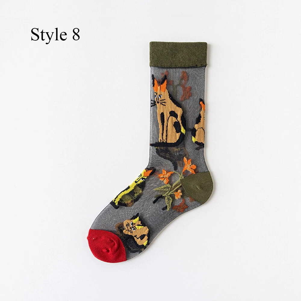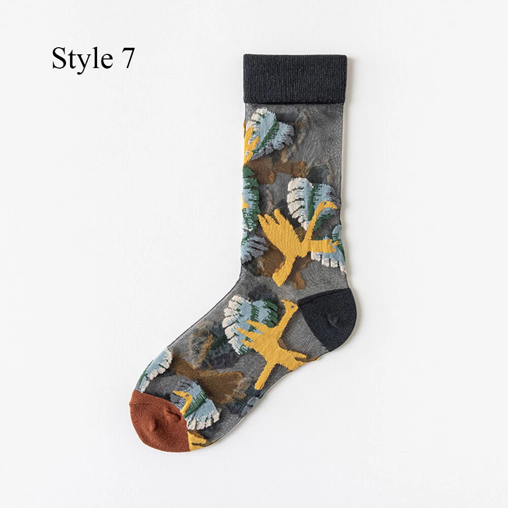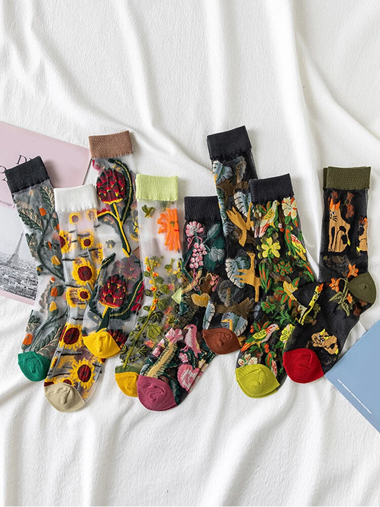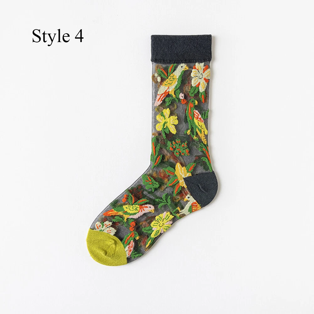 Women Thin Socks Flowers Birds Cat Animal Print Thin Jacquard Fishnet Socks