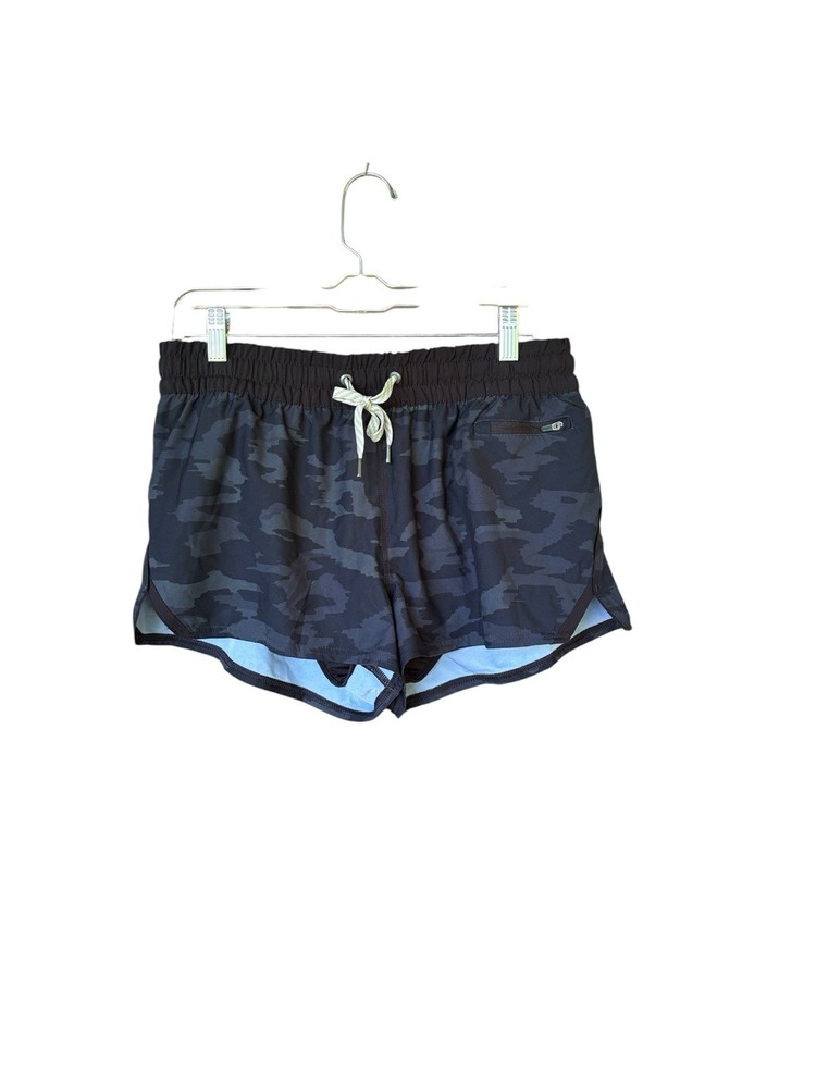 The product is a pair of Vuori Clementine Performance Shorts in a mid-rise style, designed specifically for women in a size large. The shorts feature a black watercolor camo design and have a 2.0-inch inseam, making them suitable for various activewear occasions. With a focus on athletic style, these shorts offer both comfort and functionality for active women looking for a versatile and stylish addition to their activewear collection.