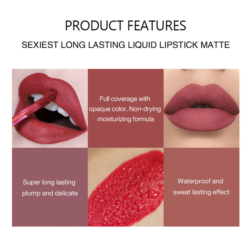 Features: Effect:Velvet Long lasting and waterproof. hard to fade The liquid matte lipstick has high intensity pigment for an instant bold matte lip. The extremely long wearing lipstick contains moisturizing ingredients for a comfortable,emollient and silky feel that does not dry your lips out. This ultra-long wearing lip liner has a creamy texture that glides across the lips for a very easy and comfortable application. Best tool for you to get light make-up or heavy makeup delicately Net Weight: 2.5ml. Weight:15g Product features: non-stick cup lasting does not fade New formula, more silky and lighter Velvet matte, get rid of thick thick lip gloss Color:as shown Package: 1 x Lipstick