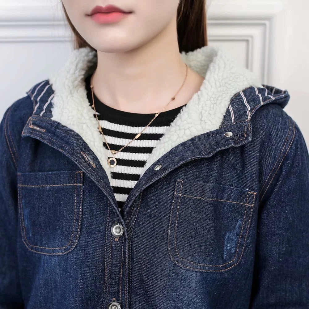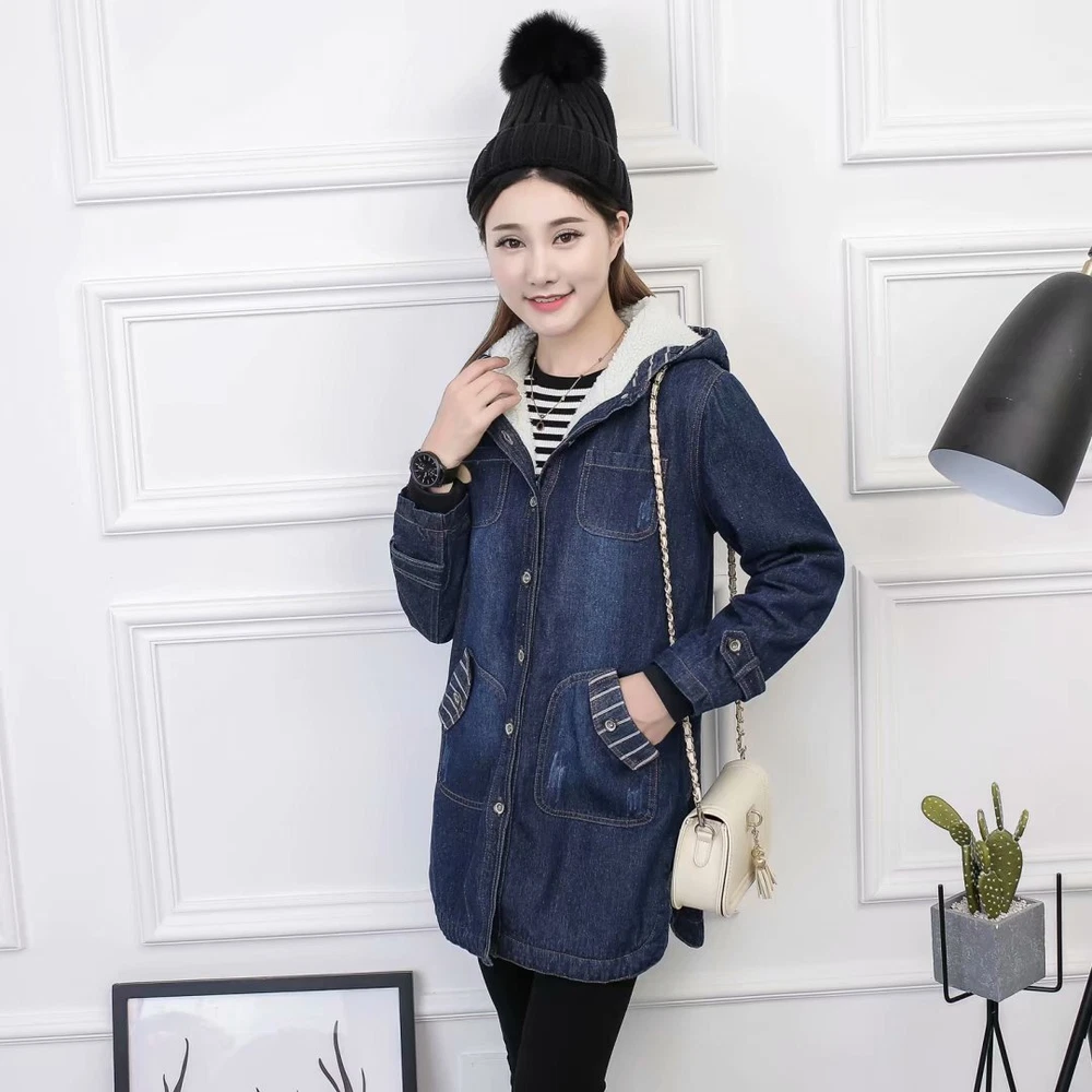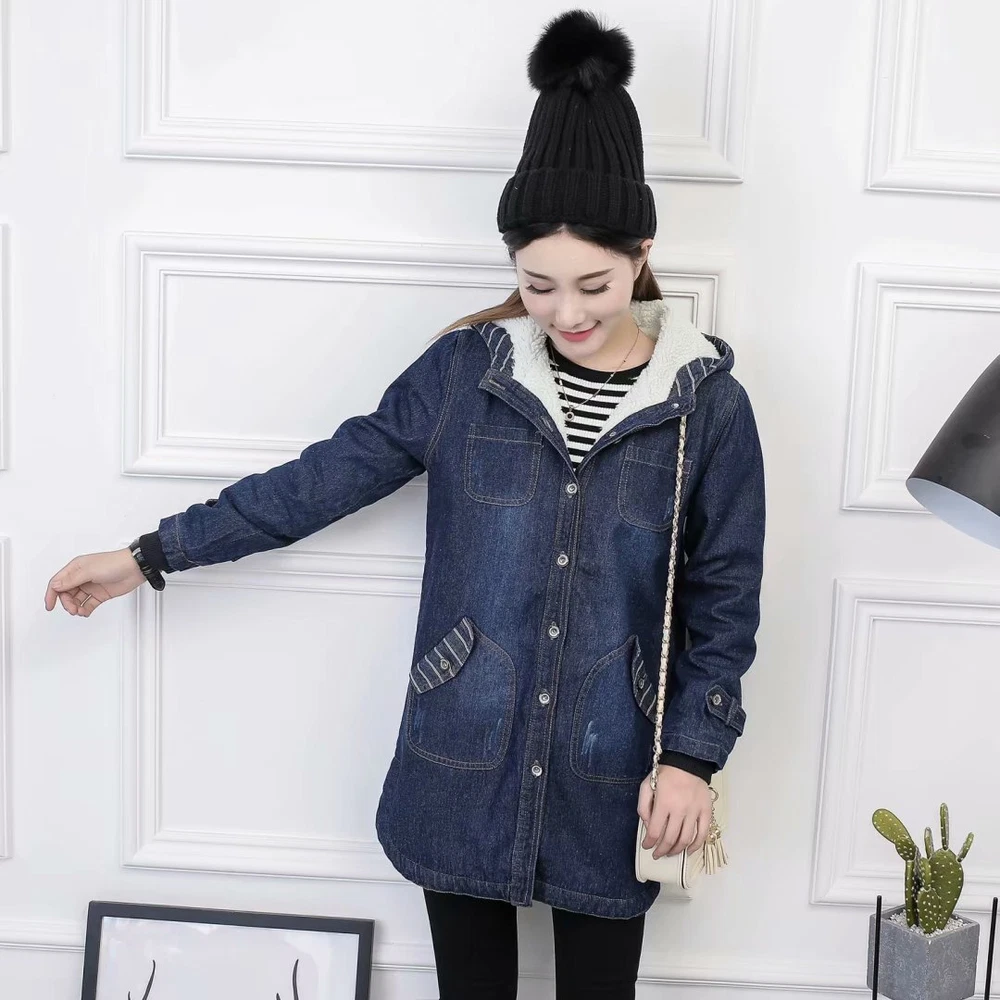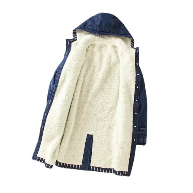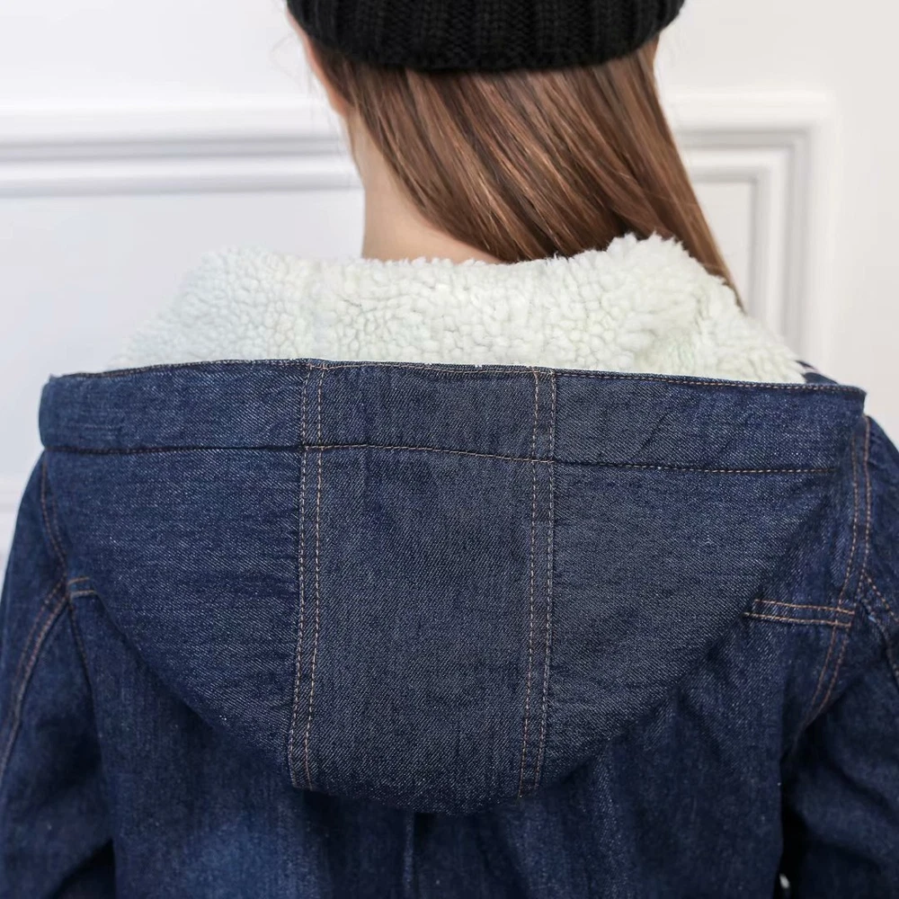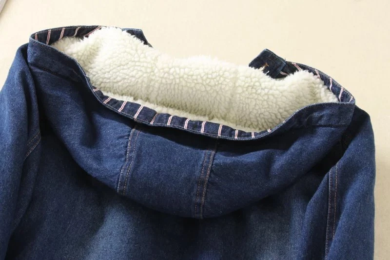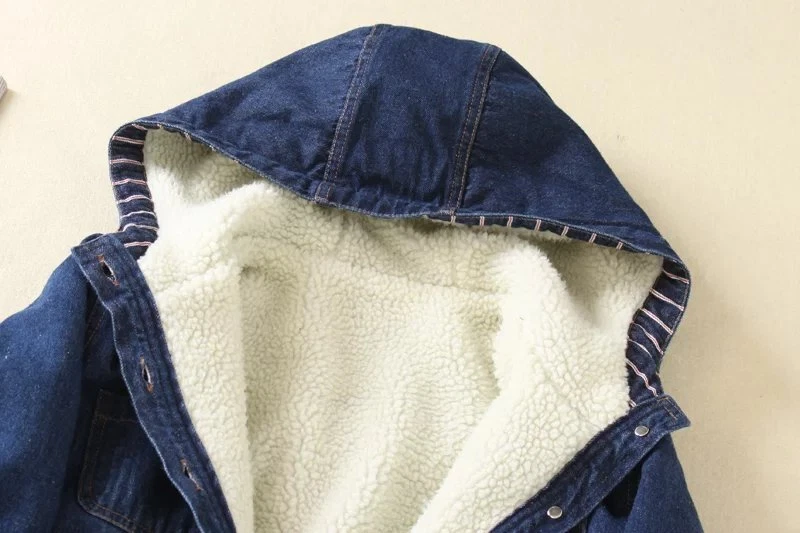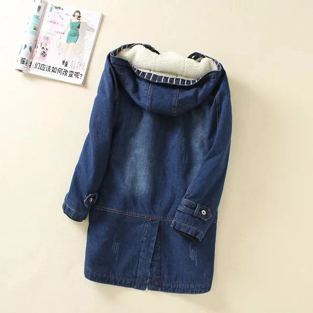Women Winter Casual Long Jeans Jacket Fleece Lined Warm Denim Coat Hooded Parka