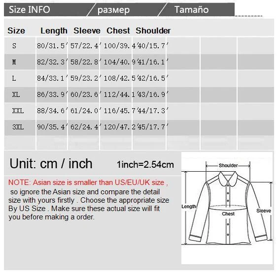 Store category Sign Up Now ! You may also like Product Description Hi! welcome to our shop! Quality first, best service. Customers are our friends. Stylish Design, 100% Brand New, High Quality! Package includes: 1 PCS (without any accessories) notes: 1. Due to the change of screen color setting, the actual fabric color may be slightly different from the online color. 2. The label size is Asian size, the parameters of each size are measured by placing the product on a flat table to measure its outer size. Please measure yourself before ordering, if you are not sure, please contact us. feature: 100% brand new and top quality Reminder: Due to different measurement methods, any 1-3CM error is within a reasonable range Note: Product details are slightly different for different production batches. Please refer to the actual Size Chart: 1inch=2.54cm Size:S, M, L, XL, XXL, 3XL. Real Size Infomation Unit:cm/inch 1Inch=2.54cm [Size S , Length 80/31.5 , Sleeve 57/22.4 , Chest 100/39.4 , Shoulder 40/15.7 ] [Size M , Length 82/32.3 , Sleeve 58/22.8 , Chest 104/40.9 , Shoulder 41/16.1 ] [Size L , Length 84/33.1 , Sleeve 59/23.2 , Chest 108/42.5 , Shoulder 42/16.5 ] [Size XL , Length 86/33.9 , Sleeve 60/23.6 , Chest 112/44.1 , Shoulder 43/16.9 ] [Size XXL , Length 88/34.6 , Sleeve 61/24.0 , Chest 116/45.7 , Shoulder 44/17.3 ] [Size 3XL , Length 90/35.4 , Sleeve 62/24.4 , Chest 120/47.2 , Shoulder 45/17.7 ] Payment Delivery details Terms of sales About us Contact us Payment Accept all payment. We send all the items are based on your paypal address. Therefore, please make sure your paypal address is valid. Delivery details We will arrange shipping for you within 10 days after payment cleared except the holidays Hi ,Great buyer : I will send it out as soon as possible. The company has many stores. Send in order of order. Processing time: 2-4 days. The system automatically uploads tracking numbers. Transportation time: 8-12 working days.(Europe and North America and Australia) Transportation time in the Middle East region and Northern Europe : 10-15 days. Asian transportation time: 5-10 days African transportation time: 30-40 days. Transportation time in South America: 30-40 days Please understand. Wishing you a pleasant shopping experience. . Terms of sales It's highly appreciated you leave us positive feedback and 5 star rating comments if you are satisfied with our service ! Your comment is very important in our business success. About us In China we have our own factory, we support a large number of wholesale and customized, price concessions. And we can achieve long-term cooperation. Provide products for your store. Contact us Our team is with the collection of research, production, distribution and service, Expect in the goods quality be still on the price, after-sales service, we all will keep in the middle of go together of advantage position, real attain the ream customer satisfaction. Feedback