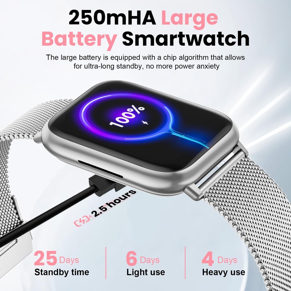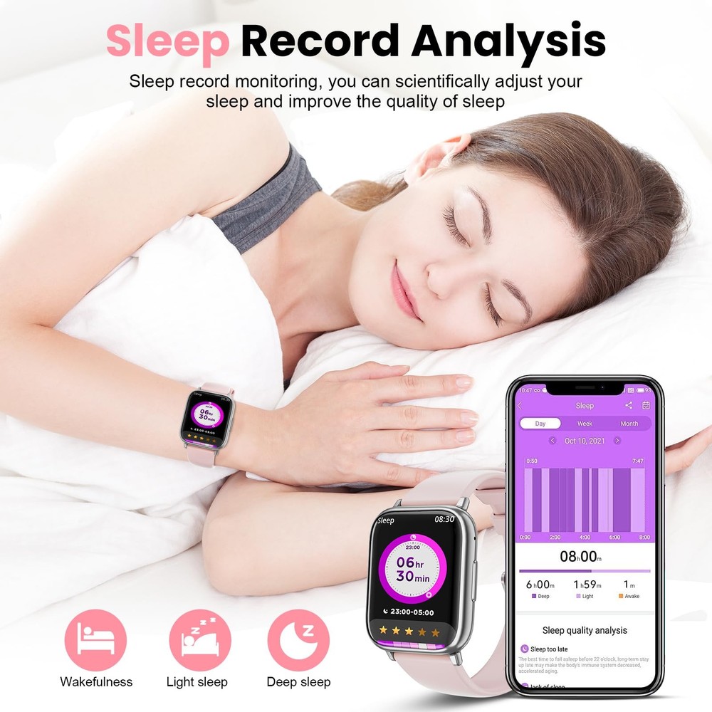 1 【Stylish Customization for Every Occasion】Elevate your style with 3 interchangeable bands (rose gold metal/Pink/White) and 200+ dial designs. Personalize this women’s smartwatch by uploading photos to create unique watch faces, blending fashion and 【Health Monitoring & Female Cycle Tracking】 Smart watches for women feature advanced optical sensors to accurately track heart rate, blood oxygen (SpO2), and blood pressure. Monitor sleep stages (deep, light, awake) with detailed sleep quality analysis. Designed as a fitness tracker for women, it includes female cycle tracking to help manage wellness routines 【107 Sport Modes & IP68 Waterproof Fitness Watch】 Fitness watches for women support 107 activities (running, cycling, hiking) with GPS tracking via phone. IP68 waterproof design withstands rain, handwashing, and workouts. Track steps, calories, and distance, achieve fitness goals (Swimming is not supported) 【Smart Connectivity & Real-Time Alerts】Receive/make calls and view SMS/social media alerts (Facebook/WhatsApp/Twitter) directly on this iPhone/Android-compatible smartwatch. Stay connected hands-free without missing crucial notifications during workouts or daily tasks 𝐃𝐨𝐰𝐧𝐥𝐨𝐚𝐝 𝐭𝐡𝐞 𝐚𝐩𝐩 : 𝐃𝐚 𝐅𝐢𝐭 for multiple dials and features. The smartwatch is also compatible with voice assistants and a variety of basic features that support multiple voice variations, shake to take a picture, weather push, women's health, find your phone, breathing exercises, calculator, pedometer, stopwatch,while 7-day battery life (14-day standby) keeps you powered through intensive use