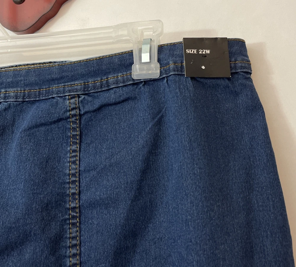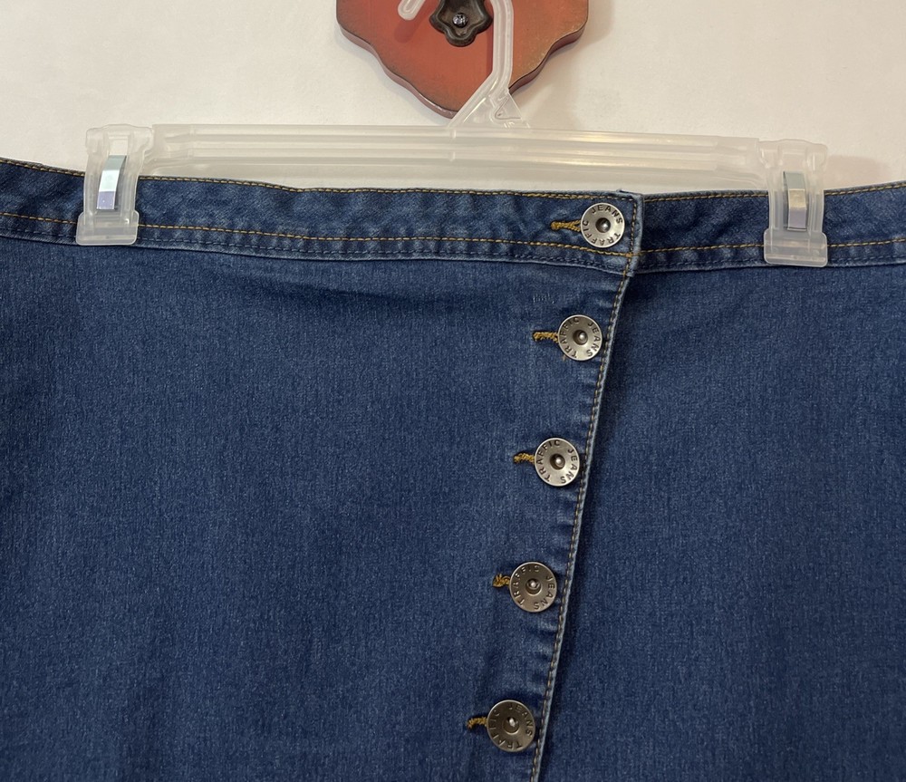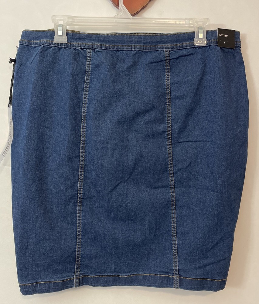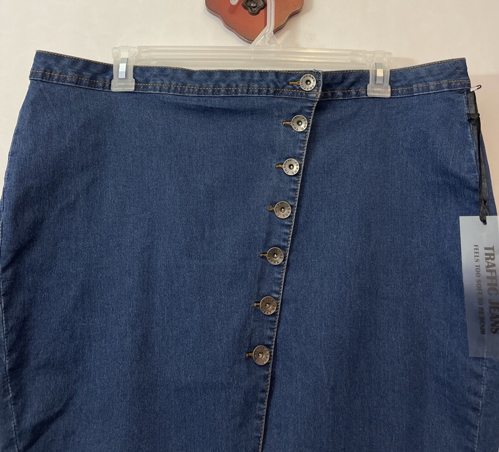 These Traffic Jeans Women's 22W Blue Super Soft Knee-Length Skirt is a stylish and comfortable addition to any casual wardrobe. Made from a blend of polyester, spandex, rayon, and cotton, this skirt features a button closure and a solid pattern in a classic blue color. The knee-length design and stretchy fabric make it perfect for all seasons, while the straight and pencil style adds a touch of sophistication. Whether you're running errands or meeting friends for coffee, this skirt from Traffic Jeans is sure to become a versatile staple in your closet. Length: 23 inches. Waist: 20.5 inches across laying flat.