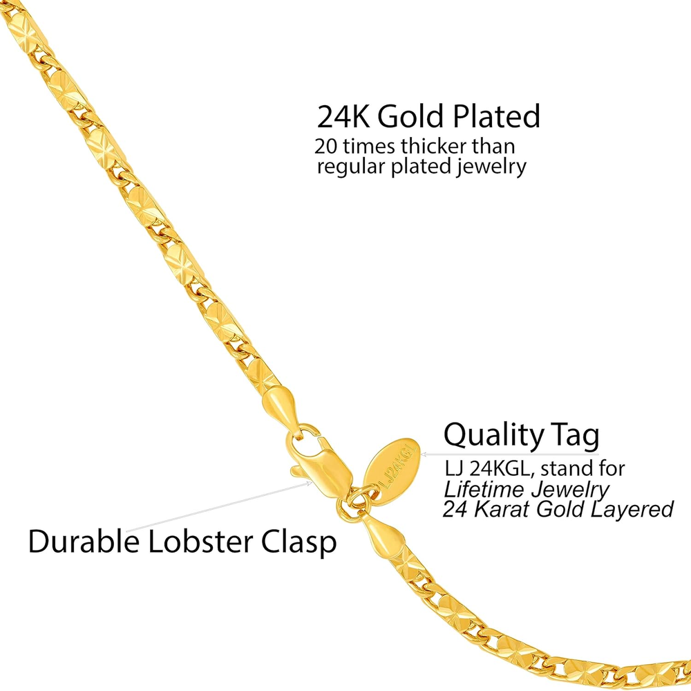 Womens Gold Anklet 4mm Diamond Cut Star Flat Link Chain Ankle Bracelet 24k Gold Plated Product Description Have the look and feel of solid gold at a fraction of the cost ! Lifetime Jewelry 's Diamond Cut Star Flat Link Chain Anklets are made to last. Made of real 24K gold laid over a core of jeweler's bronze, there is up to 20 times more gold than electroplate. This helps make it last and gives it the look of quality. Comes in both: gold plated, as well as rhodium (white gold) plated. YOU CAN BUY EXPENSIVE SOLID GOLD JEWELRY, but would you wear it to the beach? Probably not, right? Wear our anklets anywhere, anytime ! Easy to replace if lost or stolen Wear them at a party or even high class formal occasions. Lifetime Jewelry anklets LOOK AND FEEL LIKE SOLID GOLD We are a family run small business since 1987 We are real people who use our own products every day We expect the best for our families and want the same for yours We cut no corners in our products, and will cut no corners in our support to you Proudly made in USA Item model number Anklet 50B & RD 50B Metal stamp 24K Chain Link Gem Type no gemstone Color Gold Material Metal Metal Gold plated base Model number Anklet 50B & RD 50B Length 9 inches Item Display Length 9.0 Inches Department unisex-child Is Discontinued By Manufacturer No Package Dimensions 3.5 x 3 x 0.59 inches Clasp Lobster Claw 3.0 inches x 3.5 inches x 0.59 inches. Shipping from the USA All of our products are shipped from the USA, ensuring quick delivery to your destination. Payment We offer the following payment methods: PayPal, credit card, bank transfer, and eBay's secure payment system. Free Shipping & Free Returns Shipping within the USA is FREE. Additionally, any return is absolutely free for you. Risk-Free Purchase You have the option to return an item within 30 days without any justification. We cover the return shipping costs! Fast Shipping We ship immediately upon receipt of payment. Generally, the package is delivered within 2-3 days in the USA. If it takes longer, we will contact you. Quality and Costs Made in Europe, USA, China No customs fees or additional charges Total satisfaction guarantee Invoice with declared VAT available upon request in .pdf format Feedback Your feedback is very important to us. After you pay for your purchase, you will automatically receive positive feedback from us.