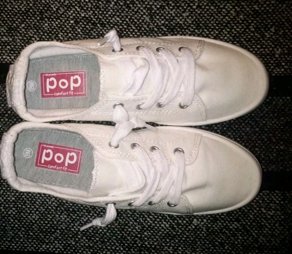 Elevate your casual look with these Pop Shoes women's sneakers in white. Featuring a round toe and lace-up closure, these shoes are perfect for traveling or daily use. The canvas upper material and synthetic outsole material provide durability, while the memory foam features ensure comfort. These sneakers have a low top shoe shaft style and come in a women's size 8M. The eyelet accents and solid pattern add a touch of style to the shoes, making them perfect for school, college, or dance performances. Whether you're walking, running errands, or doing chores, these Pop Shoes are the perfect addition to your wardrobe.