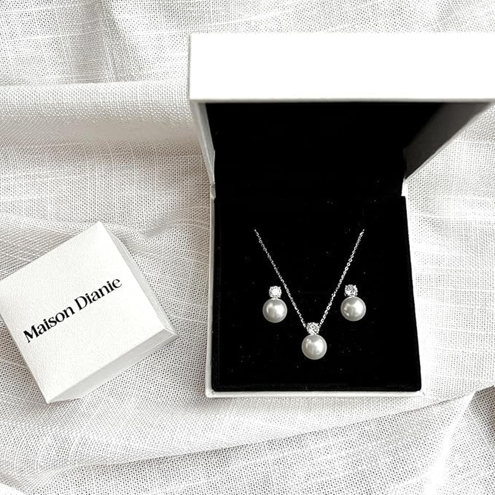 Women's jewelry set Pearl Pendant Necklace and Pearl Earrings Silver 925 White Crystal Pearls 10mm and Zicron Cubic 5mm Product Details Style: White Pearl Necklace Brand: Maison Dianie MPN: Pearl01 EAN: 3760404930040 UPC: Does not apply Department : womens Date First Available : October 21, 2024 Brand, Seller, or Collection Name: Maison Dianie Material: Sterling Silver Gem Type: crystal pearl Chain: Box Clasp: Buckle Metal: Sterling Silver Metal stamp: 925 Silver Number of stones: 1 Stone Creation Method: Synthetic Stone Treatment Method: Clarity Enhanced