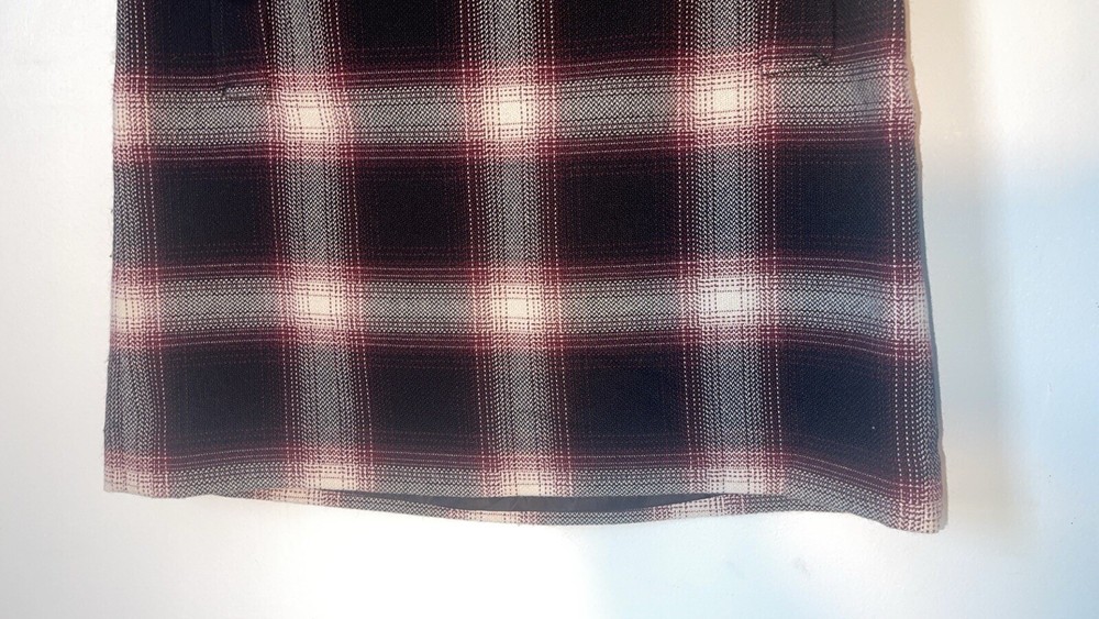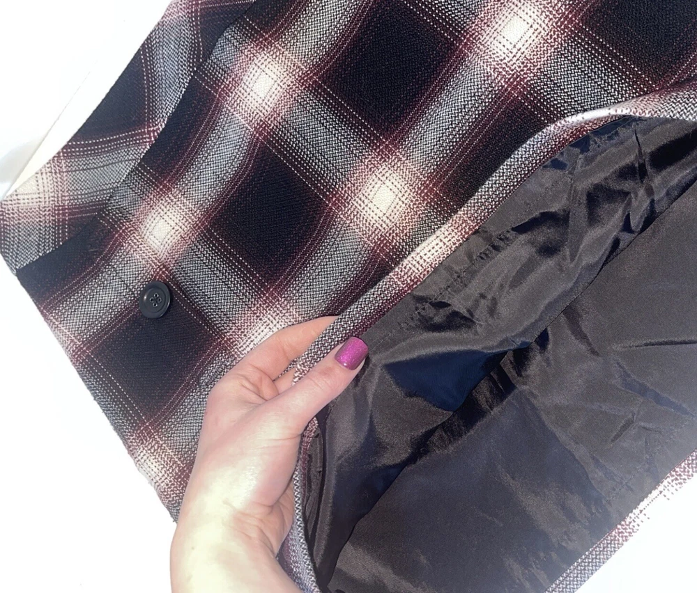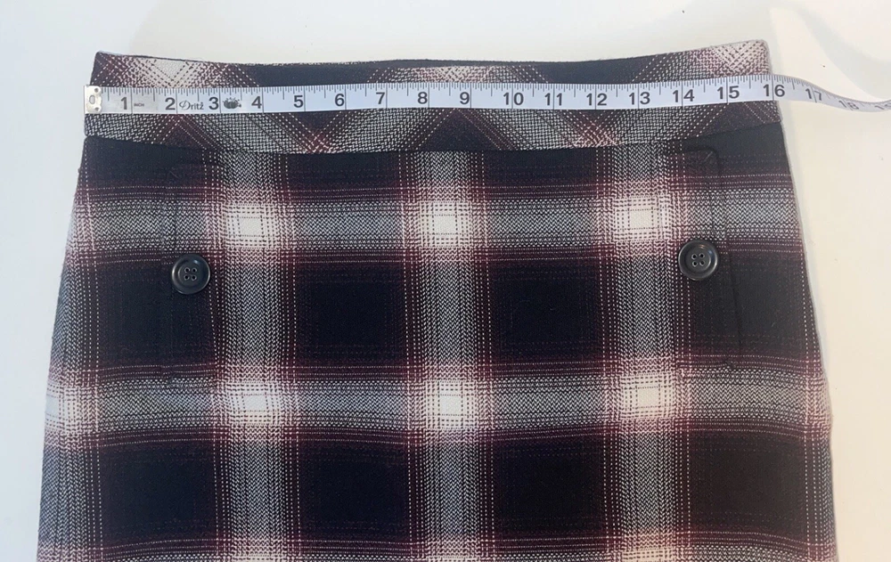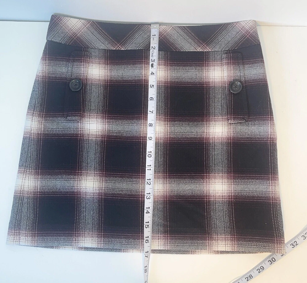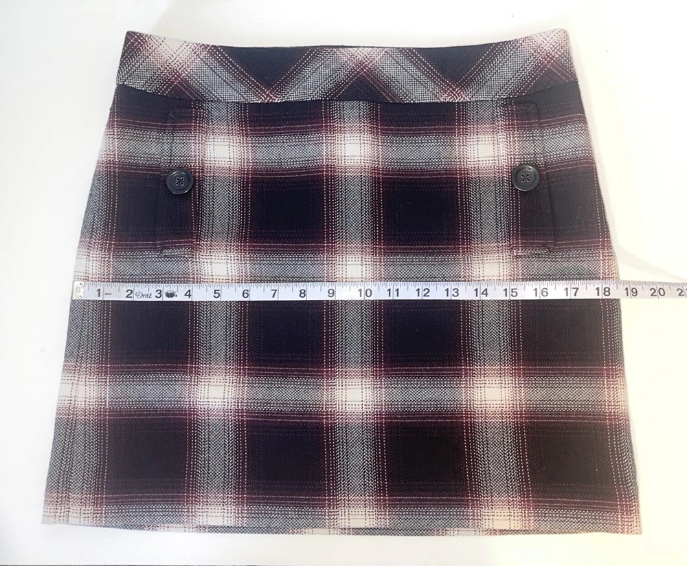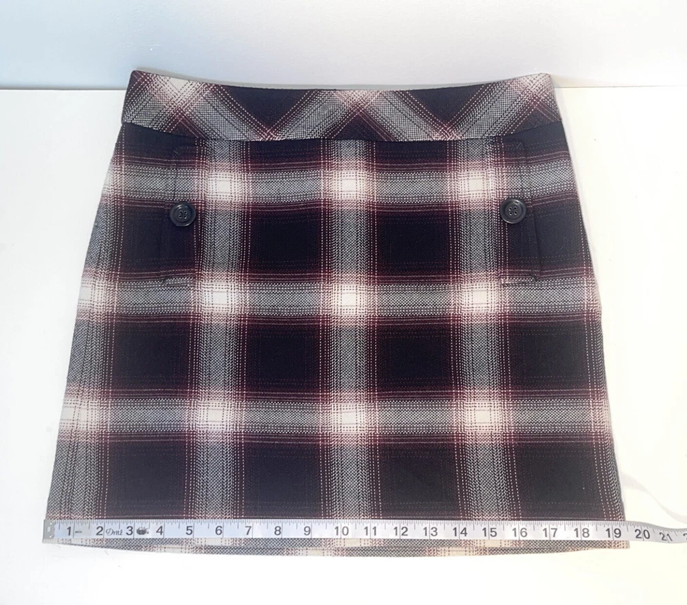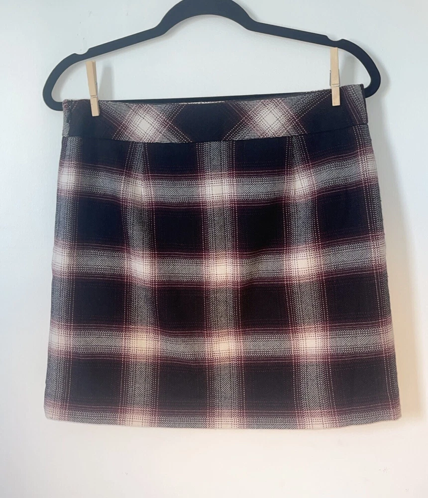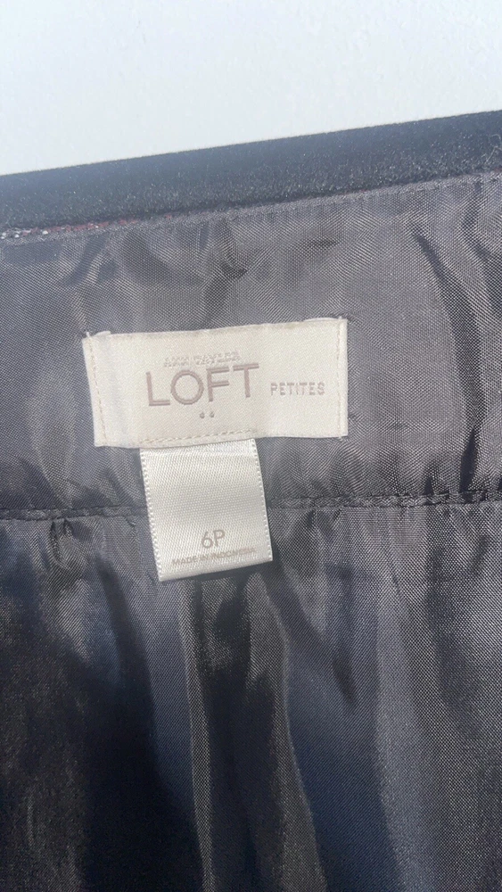 Womens Ann Taylor Loft skirt size 6P Petite A short straight skirt with the slightest flare A solid black and white plaid pattern with a dark maroon purple teased throughout A side zip closure, with a clasp at the waistline No material tag in the skirt, a nice lightweight material with a smooth black lining on the inside Decorative pocket with button on either side on the front, just accents as they do not function A preowned item in good condition shows slight wear but no noticeable flaws Comes cleanly, packaged well, free of pet hair and smoke smell