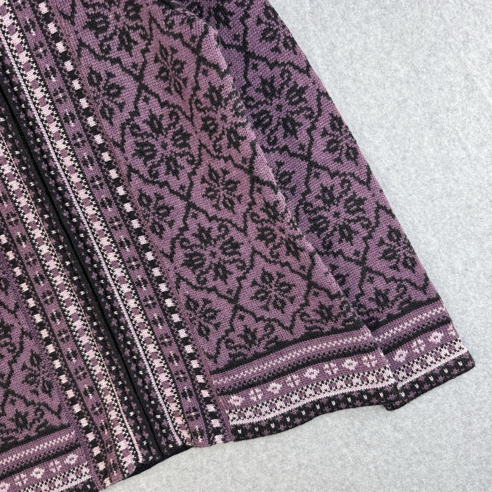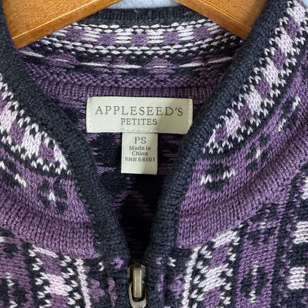 Women's Appleseed's Purple Full Zip Fair Isle Long Sleeve Cardigan Sweater PS. Made out of nylon, acrylic and, wool. In excellent pre-worn condition. View approximate measurements below. Pit to pit 19" Length 24" Sleeve 24" Shoulder to shoulder 16" SKU F22