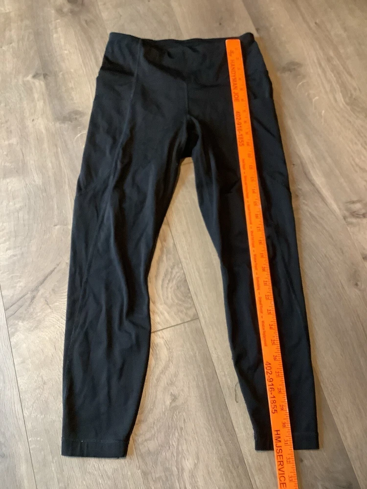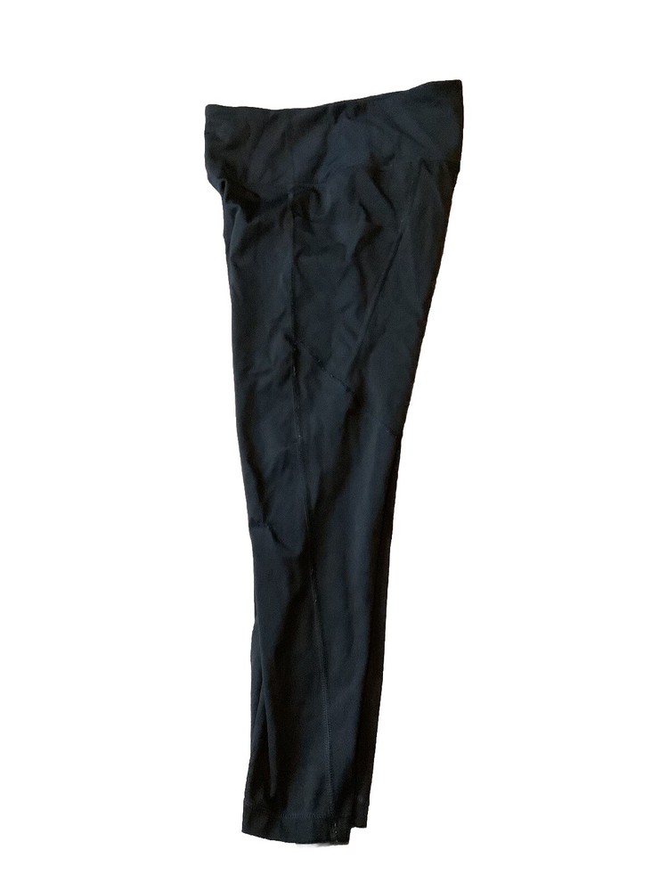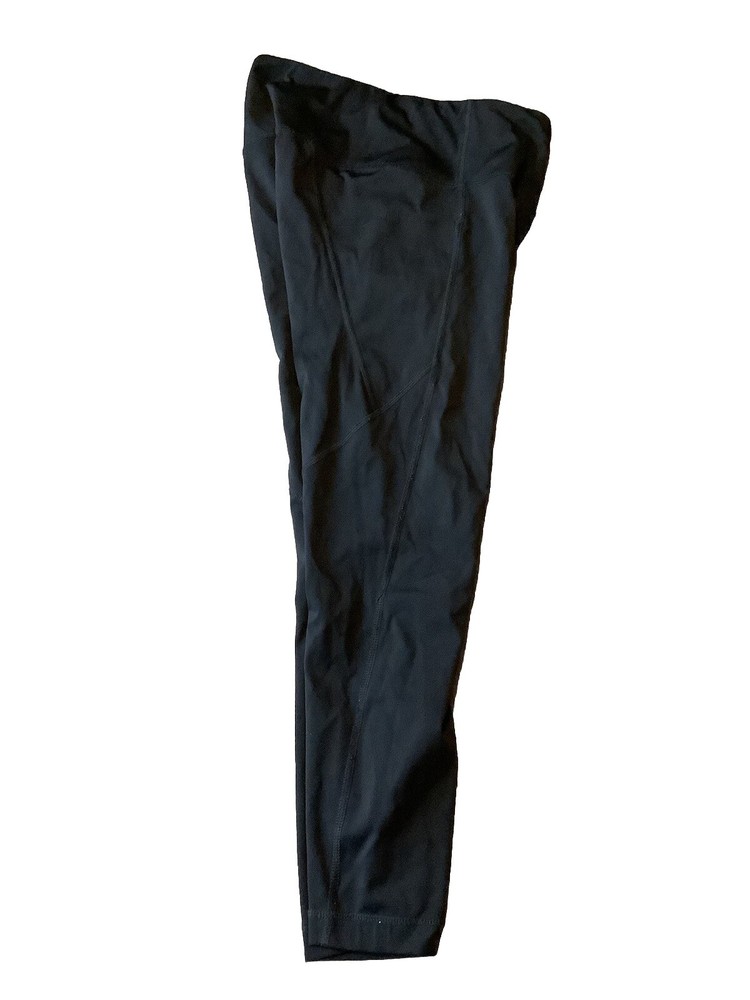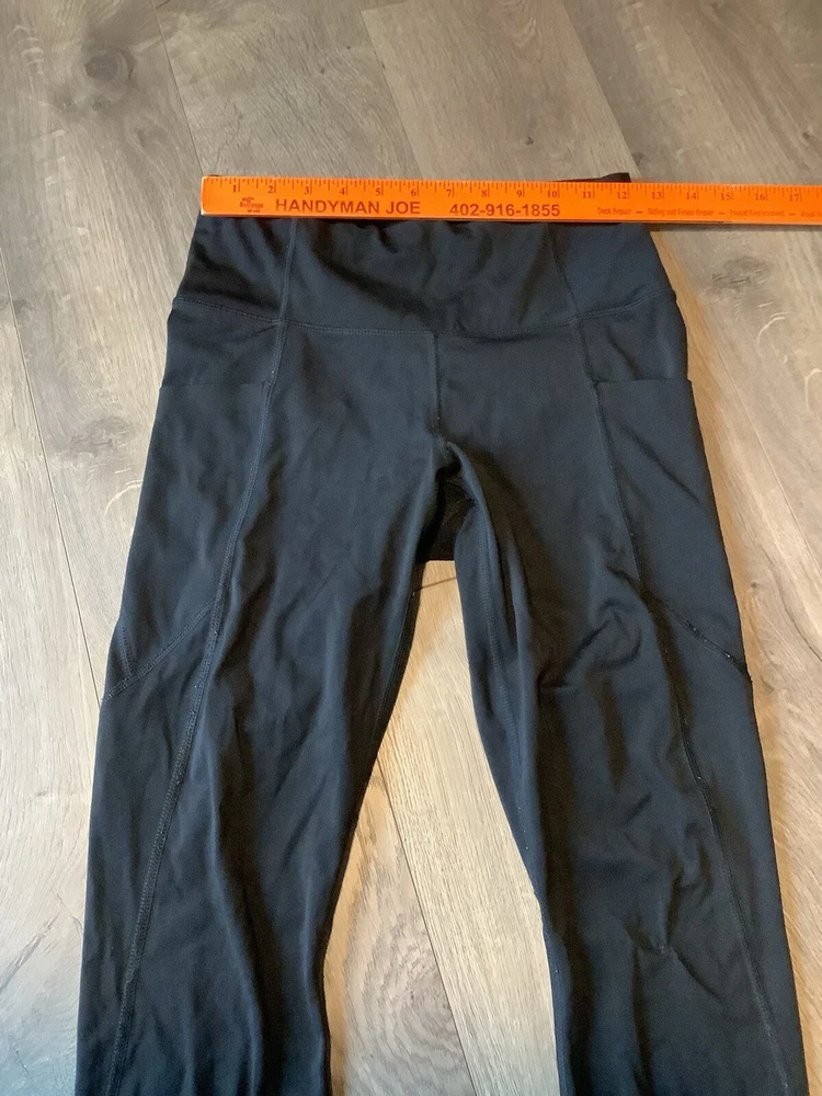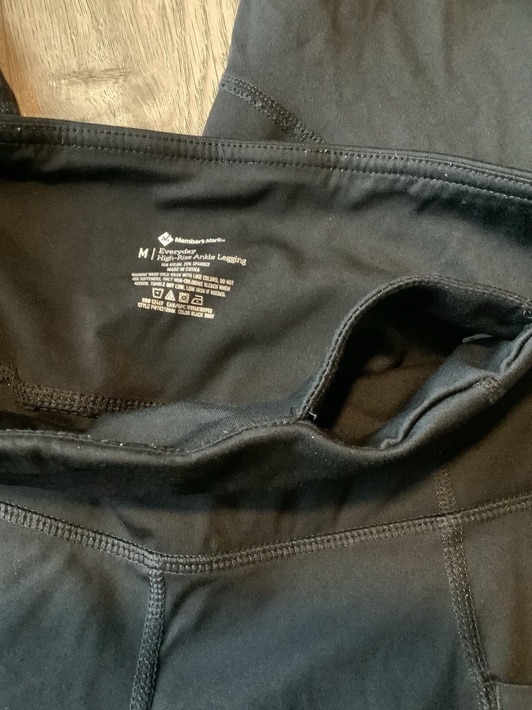 Elevate your activewear game with these Members Mark Women's Black Everyday Athletic Ankle Leggings. Designed with comfort, stretch, and breathability in mind, these leggings are perfect for all your favorite activities, from running to yoga. The elastic waistband and tapered leg style provide a flattering fit, while the media pocket and easy care features add convenience. Made from a blend of nylon and spandex, these leggings are machine washable and have a solid pattern with a black color. They are suitable for travel, casual wear, and activewear, making them a versatile addition to your wardrobe. With a size of M and a waist size of 24 inches, these leggings are perfect for everyday use. I did stitch a hole in the left knee - see photo- otherwise the leggings are in good condition. Pet free and smoke free household