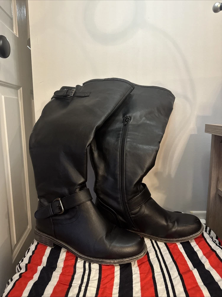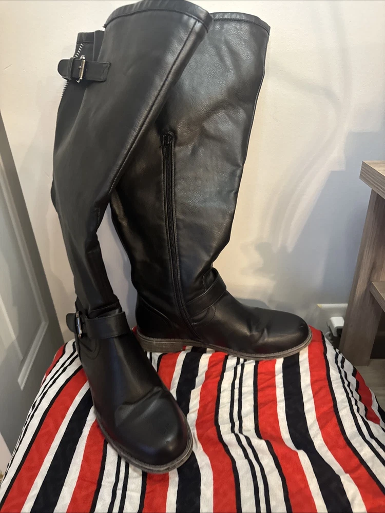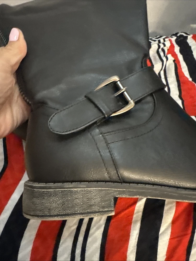 Elevate your riding style with these stunning knee-high boots. Crafted from high-quality faux leather, these boots feature a round toe and zip closure for a secure fit. The buckle accent adds a touch of sophistication, while the low block heel provides comfort all day long. Perfect for any occasion, these black pebbled toe boots are a must-have for any fashion-forward woman. The regular calf width and medium shoe width make them easy to wear, while the knee-high shaft height adds an extra touch of elegance. Whether you're dressing up or down, these boots are sure to turn heads.