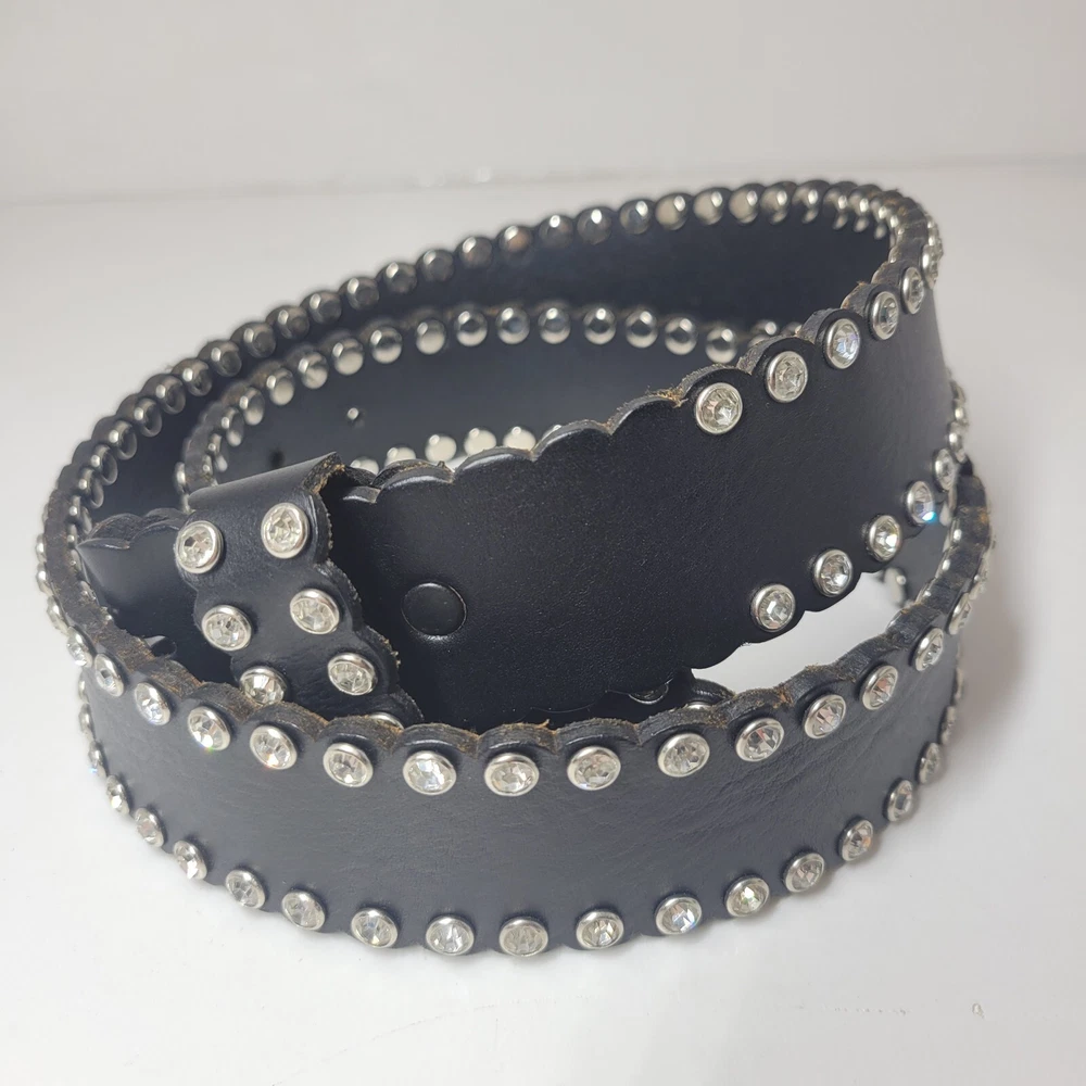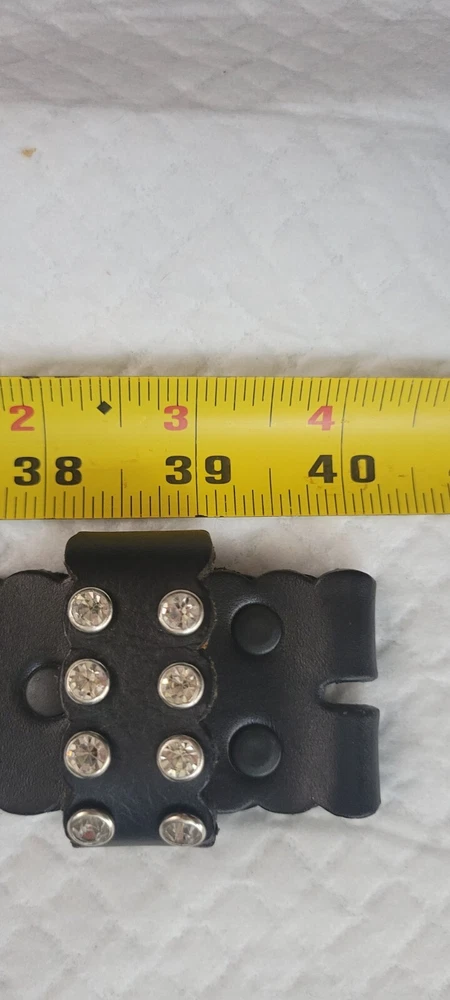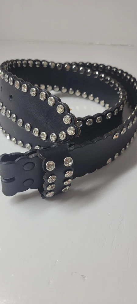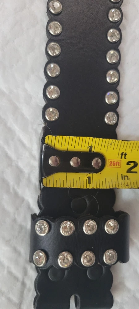 Type:BeltDepartment:WomenCharacter:CowgirlBrand:UnbrandedSize:XLMaterial:Faux LeatherBelt Width:1.5"Pattern:TooledFeatures:Adjustable, No Buckle, Interchangeable BuckleTheme:WesternSize Type:PlusStyle:Studded BeltAccents:RhinestoneColor:BlackWaist Size:More Than 39 in