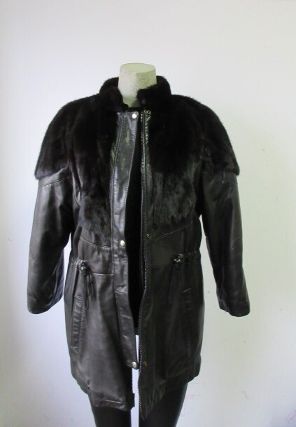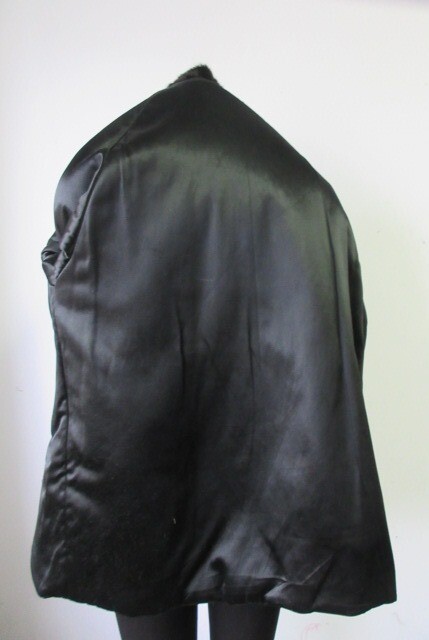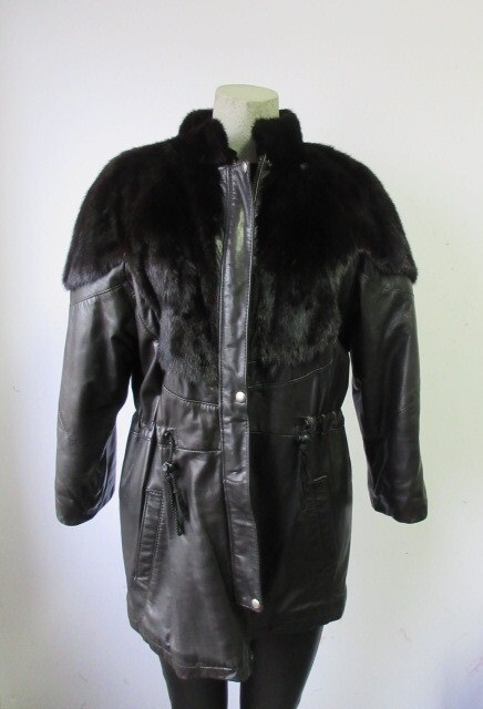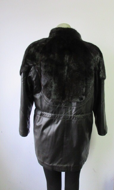 I tem Description: Black mink fur jacket / coat with leather Warm mink fur collar , front zipper and snap closures, side pockets, drawstring at waist and black satin lining complete the look of this beautiful fur jacket. Fur , leather and satin lining in excellent condition. Professionally cleaned and is ready to wear. SIZE: 6 Chest Closed 40" LENGTH : 31" SLEEVES : 27"