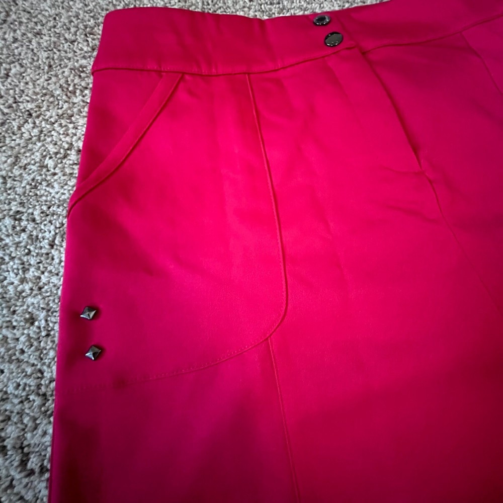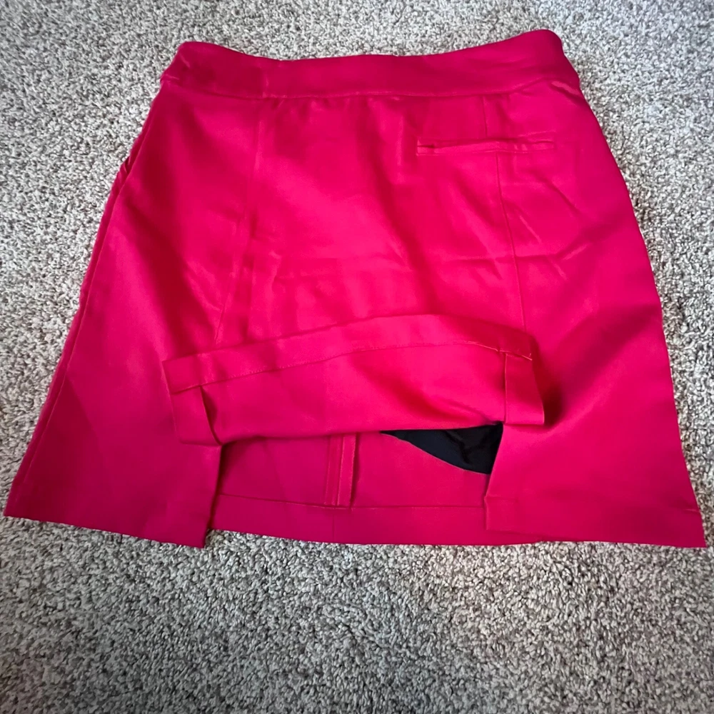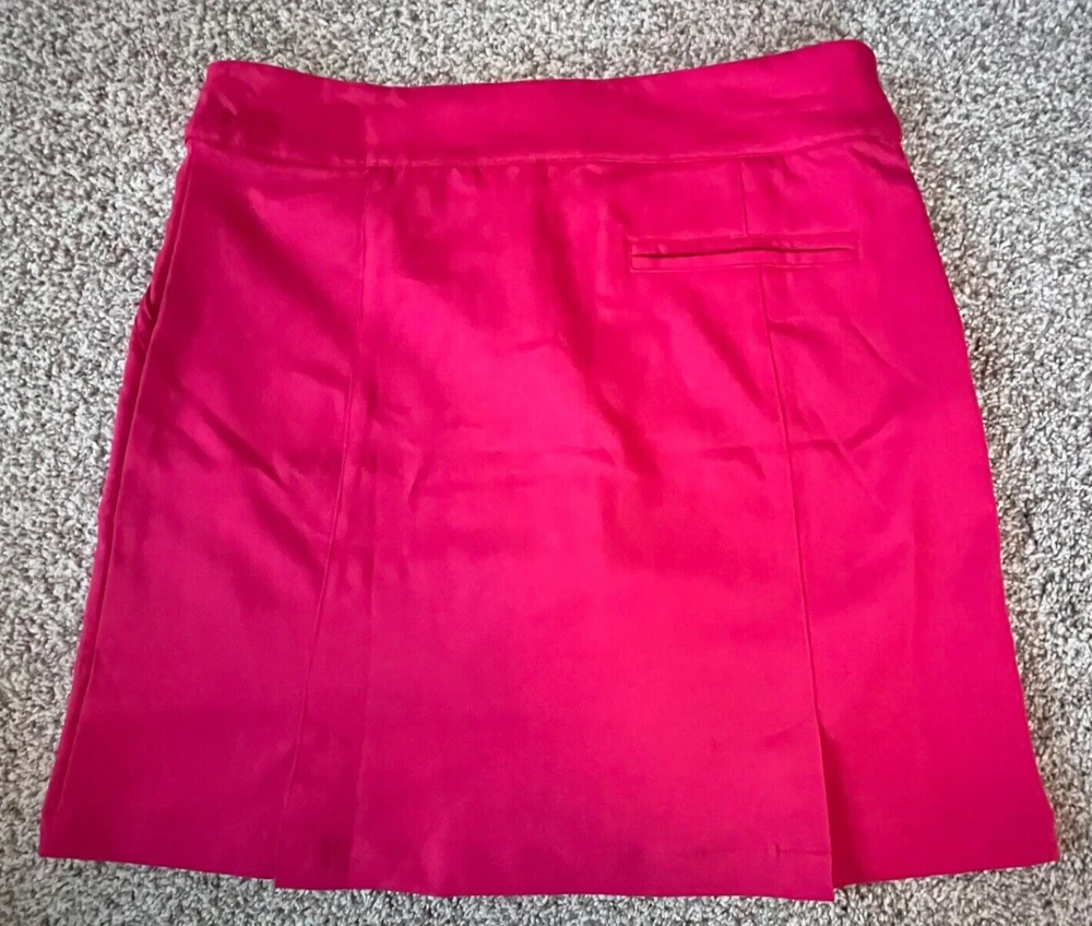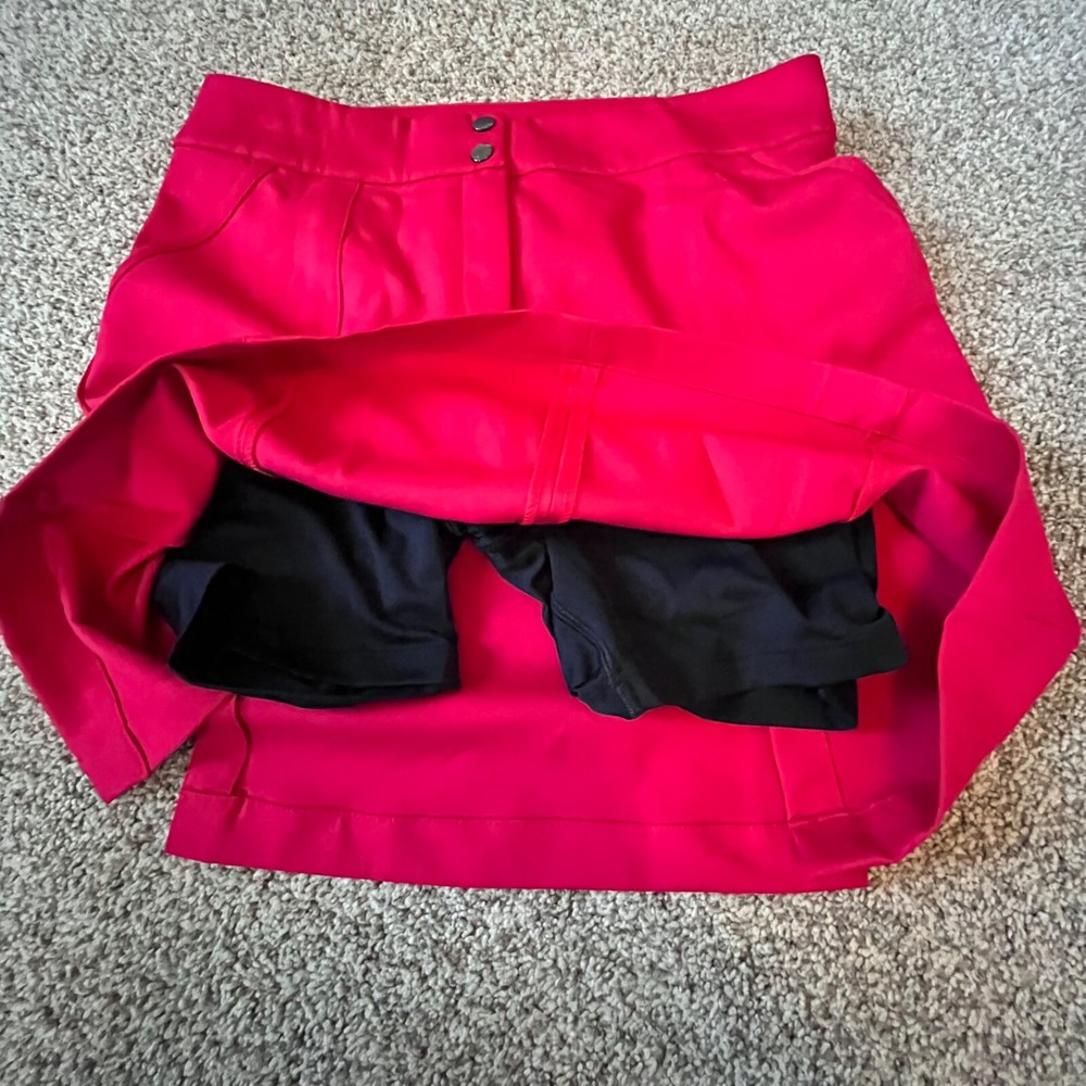 Absolutely love this skort! The vibrant red color is stunning, and the fit is perfect for both golf and casual wear. The front and back pockets are super handy, and the black inner shorts stay in place comfortably. The double button and zipper closure feels secure. Even though it's pre-owned, it looks and feels almost new—awesome find! Highly recommend for anyone who wants style and function.