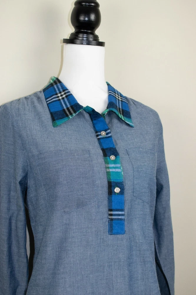 Blue chambray quarter button painter blouse from Anmol. This classic artist shirt style is a casualwear wardrobe staple. UK size 22. Brand new with tags. Features: Lightweight chambray fabric - 100% cotton. Contrasting plaid fabric to collar and placket. Two chest pockets. Back hem is longer than front. Moderately loose fitting. Machine washable. Approximate measurements: To fit bust - 46" Length from shoulder to hem - 32" Any questions, just ask. Click here to view my store.