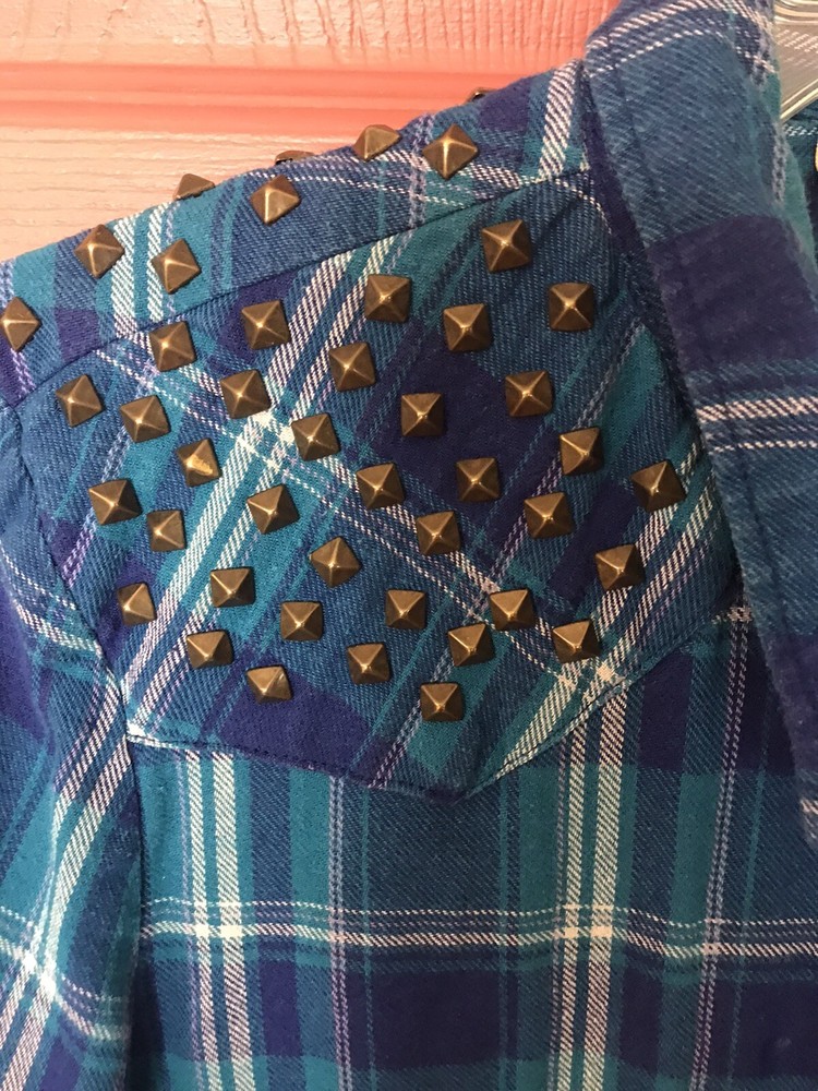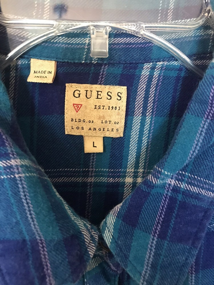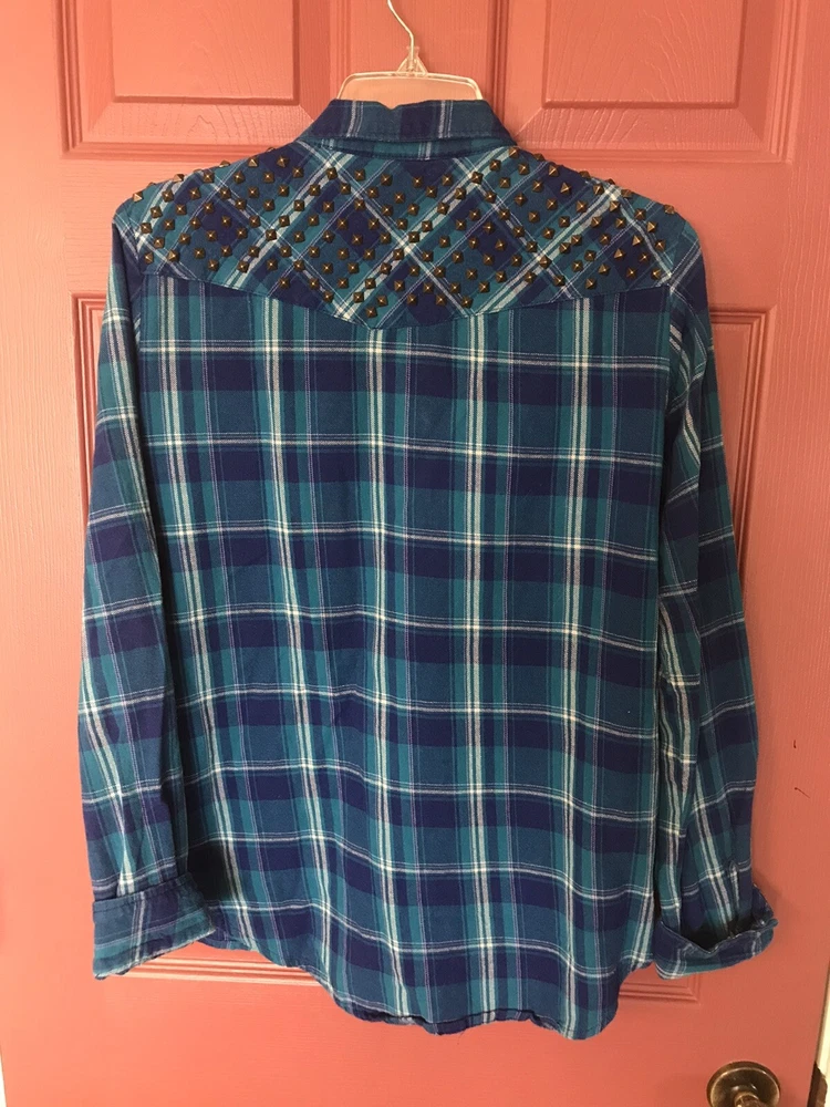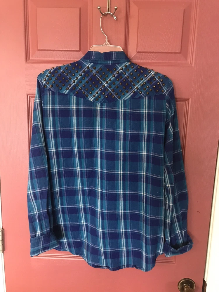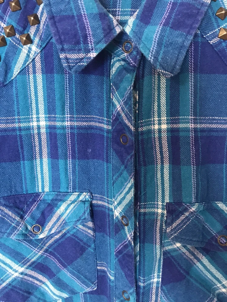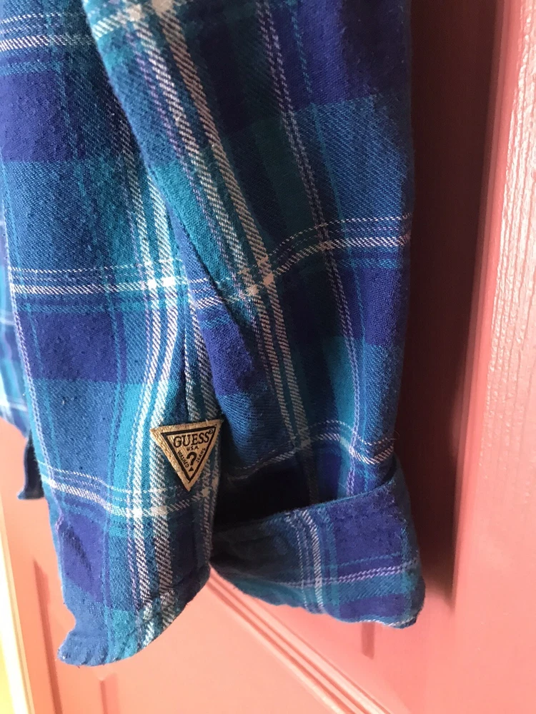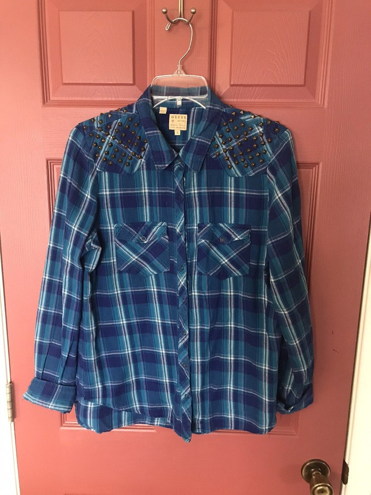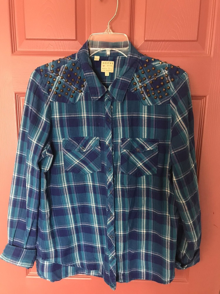 Great condition Guess snap up top. Blue plaid with gold studded shoulders. Pockets at chest level with flap and snap closure. Logo tag on bottom front left.
