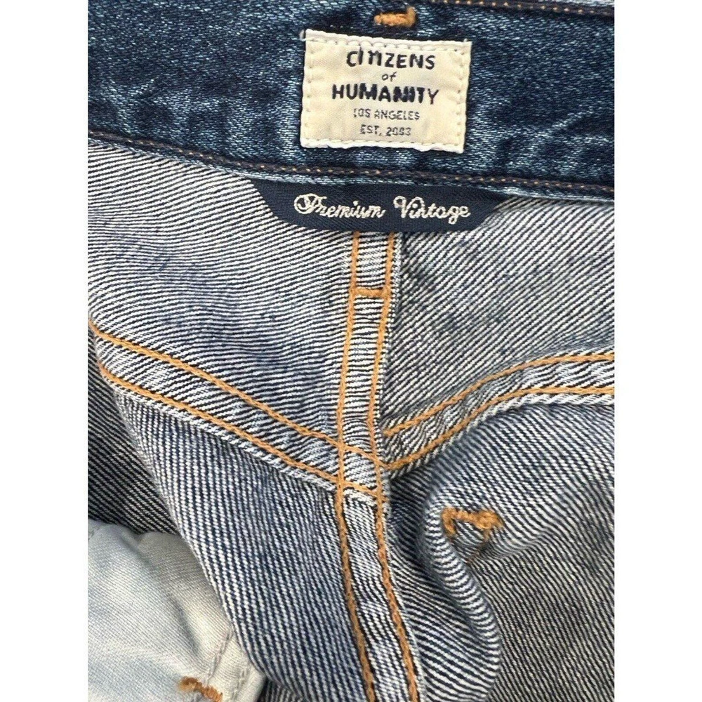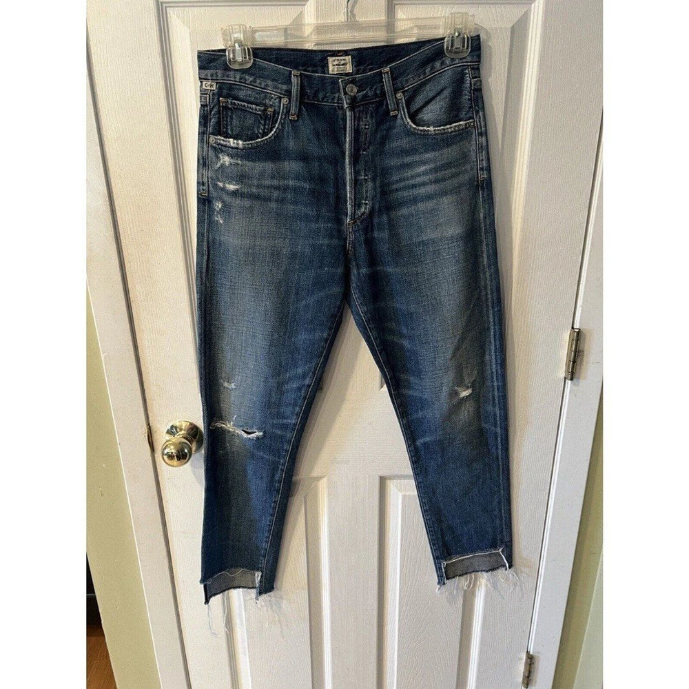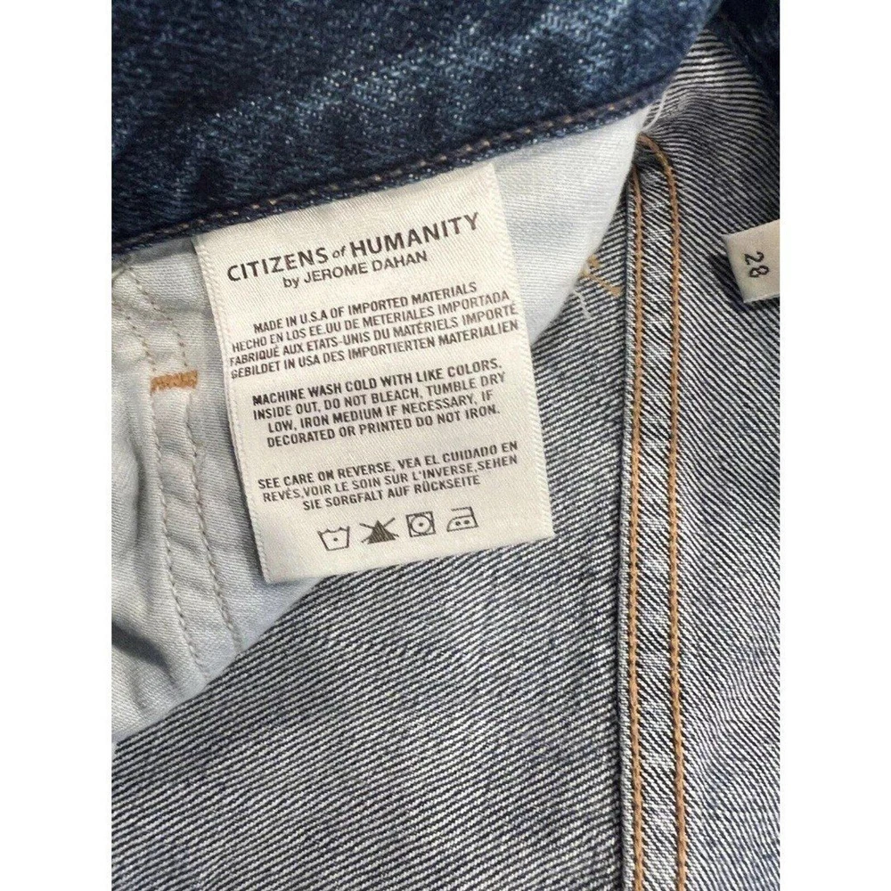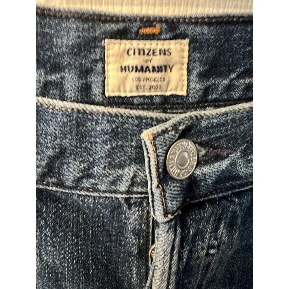 Its all in the details with these Liya in Trouble Maker jeans from Citizens of Humanity. Aside from their high rise, classic vintage fit, these jeans also lend a unique raw hi low step ankle hem and distressed details, giving them some unexpected edge thatll make any ensemble pop. 77% cotton / 23% rayon (non stretch) Button fly Front whiskering and fading Destroyed detailing throughout Hi-lo step raw cut hem Approximate measurements: Waist laying flat 16 Hips 21 Rise 11 Inseam 27