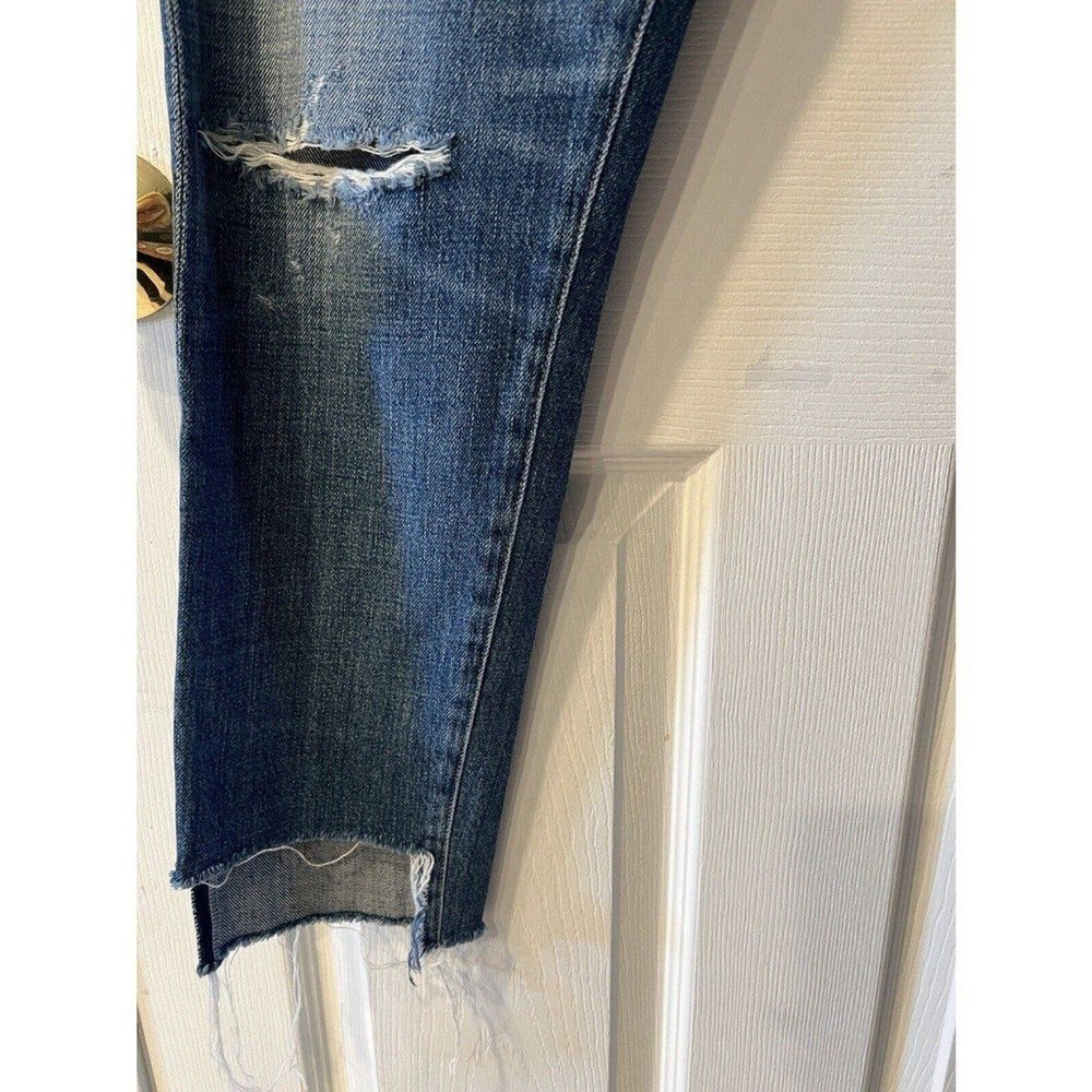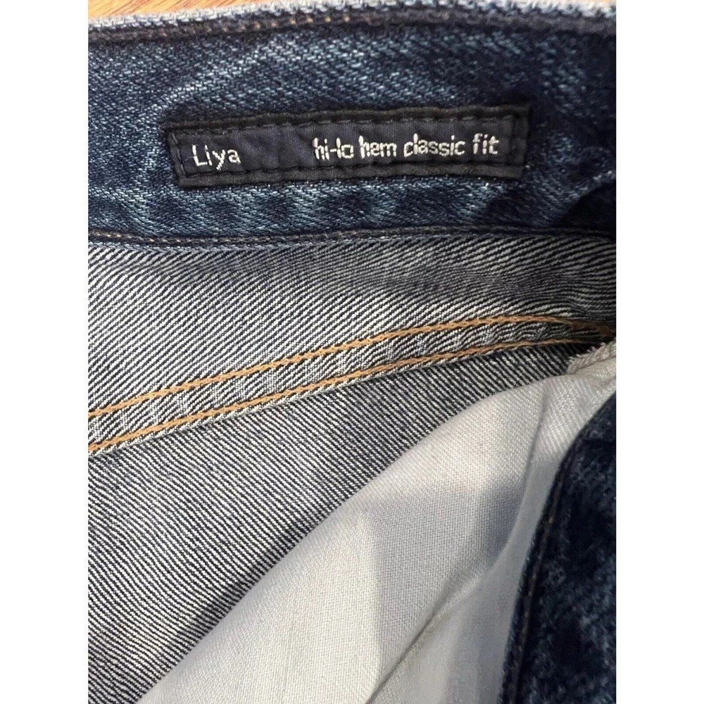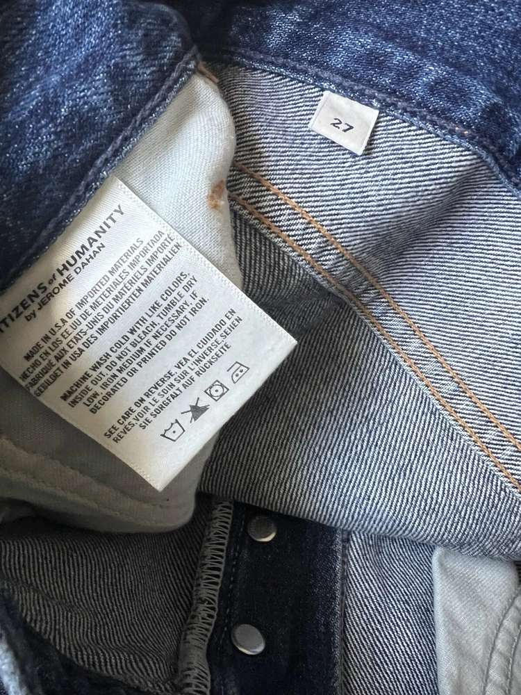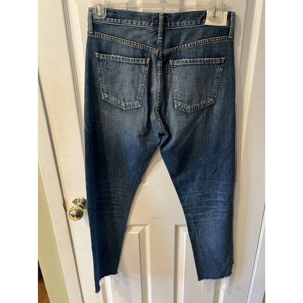 Its all in the details with these Liya in Trouble Maker jeans from Citizens of Humanity. Aside from their high rise, classic vintage fit, these jeans also lend a unique raw hi low step ankle hem and distressed details, giving them some unexpected edge thatll make any ensemble pop. 77% cotton / 23% rayon (non stretch) Button fly Front whiskering and fading Destroyed detailing throughout Hi-lo step raw cut hem Approximate measurements: Waist laying flat 16 Hips 21 Rise 11 Inseam 27