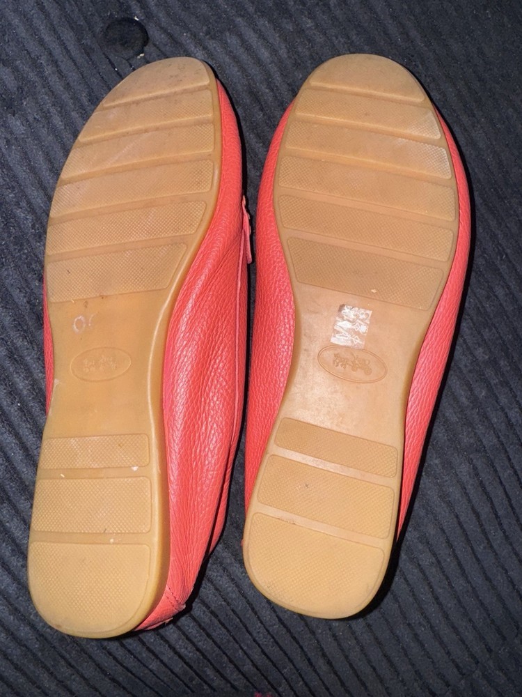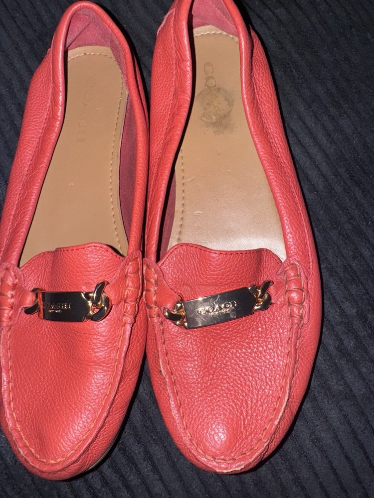 These Women's Coach Red Leather Bit-Detail Loafers in size 9 are a stylish and versatile addition to any wardrobe. Made with high-quality leather, these slip-on loafers feature a solid red color and intricate bit detailing, adding a touch of sophistication to a casual outfit. The comfortable B width and flat design make them perfect for all-day wear, while the Coach Signature product line ensures both quality and style. Whether it's for a summer picnic, fall outing, or spring dinner, these loafers are a chic choice for any season.
