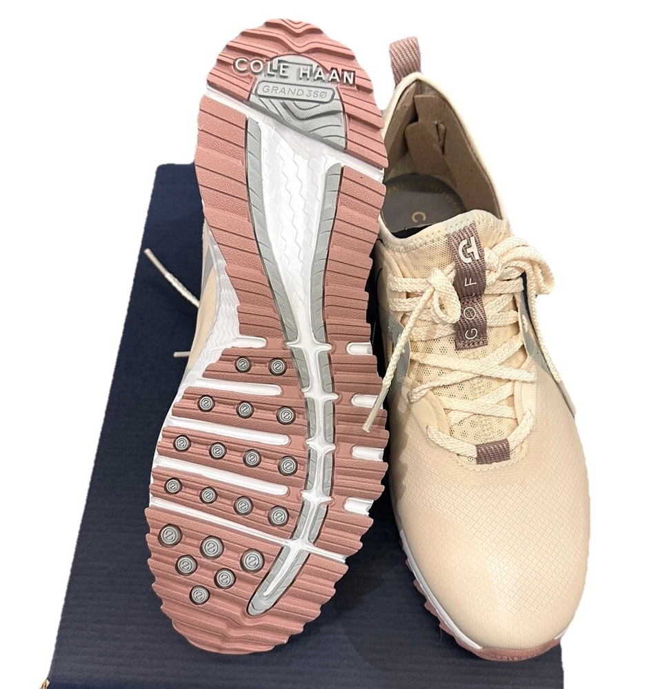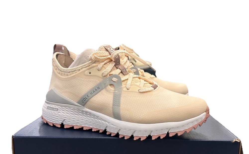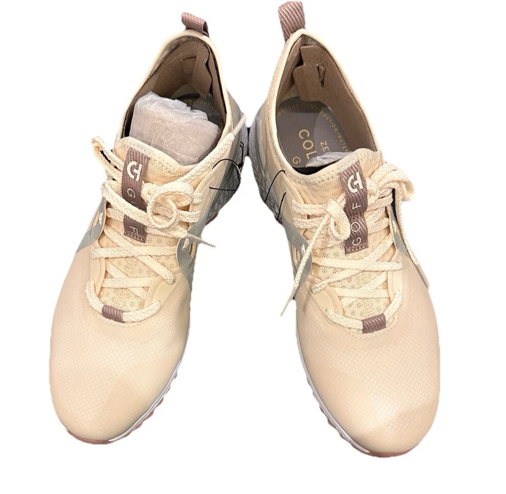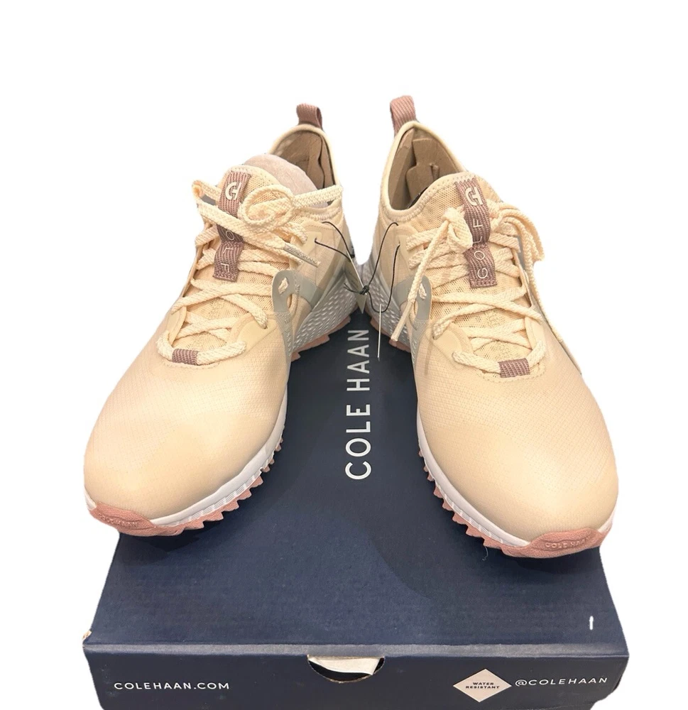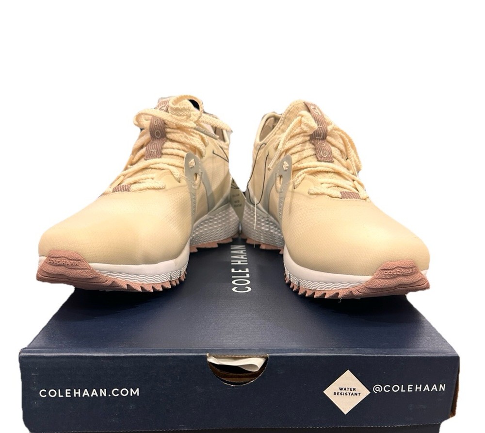 This women's Cole Haan GrandPrø golf shoe in Ivory/Fawn/White features a lace-up closure, waterproof design, and water-resistant features. With a mid-top shoe shaft style, rubber outsole, and synthetic upper material, it offers comfort and style for various occasions. The shoe is part of the Cole Haan Zerogrand product line and is designed for athletic performance, specifically for golf.