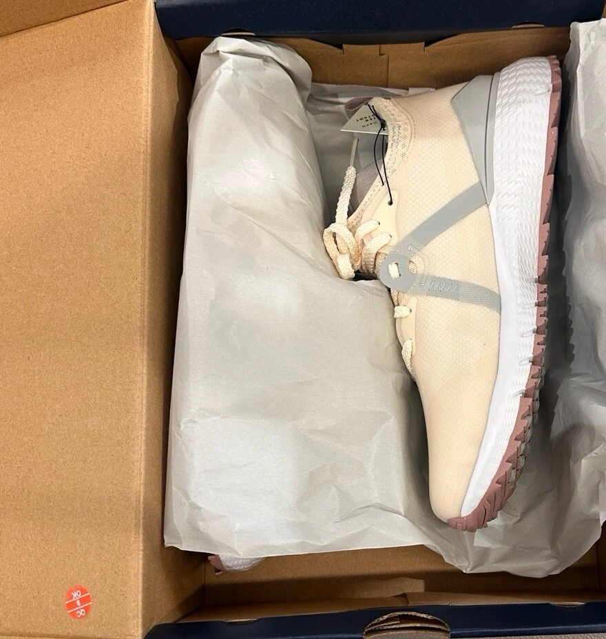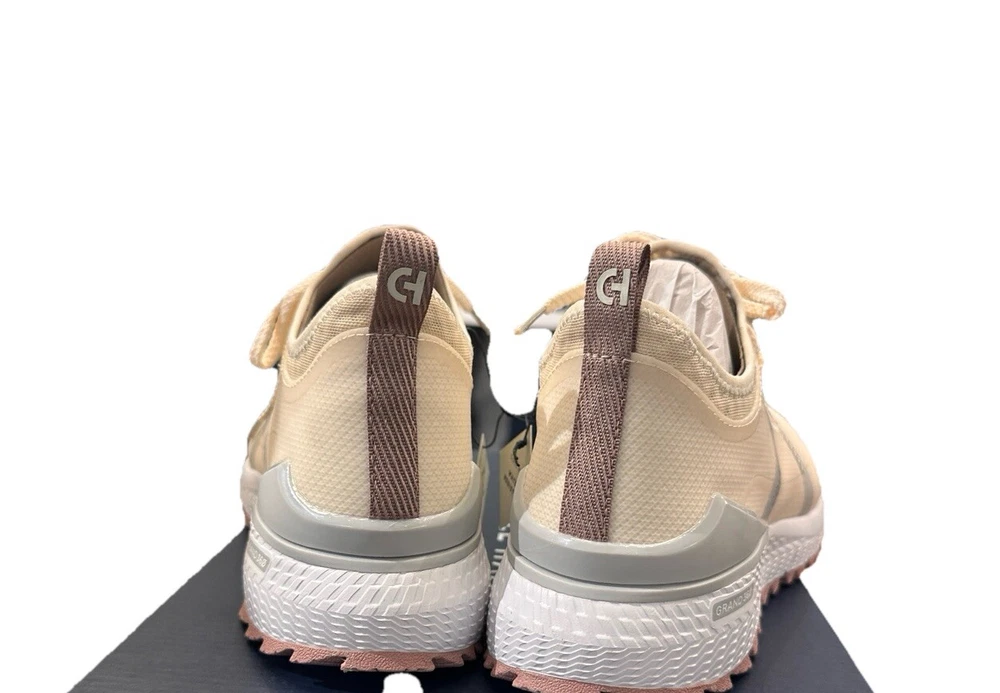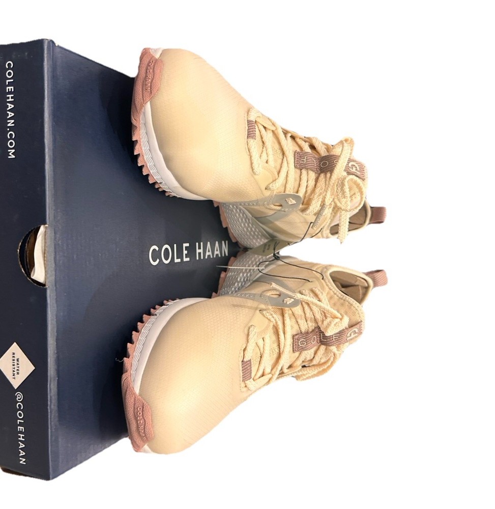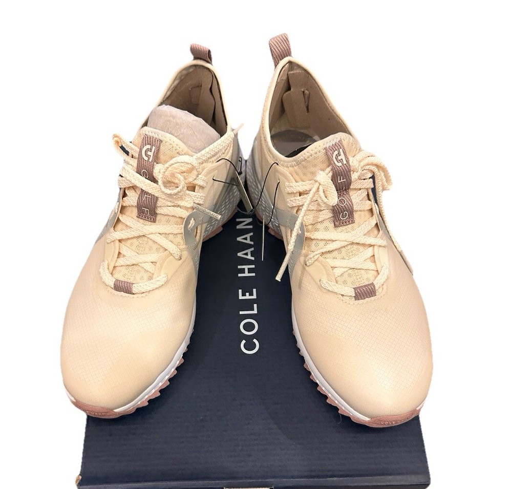 This women's Cole Haan GrandPrø golf shoe in Ivory/Fawn/White features a lace-up closure, waterproof design, and water-resistant features. With a mid-top shoe shaft style, rubber outsole, and synthetic upper material, it offers comfort and style for various occasions. The shoe is part of the Cole Haan Zerogrand product line and is designed for athletic performance, specifically for golf.