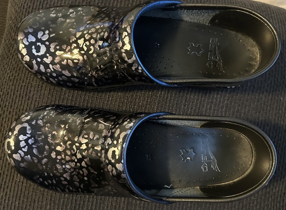 No major flaws if any ! They are in great condition , super comfortable ! These women's DANSKO Professional clogs are stylish and comfortable in a pewter leopard patent leather design, perfect for sizes 6.5-7. Featuring a round toe shape, slip-on closure, and low block heel, they are ideal for casual wear, work, or travel. The clogs are made with slip-resistant rubber outsoles, breathable leather lining, and a leather insole for added comfort. With a modern animal print pattern and Dansko logo accents, these clogs are a versatile choice for any season or occasion.