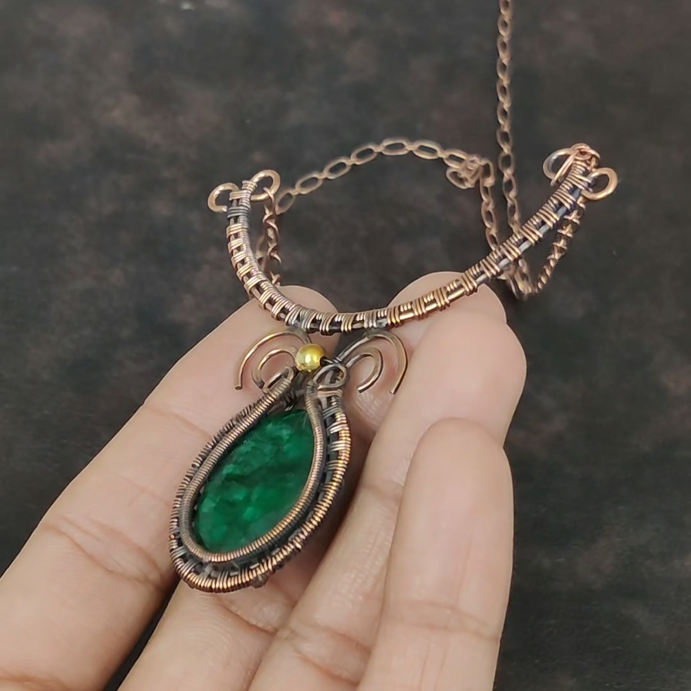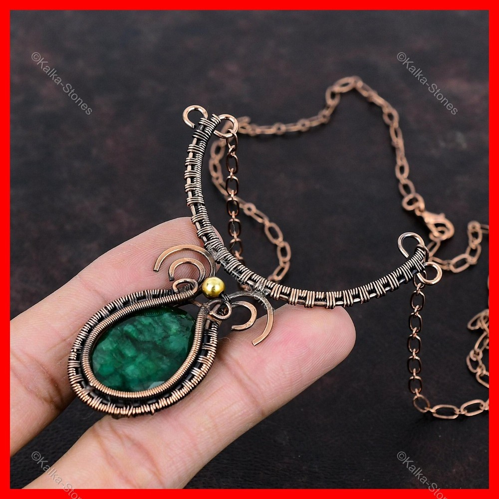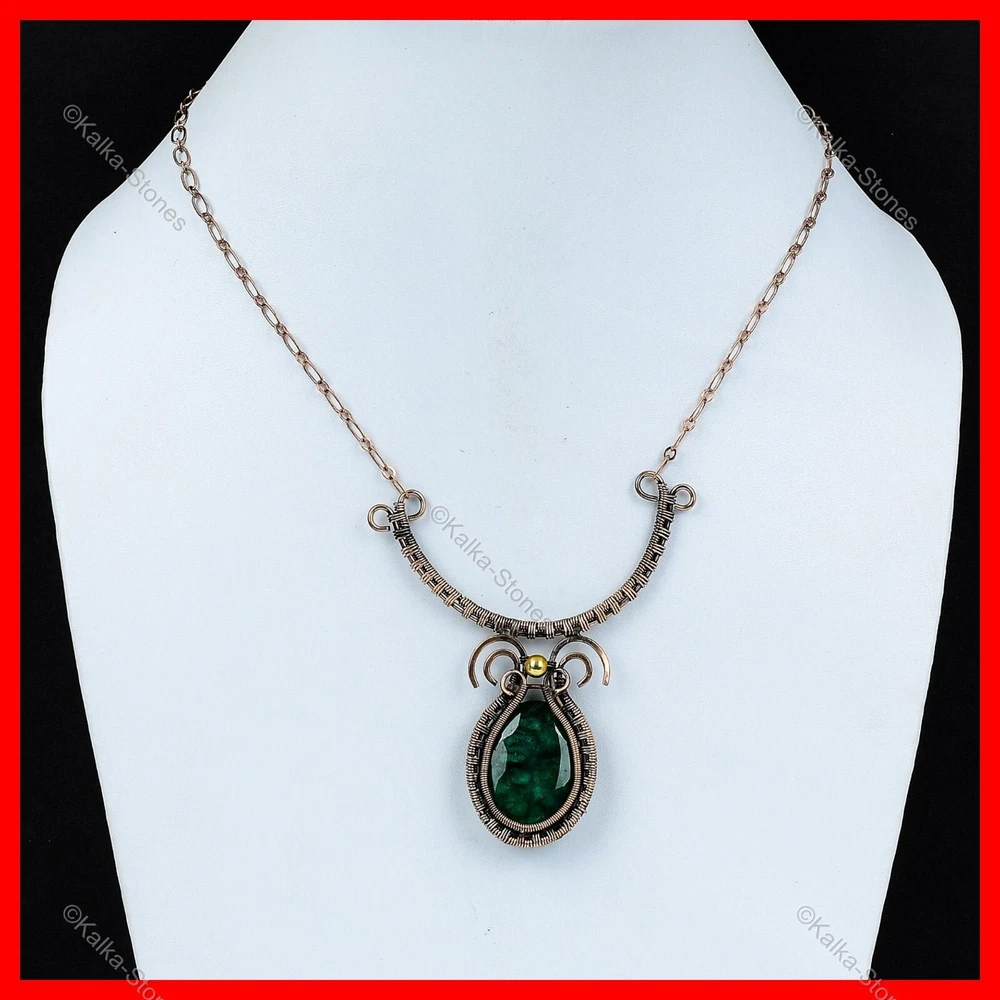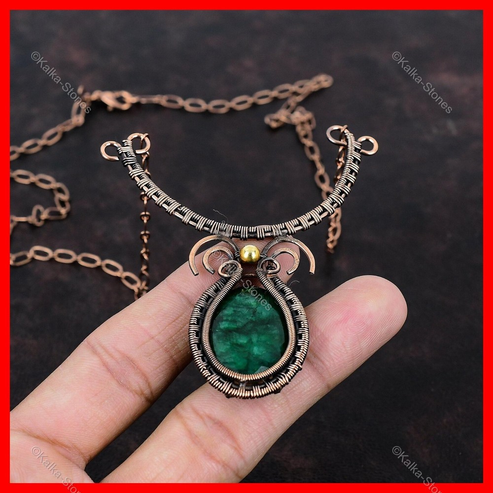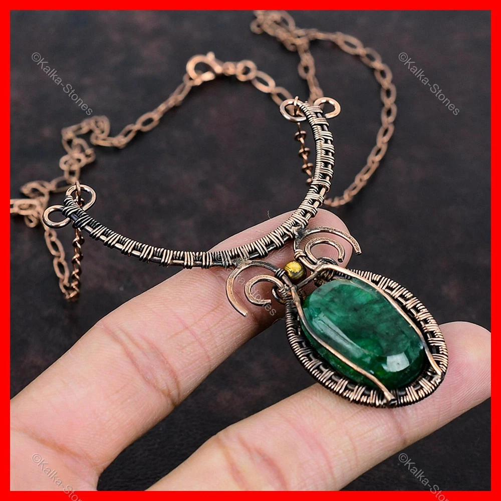 Note : Due to the natural formation of this gemstone. Slight variation in design and color are to be expected. Welcome to Kalka Stones Womens day Sale Copper Oval Zambian Emerald Stone Wife Wire Wrapped New Necklace Handmade Necklace, Wire Wrapped Necklace, Wire Wrapped Jewelry, Copper Pendant, Copper Wire Necklace, Wrapped Jewelry, Wire Wrap Necklace, Wire Wrap Jewelry SKU : VFWN-56 Gemstone : Zambian Emerald Stone Shape : Oval Metal Purity : Unknown Copper Length : 18 Inches Width : Inches Copper has been used for jewelry making for thousands of years, dating back to ancient civilizations such as the Egyptians, Romans, and Aztecs. Copper was valued for its beauty, versatility, and durability, and was often used to make everything from jewelry and coins to cookware and tools. In addition to its historical significance, copper jewelry also offers several benefits. Copper is a natural conductor of heat and electricity, which makes it ideal for energy healing and therapeutic purposes. Wearing copper jewelry is believed to have various health benefits, such as improving circulation, reducing inflammation, and boosting the immune system. Some people also believe that copper jewelry has the ability to balance energy and improve mood. For Mother's Day Gift For Father's Day Gift For Promise For Valentine's Day For Halloween Party For Christmas Day Gift For New Year Party For Mom For Her If you can't find the information you need or need some advice for your design? Feel free to contact us. We are fast to reply :) All our work is made by hand with Love and Care in our workshop Thank you so much for visiting and hope you enjoy shopping with us Kalka Stones is committed to delivering the best quality jewelry to customers. As a handmade jewelry manufacturer, we offer an extensive selection of copper gemstone jewelry that showcases the brilliance of our craftsmanship. We are an experienced handmade jewelry supplier with expertise in embellishing gemstones to suit every style. We offer you the liberty to create your jewelry ensemble with sparkling, earthy, and pure gemstones. Our Talented artisans masterfully handcraft each piece of jewelry you see here. Our pieces are made with genuine gemstones.