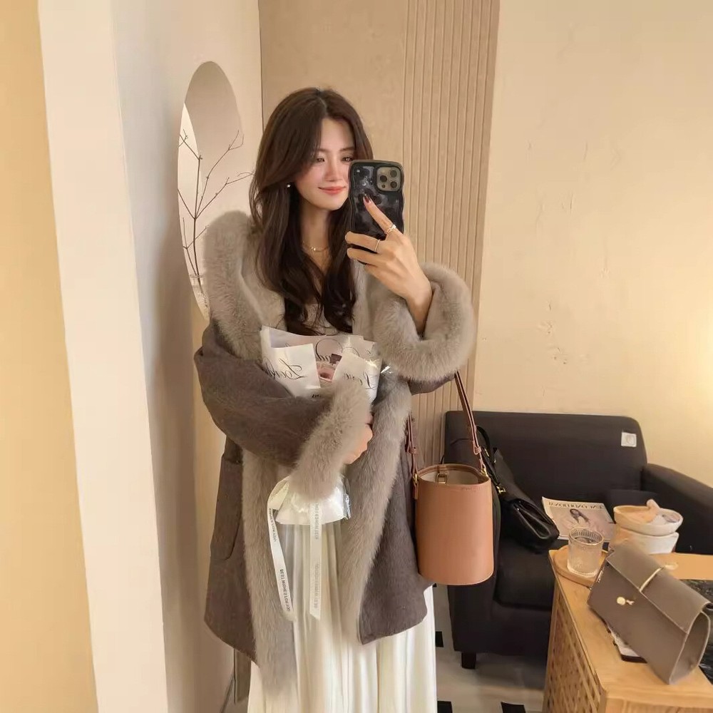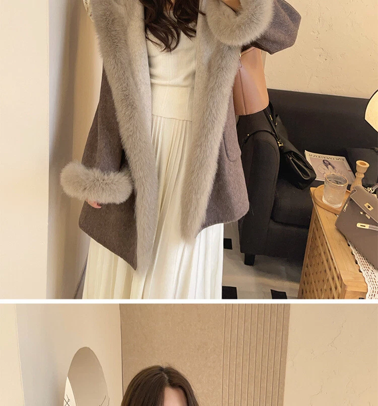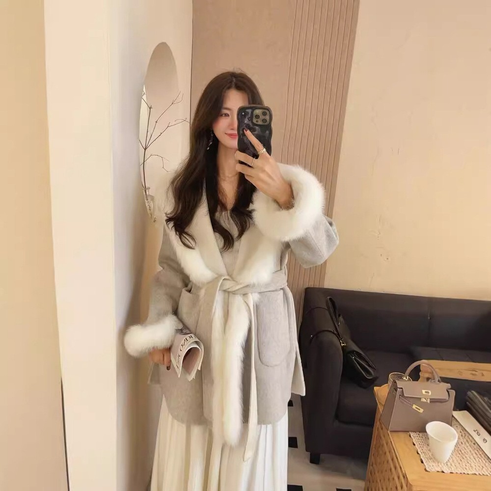 $ 80.8Women's Wool Cashmere Trench Coat with Fox Fur Trim Double-Sided Jacket