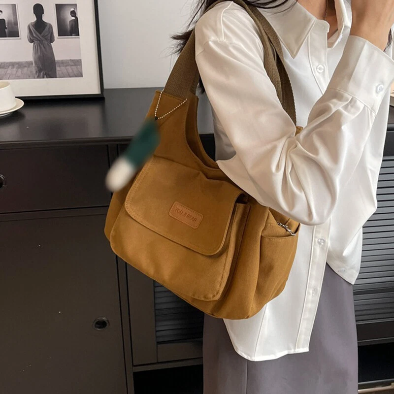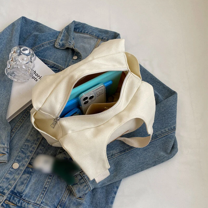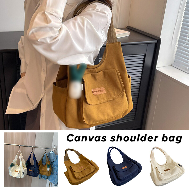 Color: Brown, Dark Blue, White Material: Canvas Bag style: Shoulder bag Lining: Polyester Opening method: Zipper Applicable scenarios: daily matching, commuting to work, students attending classes Package included:1 x Canvas Bag