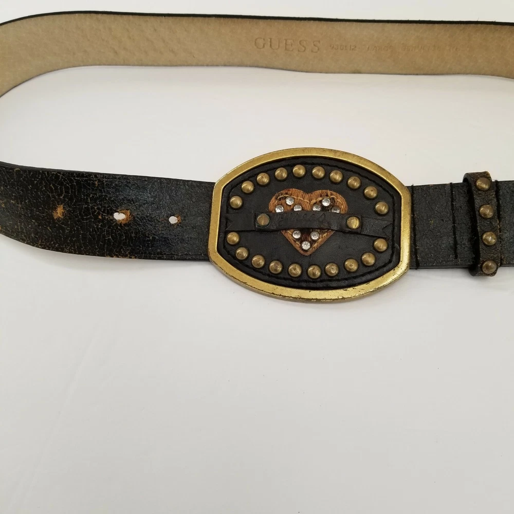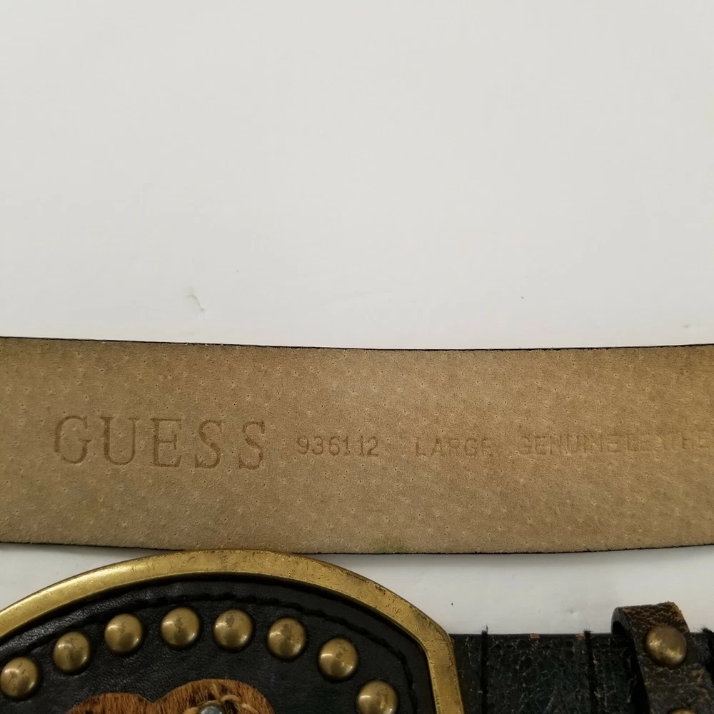 Guess Belt Women's Size Large Genuine Cracked Leather Belt 45 3/4 inch Long - Pre-Owned - Extra Hole Punched with Wear on 2 of the Holes, See Photo #4. Otherwise Belt is in Good Condition. - Measurement –Approximate Buckle to End - 45 3/4 in Width - 1 3/8 in - Any Season, Night Out, College, School, Everyday, Day Out, Shopping, Stylish, Chic, Trendy, Casual, Festive and Simple - Returns acceptable within 30 days of purchase unworn, in original condition - Check out my other listings. Lots of Choices Available. Reduced shipping for 2 or more items. Let me know when you've completed your shopping.