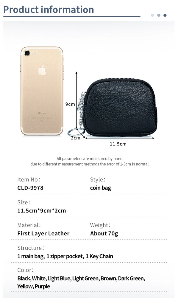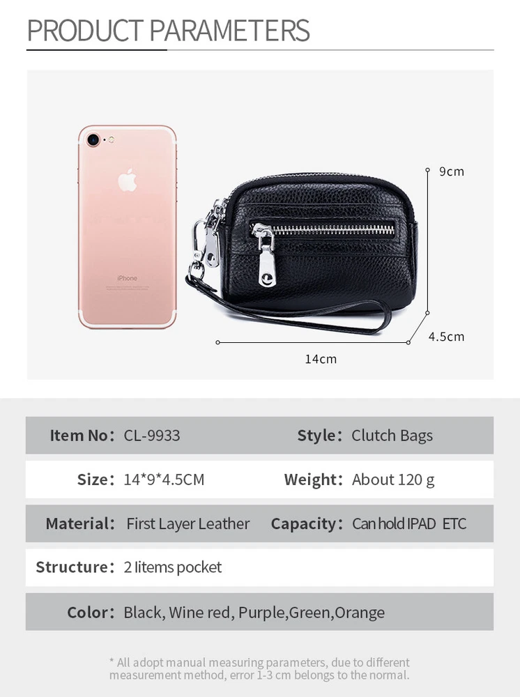 M ini wristlet wallet coin pouch with wristlet strap but large capacity. Simple & clean style. Package includes 1 bag and 1 wrist strap. Made of premium genuine cowhide leather material with polyester lining. It is durable and soft to touch. Small size but large capacity: Bag size 14 x 9 x 4.5cm . Wrist strap 6in in length. There are two big zipped compartments and a small one zipped pocket in the front. It provide enough rooms for your coins, cash, lipstick, driver's license, credit cards, key, etc. Package Include: 1 x Wallet