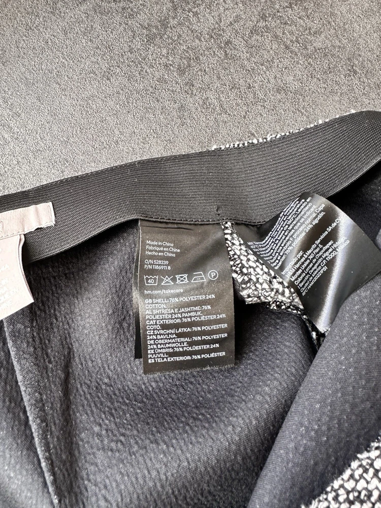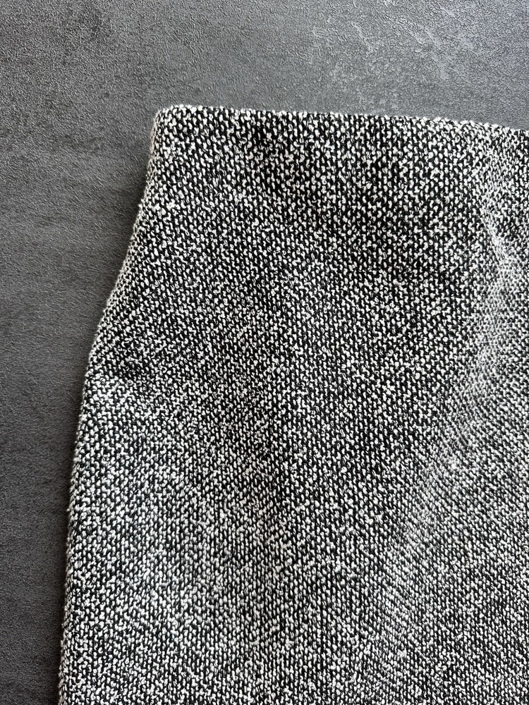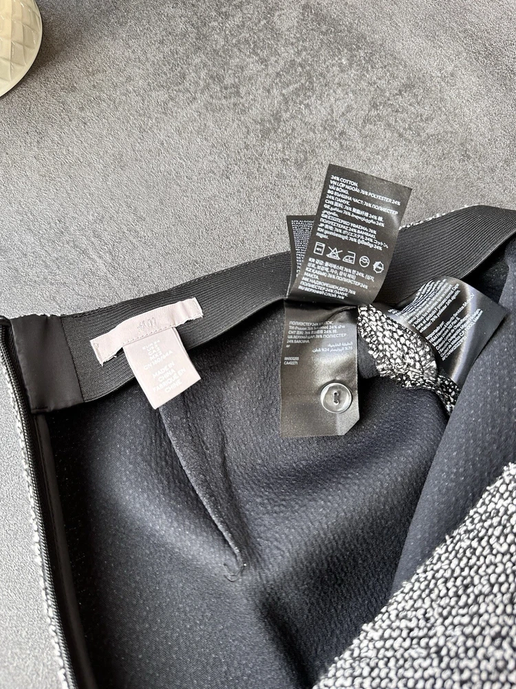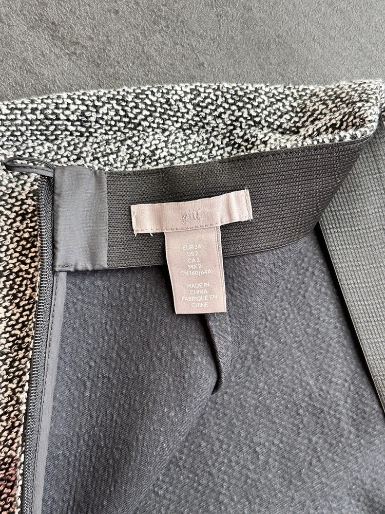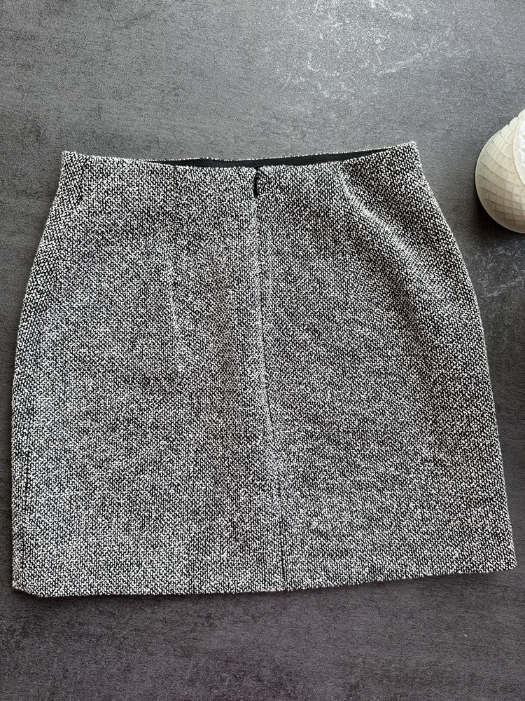 Women's Tweed Gray Mini Skirt by Zara. This is a short, mini skirt in size XS made of polyester and cotton. It has a zip closure and is suitable for party/cocktail or casual occasions. The skirt is designed in a tweed fabric, perfect for winter, summer, fall, and spring seasons.