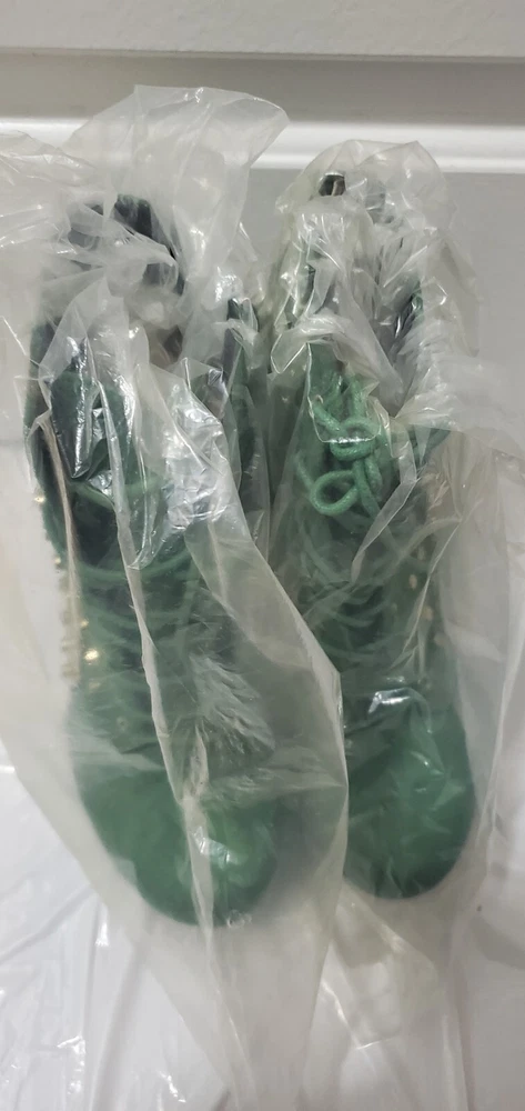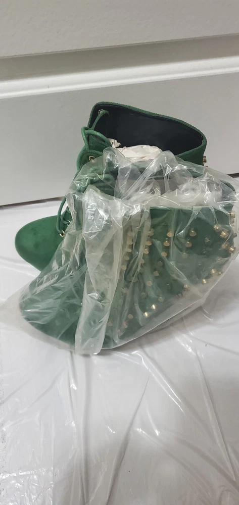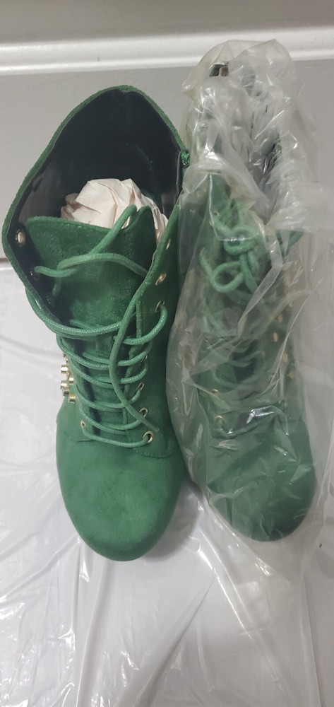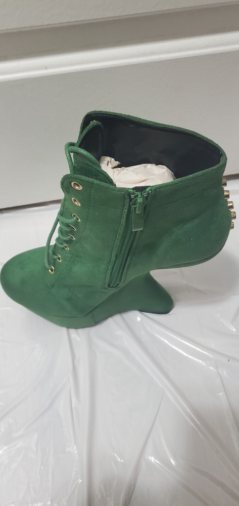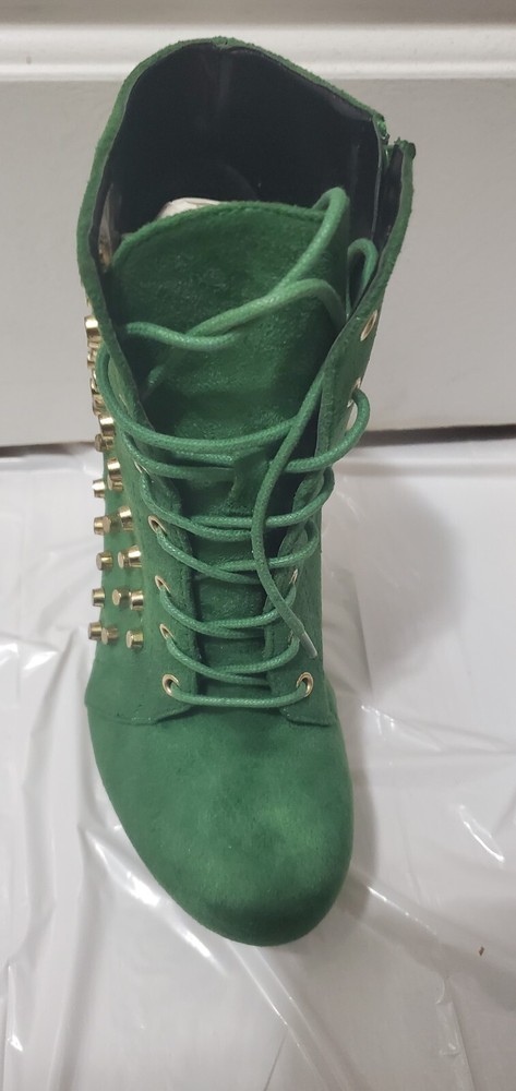This is a stylish green bootie in size 8 with a round toe shape and a mid heel height of 2-2.9 inches. The bootie features a unique blunt metal studded pattern and a gravity wedge heel style, giving it a trendy and edgy look. It has a zipper closure for easy wear and is suitable for various occasions such as travel, parties, or formal events. The bootie is made of faux suede material with a faux leather insole, providing comfort and durability. The studded anti gravity design adds a vintage touch to the overall metal-themed style of the shoe.