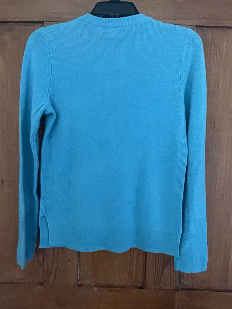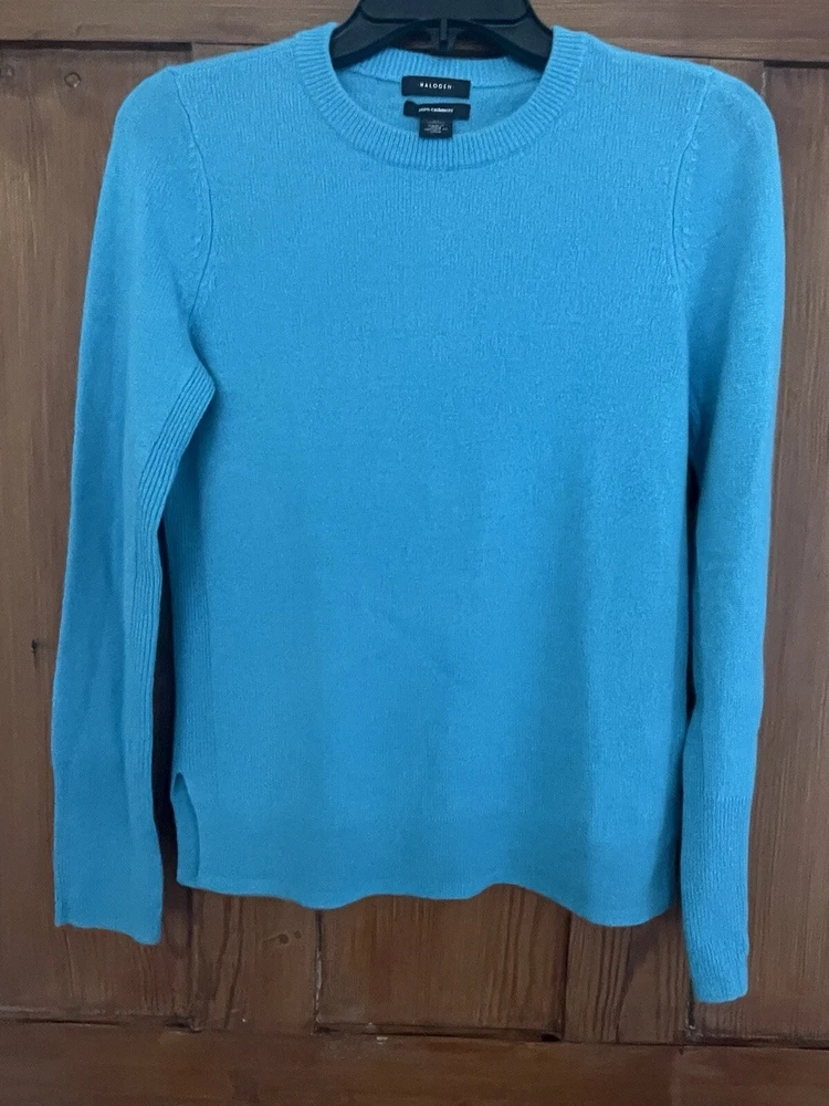 Beautiful turquoise blue cashmere sweater from Halogen. Size extra small. Crew neck. Long sleeves. Ribbed detail and hems. Vents at side seams. 100% cashmere. Dry clean. Mint condition. Pit to pit 18 inches Sleeve length from pit to hem 18 inches Back length from neck to hem 25 inches