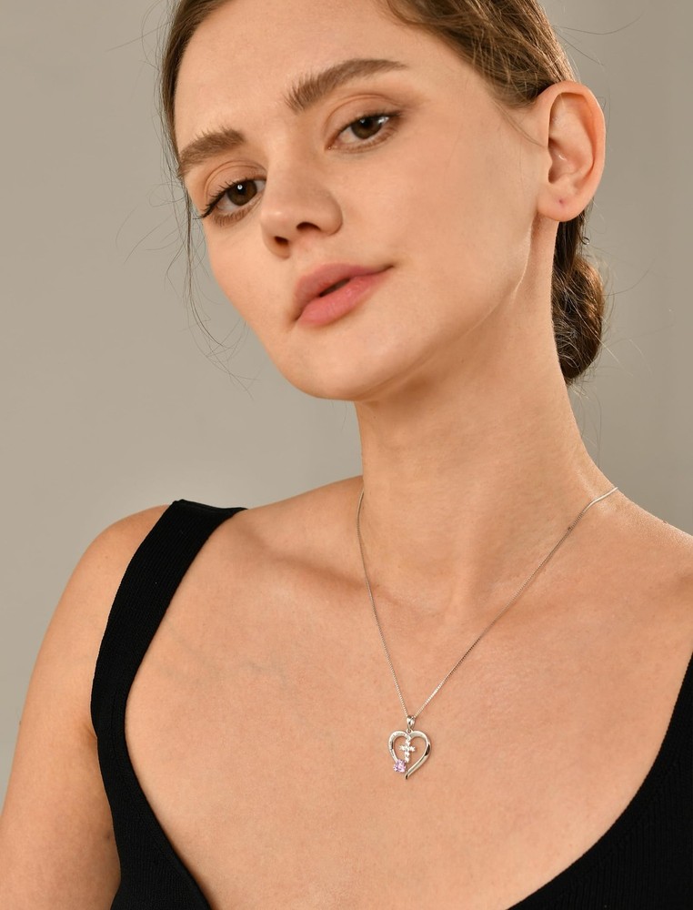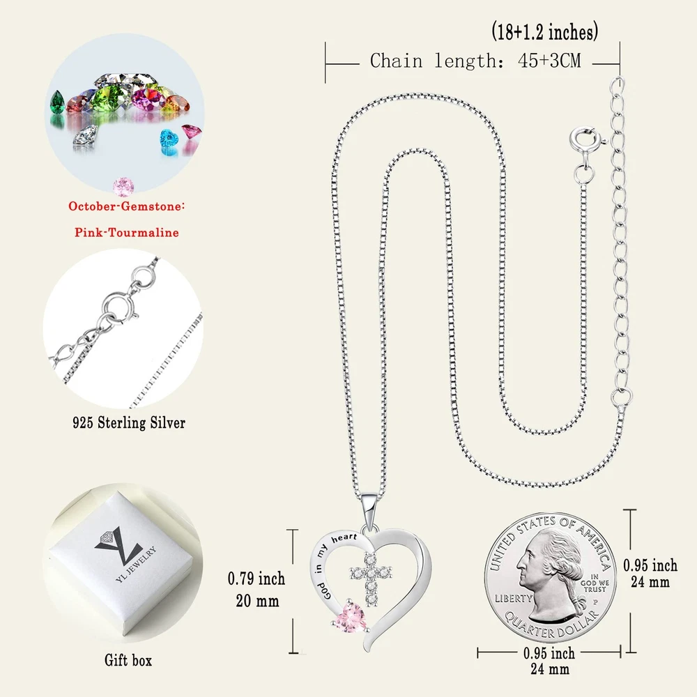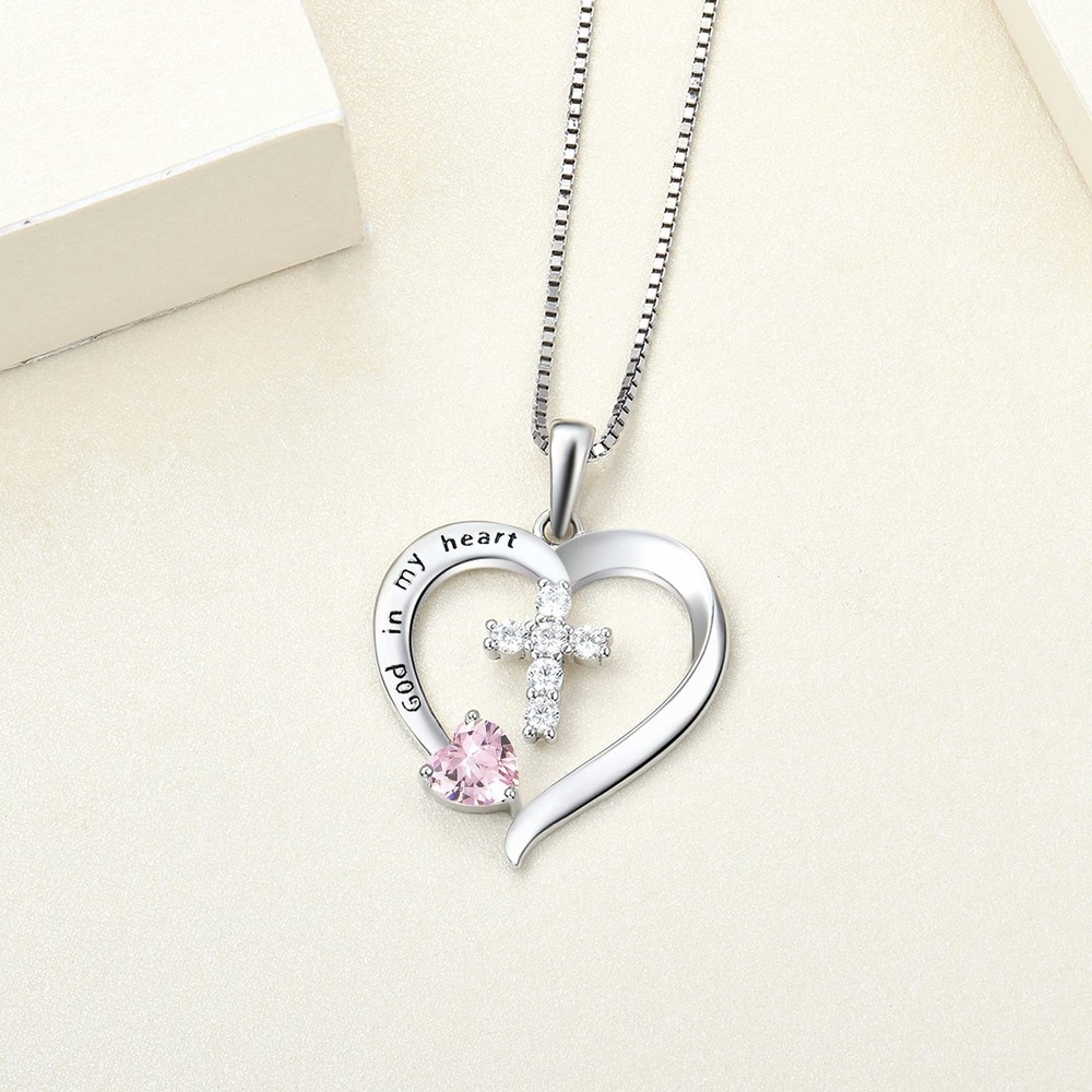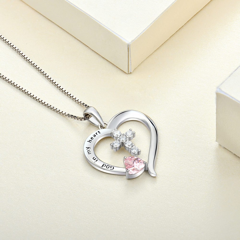 Women's Heart Cross Necklace 925 Sterling Silver Created Pink Tourmaline Pendant God in My Heart Jewelry Design: Cross jewelry symbolizes personality, confidence, and inner strength Material: 925 sterling silver with rhodium plated Size: Cross necklace high: 0.79" (20 mm), silver box chain: 18+1.2" (45+3 cm) Birthstone: Set with 5mm heart-cut created pink tourmaline Package: Come with jewelry box