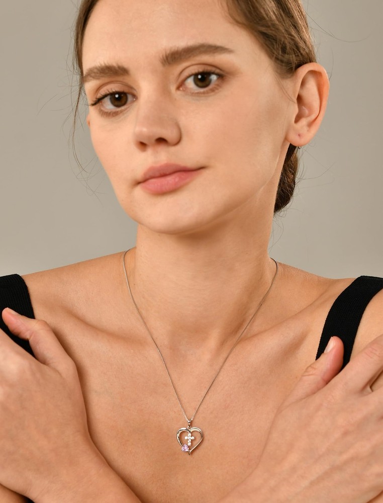 $ 10.45925 Sterling Silver Cross Feb Birthstone Necklace for Women Cross Rose Pendan...
