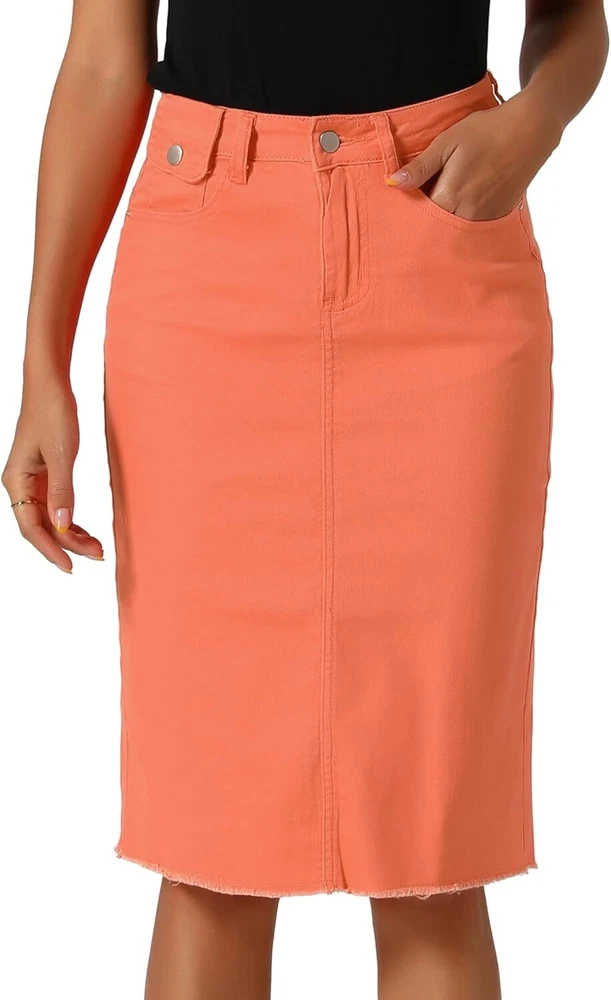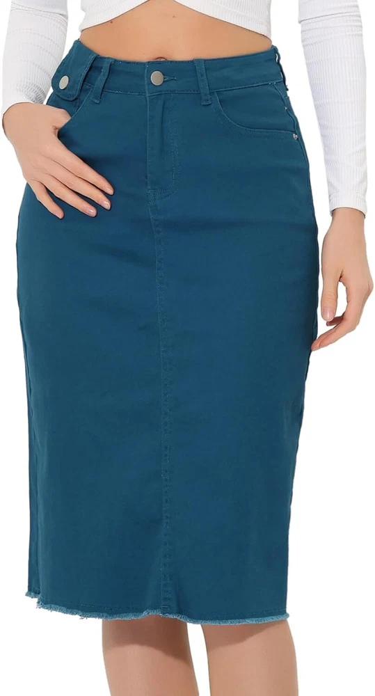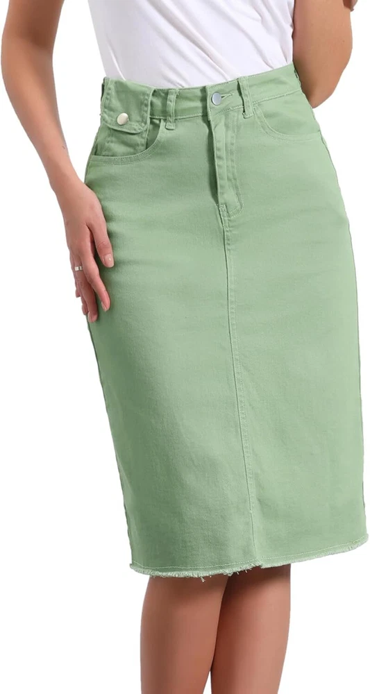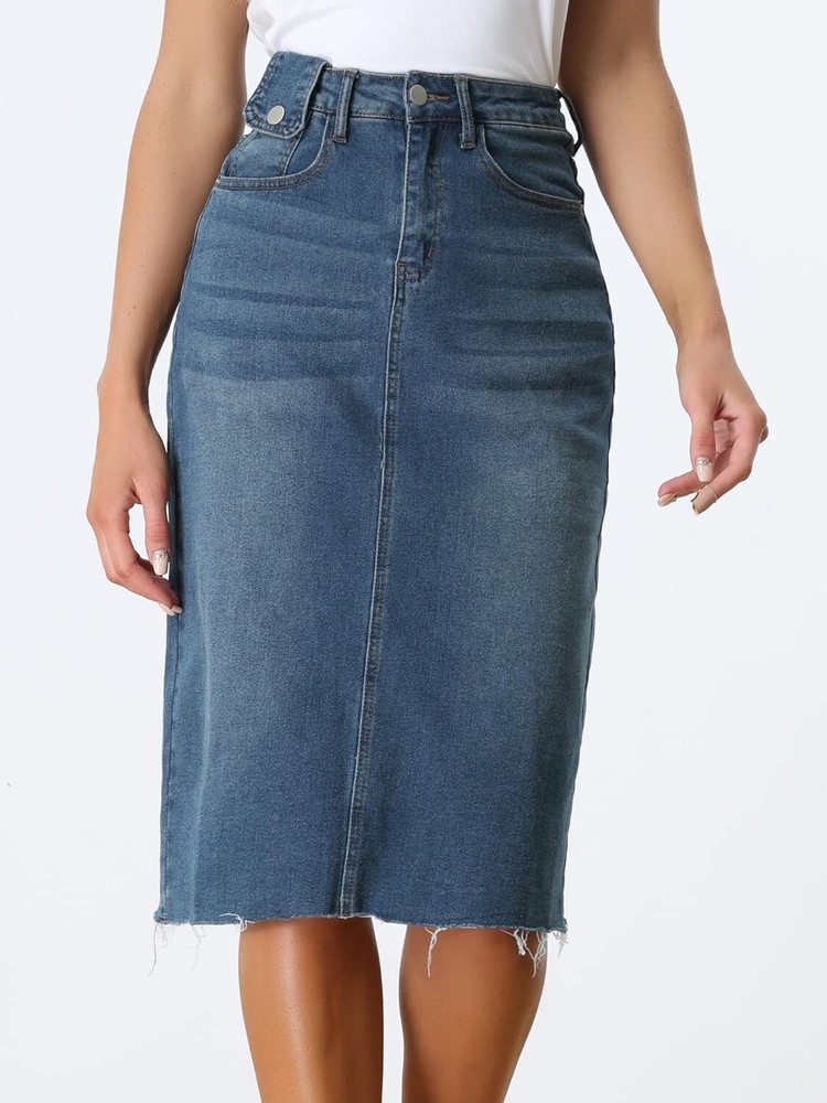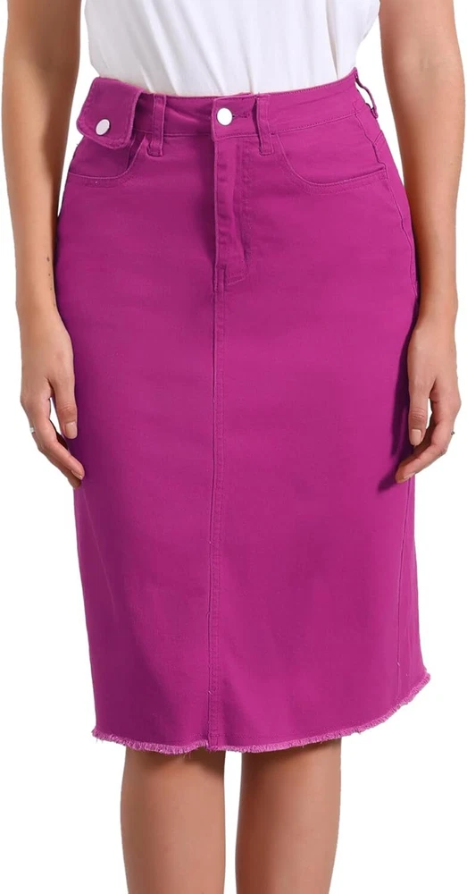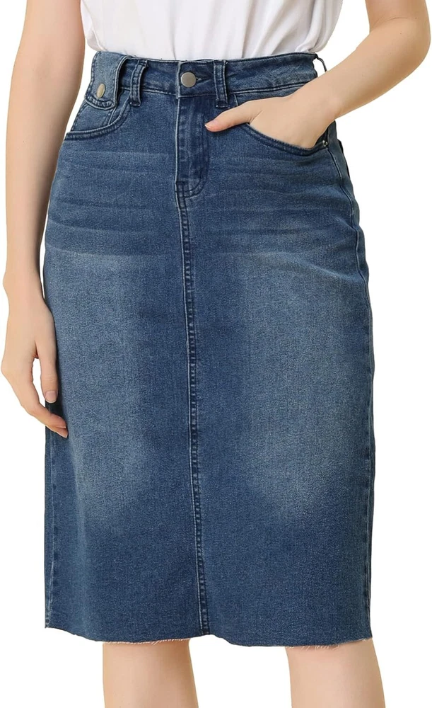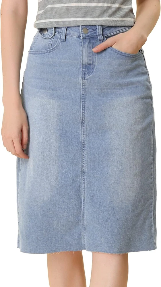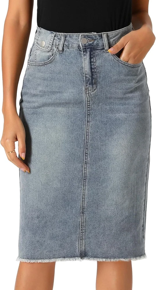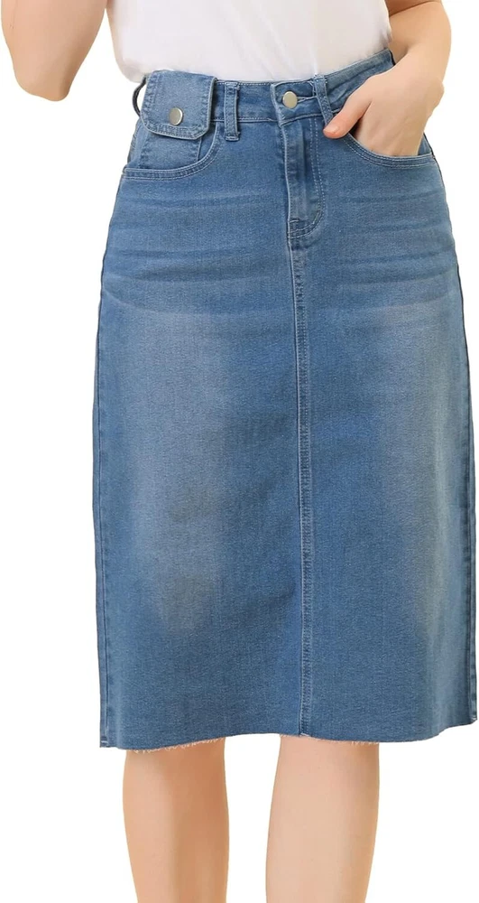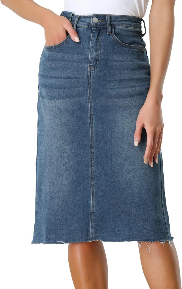 Product Description Allegra K Women's Jean Skirt Back Slit Raw Hems Denim Skirt Denim Skirt, An Essential Wardrobe Piece This Versatile Silhouette Pairs Well With Pretty Much Anything. The relax fit knee length jean skirts is suitable for dating, business, holiday and daily wear, etc. 1 Classic Jean Skirts 2 Various Color Skirts Detail of Women's Fashion Denim Jean Skirts, Stretchy & Excellent Breathable Perfect Match All Kinds Of Tops - Classic Never Goes Out Of Style What is the length of the skirt? The skirt would be pass my knees. If you higher than 5’7", it would be knee length. Is there any raw hem around the bottom? We have updated our skirt, the new version already with the raw hem. Is the skirt straight? No. It looks like a straight skirt, but the one I got is flared Skirt.