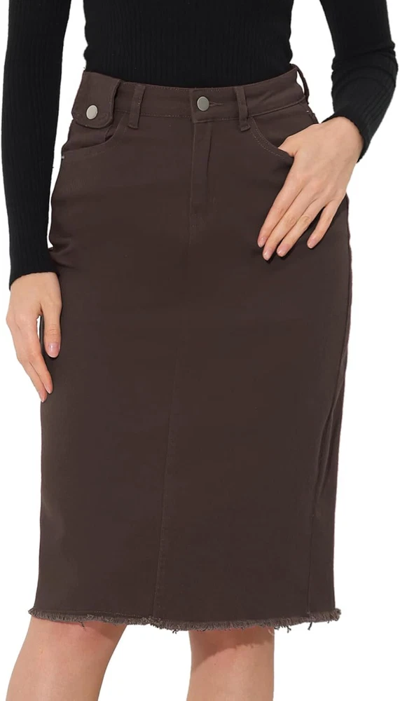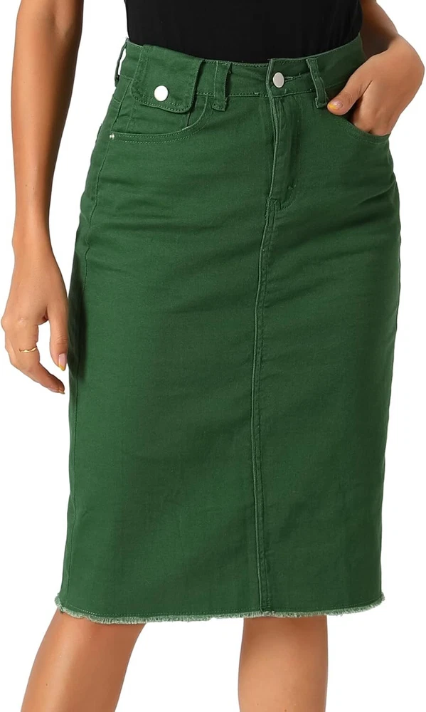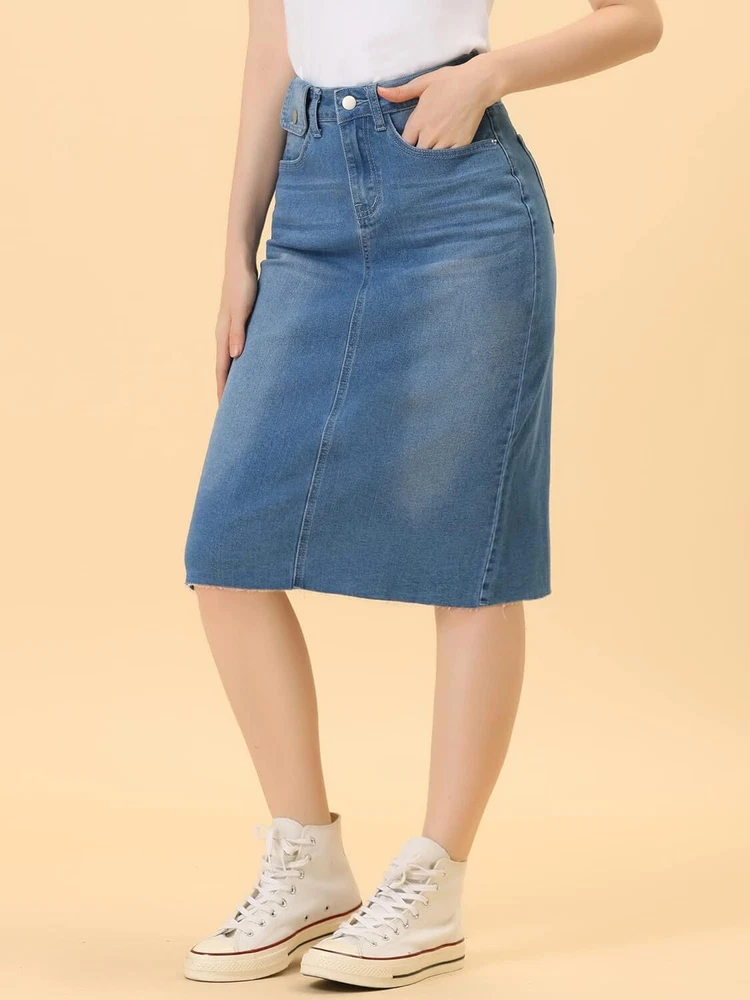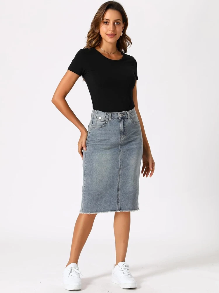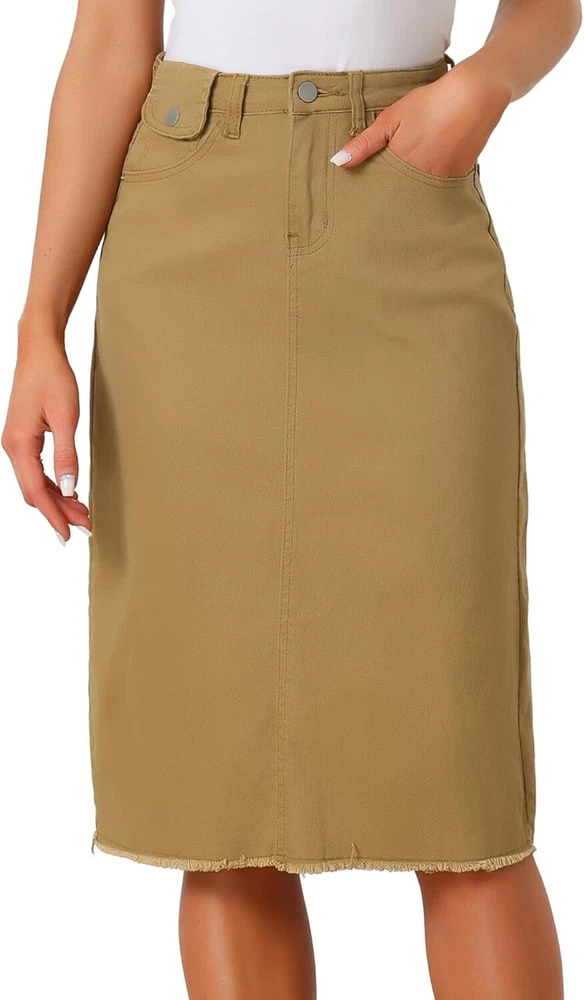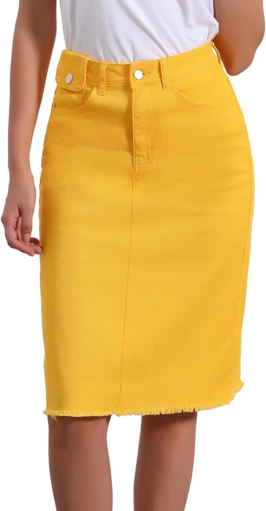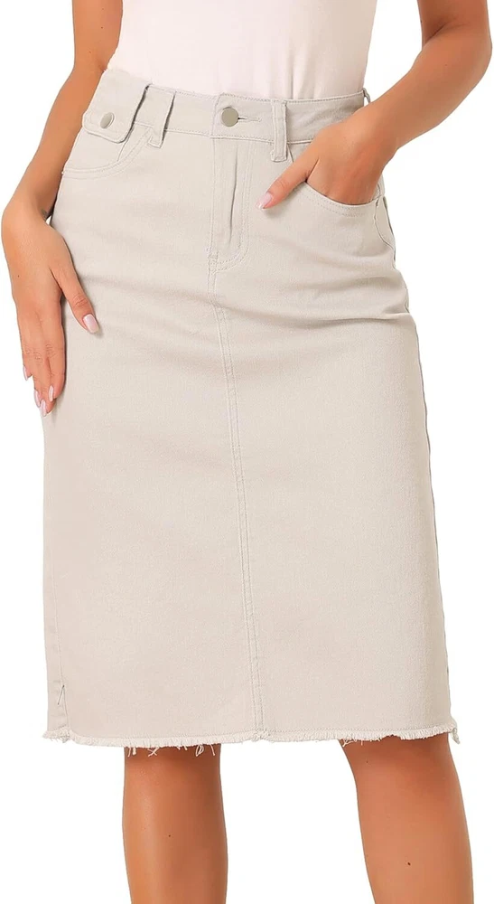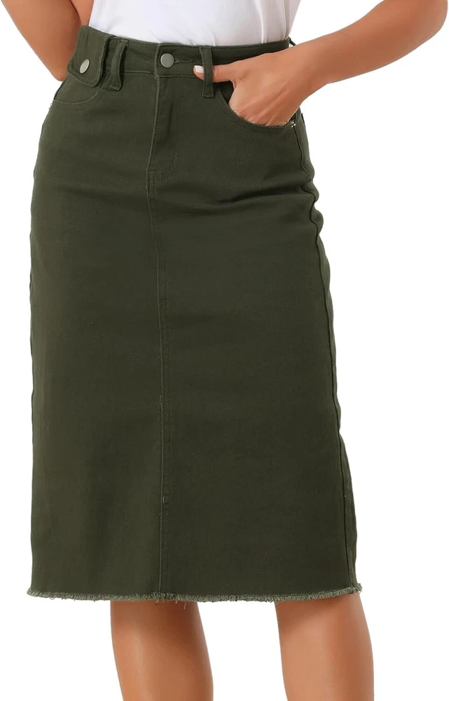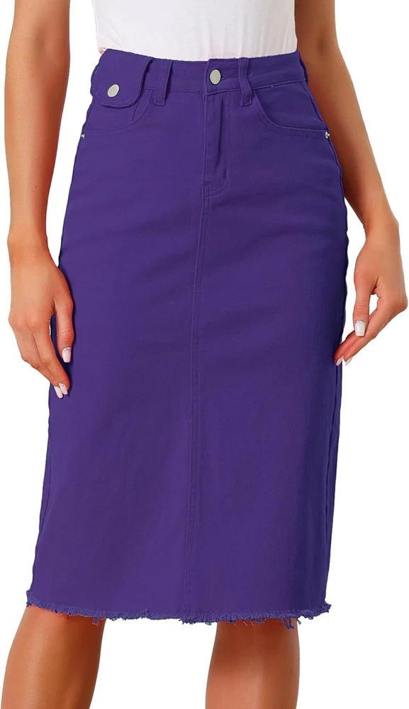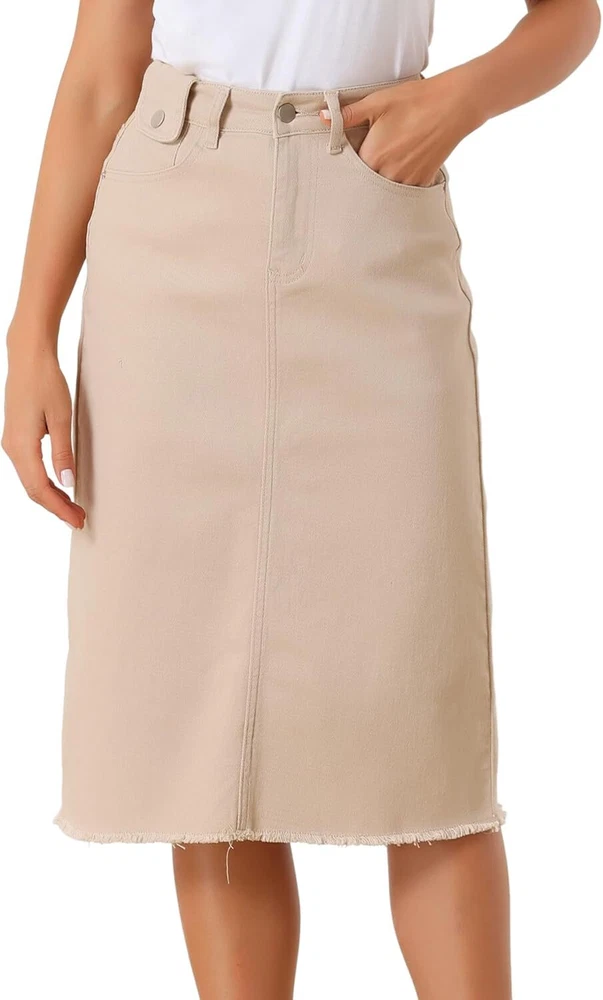 Product Description Allegra K Women's Jean Skirt Back Slit Raw Hems Denim Skirt Denim Skirt, An Essential Wardrobe Piece This Versatile Silhouette Pairs Well With Pretty Much Anything. The relax fit knee length jean skirts is suitable for dating, business, holiday and daily wear, etc. 1 Classic Jean Skirts 2 Various Color Skirts Detail of Women's Fashion Denim Jean Skirts, Stretchy & Excellent Breathable Perfect Match All Kinds Of Tops - Classic Never Goes Out Of Style What is the length of the skirt? The skirt would be pass my knees. If you higher than 5’7", it would be knee length. Is there any raw hem around the bottom? We have updated our skirt, the new version already with the raw hem. Is the skirt straight? No. It looks like a straight skirt, but the one I got is flared Skirt.