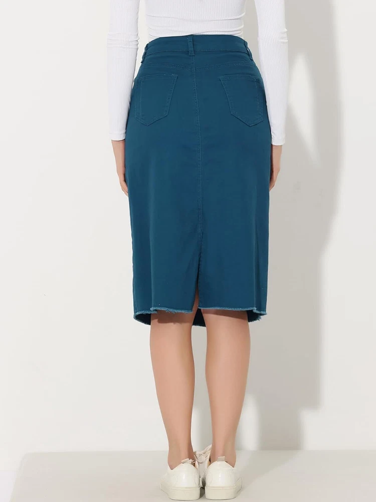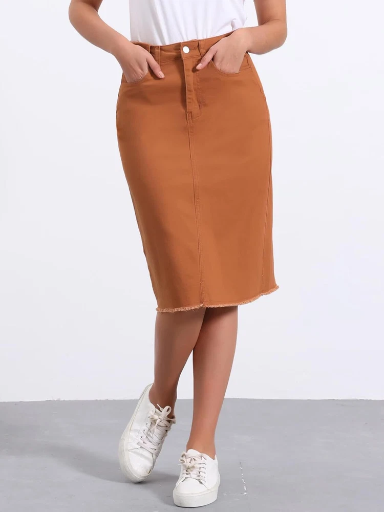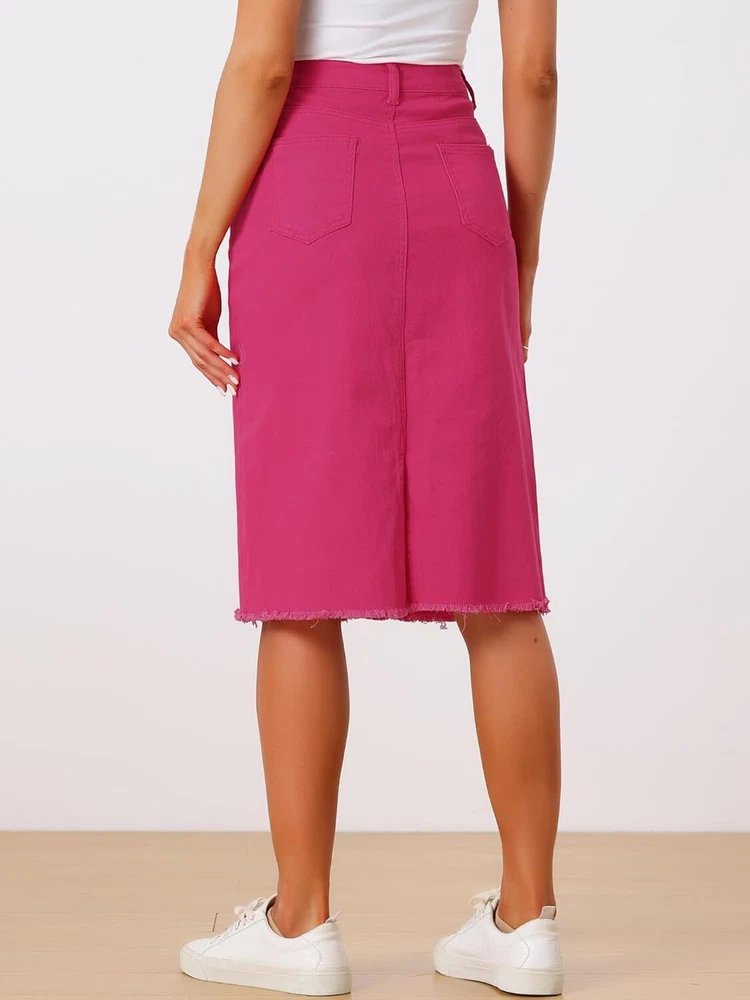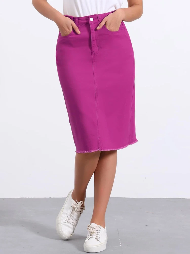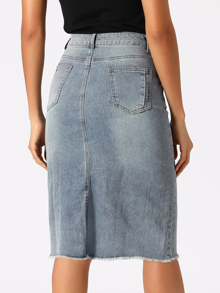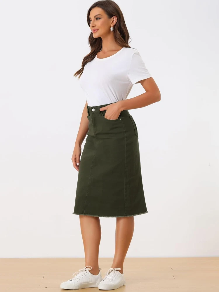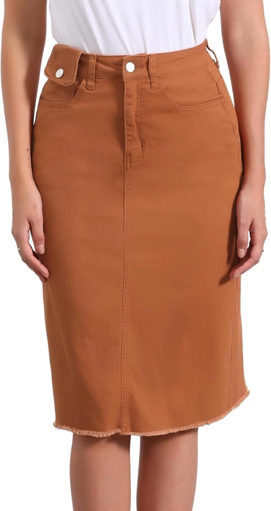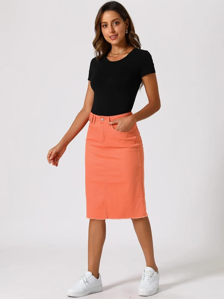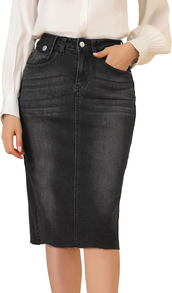 Product Description Allegra K Women's Jean Skirt Back Slit Raw Hems Denim Skirt Denim Skirt, An Essential Wardrobe Piece This Versatile Silhouette Pairs Well With Pretty Much Anything. The relax fit knee length jean skirts is suitable for dating, business, holiday and daily wear, etc. 1 Classic Jean Skirts 2 Various Color Skirts Detail of Women's Fashion Denim Jean Skirts, Stretchy & Excellent Breathable Perfect Match All Kinds Of Tops - Classic Never Goes Out Of Style What is the length of the skirt? The skirt would be pass my knees. If you higher than 5’7", it would be knee length. Is there any raw hem around the bottom? We have updated our skirt, the new version already with the raw hem. Is the skirt straight? No. It looks like a straight skirt, but the one I got is flared Skirt.