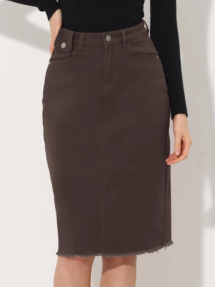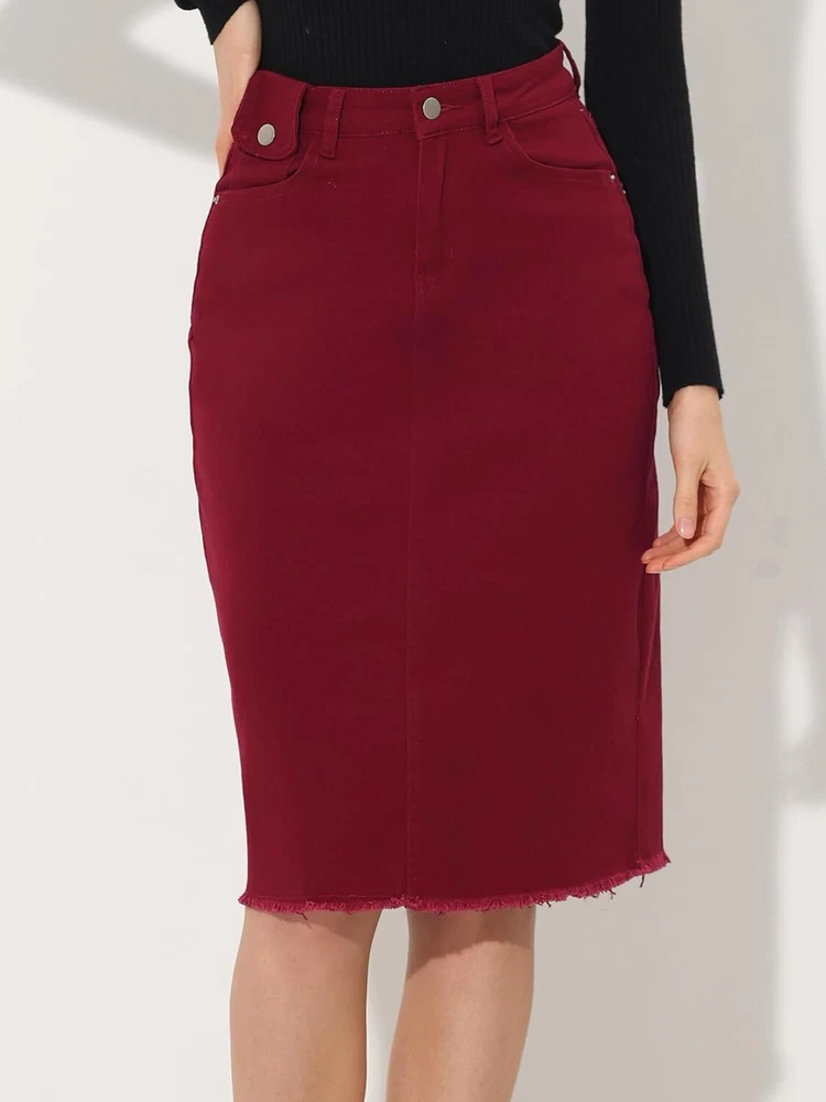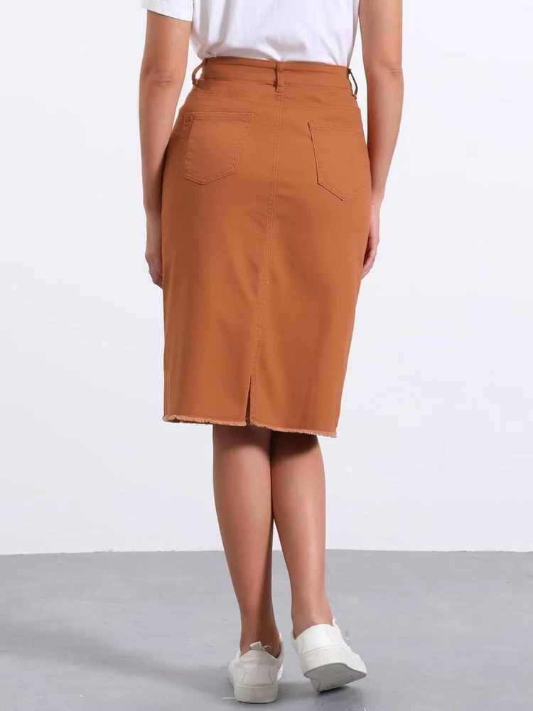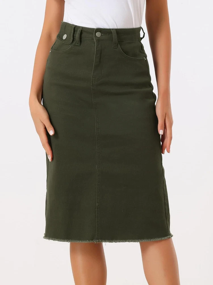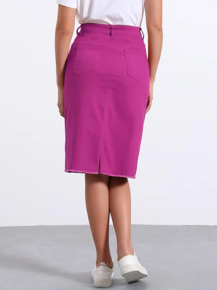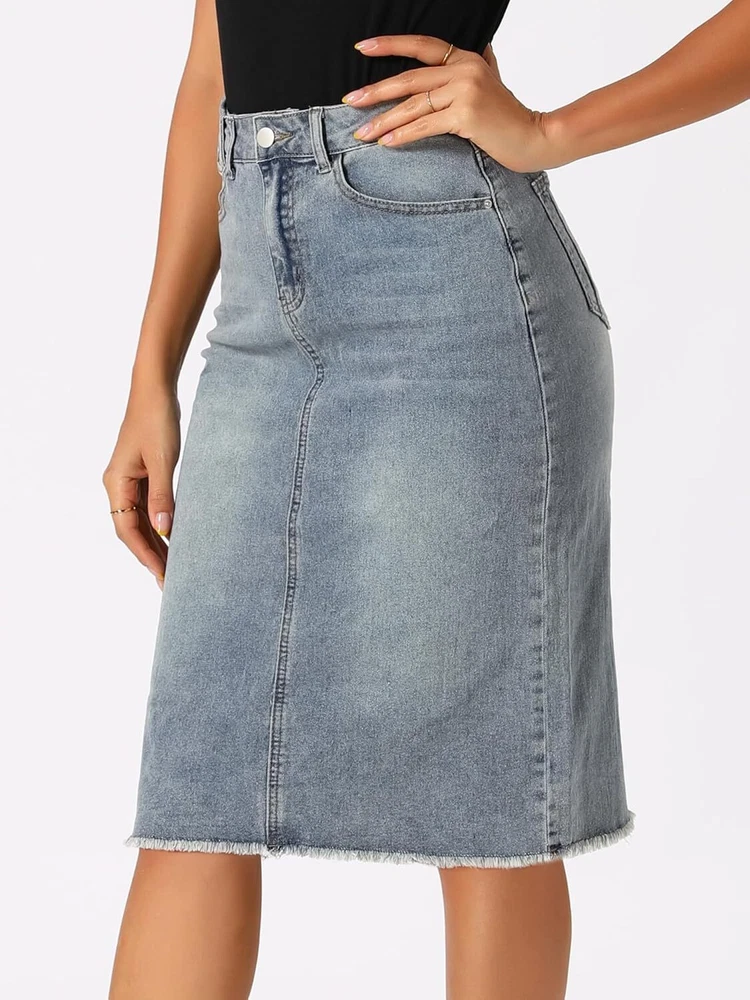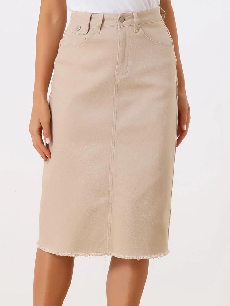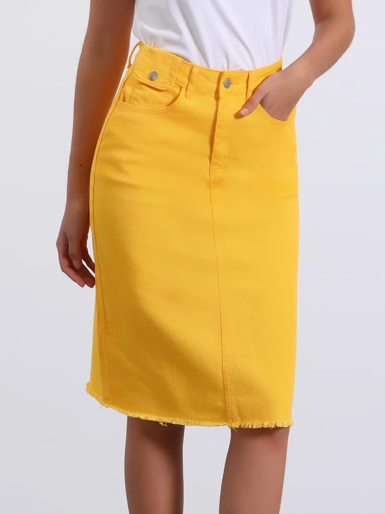 Product Description Allegra K Women's Jean Skirt Back Slit Raw Hems Denim Skirt Denim Skirt, An Essential Wardrobe Piece This Versatile Silhouette Pairs Well With Pretty Much Anything. The relax fit knee length jean skirts is suitable for dating, business, holiday and daily wear, etc. 1 Classic Jean Skirts 2 Various Color Skirts Detail of Women's Fashion Denim Jean Skirts, Stretchy & Excellent Breathable Perfect Match All Kinds Of Tops - Classic Never Goes Out Of Style What is the length of the skirt? The skirt would be pass my knees. If you higher than 5’7", it would be knee length. Is there any raw hem around the bottom? We have updated our skirt, the new version already with the raw hem. Is the skirt straight? No. It looks like a straight skirt, but the one I got is flared Skirt.