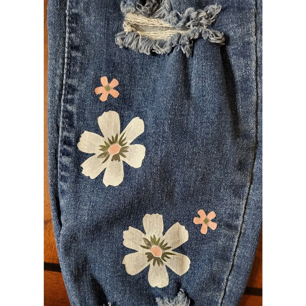 Elevate your denim game with these stylish women's cropped skinny jeans in size LG. The distressed and ripped jeans with the cute floral pattern adds a touch of edgy charm to these skinny jeans, making them perfect for casual outings or a night out on the town. The medium fabric wash complements the blue color, while the floral accents provide a feminine touch. These jeans are designed for women and feature a regular size type, skinny style, and a flattering fit. They are made of high-quality fabric and are perfect for those who want to make a statement with their clothing. These jeans are a must-have for any fashion-forward woman's wardrobe. Waist measures 28 in Rise 10 in Inseam 26.5 in Good pre-owned condition. Jeans are made in China and unbranded. The button closures just has the words Jeans. Add these cute cropped jeans to your wardrobe today!