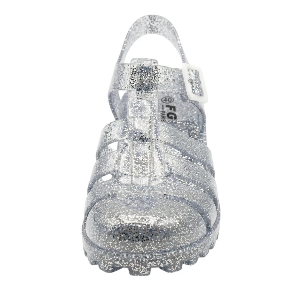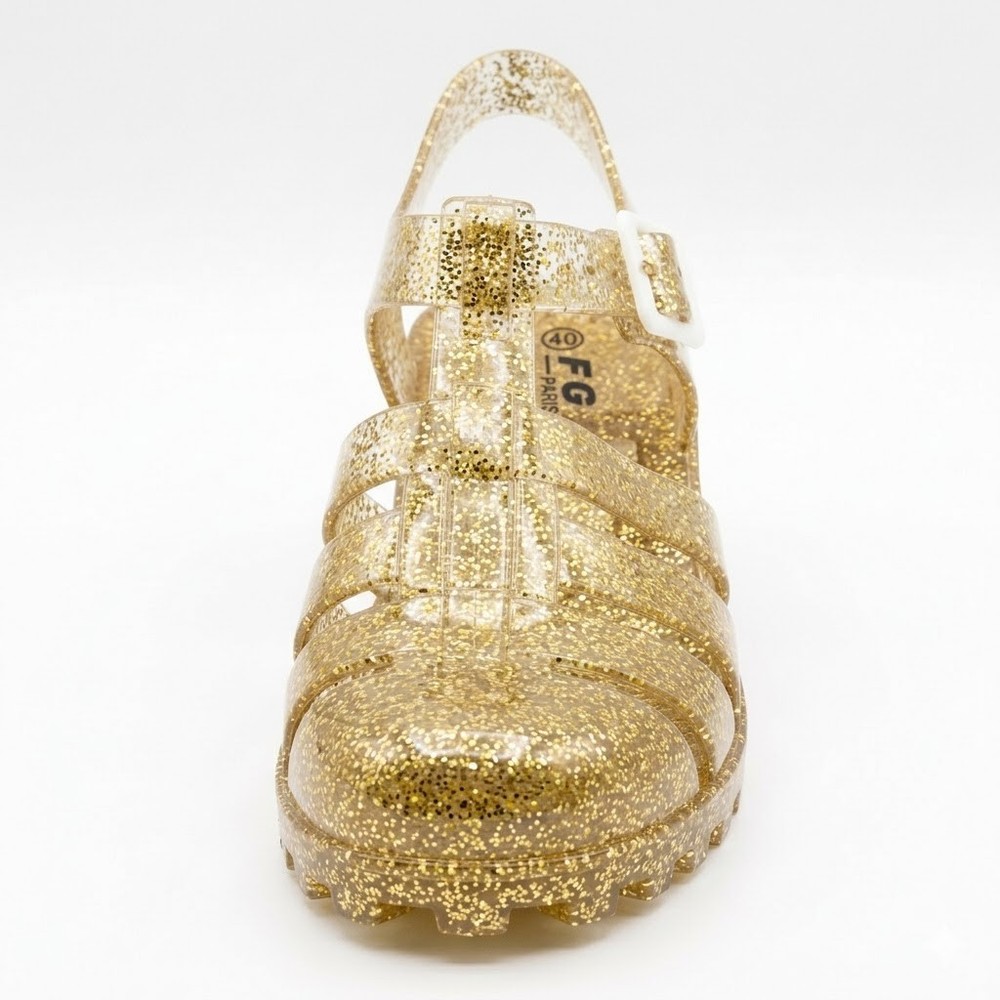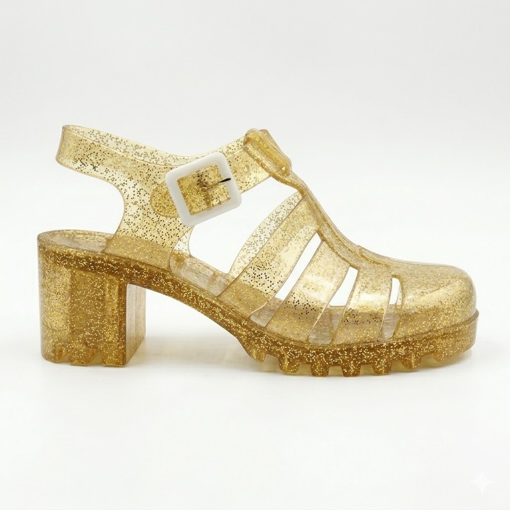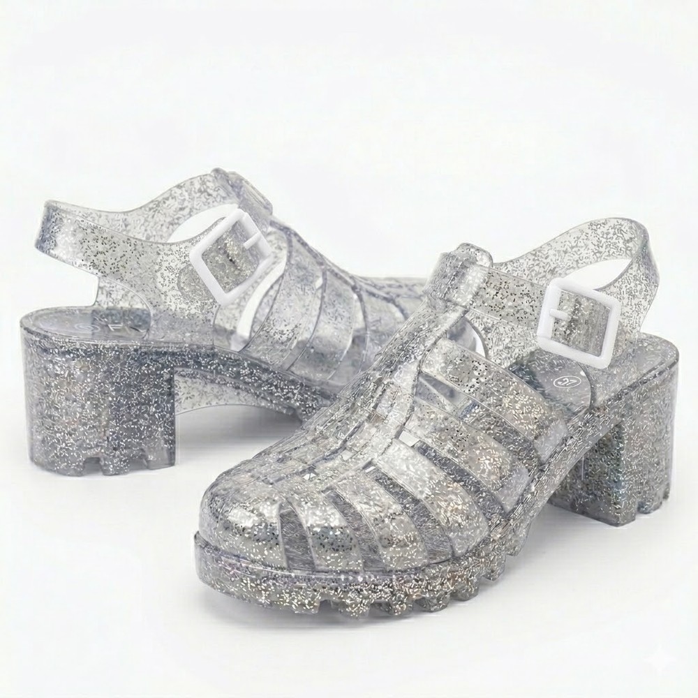 The product is a pair of women's jelly shoes by the brand FGM, specifically clear sandals with a block heel design. They are perfect for summer beach outings, offering a slip-on style for easy wear. Made with jelly material for the upper, these sandals provide a comfortable and stylish option for women looking for a chic and casual footwear choice for beach settings.