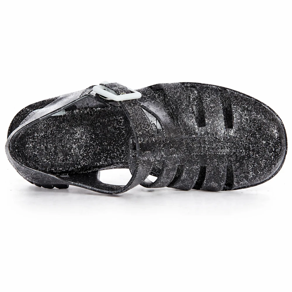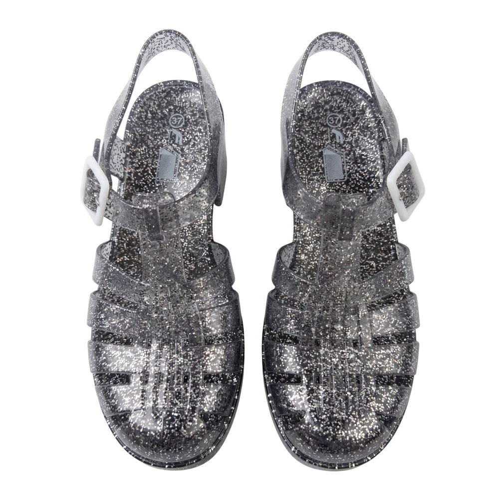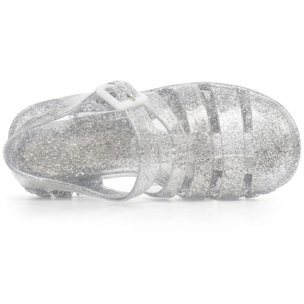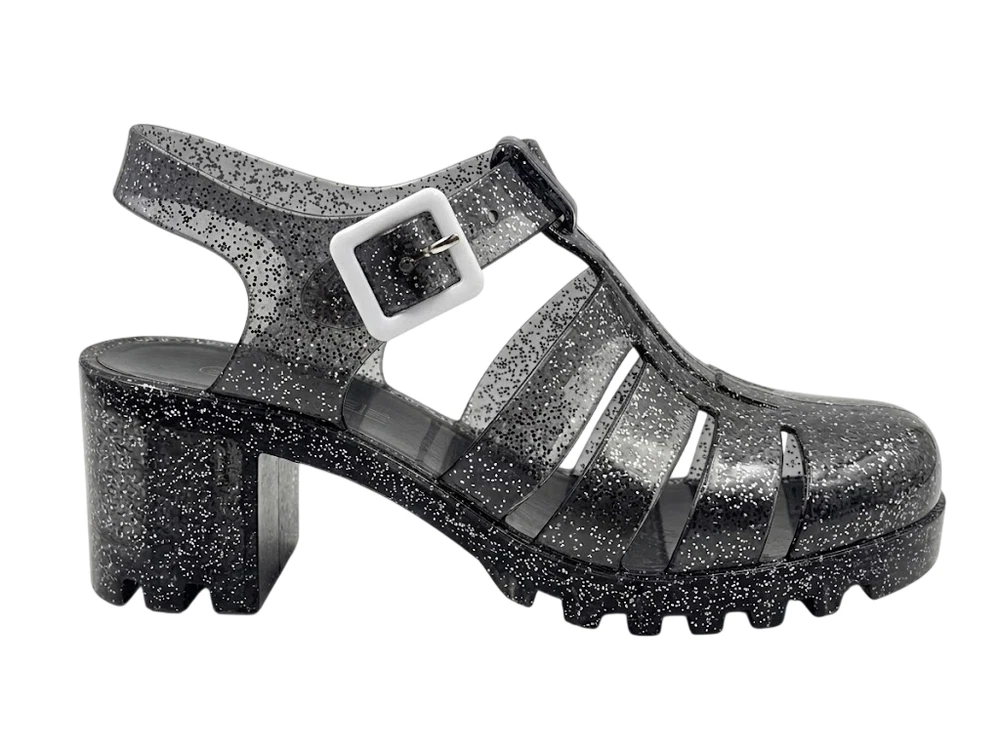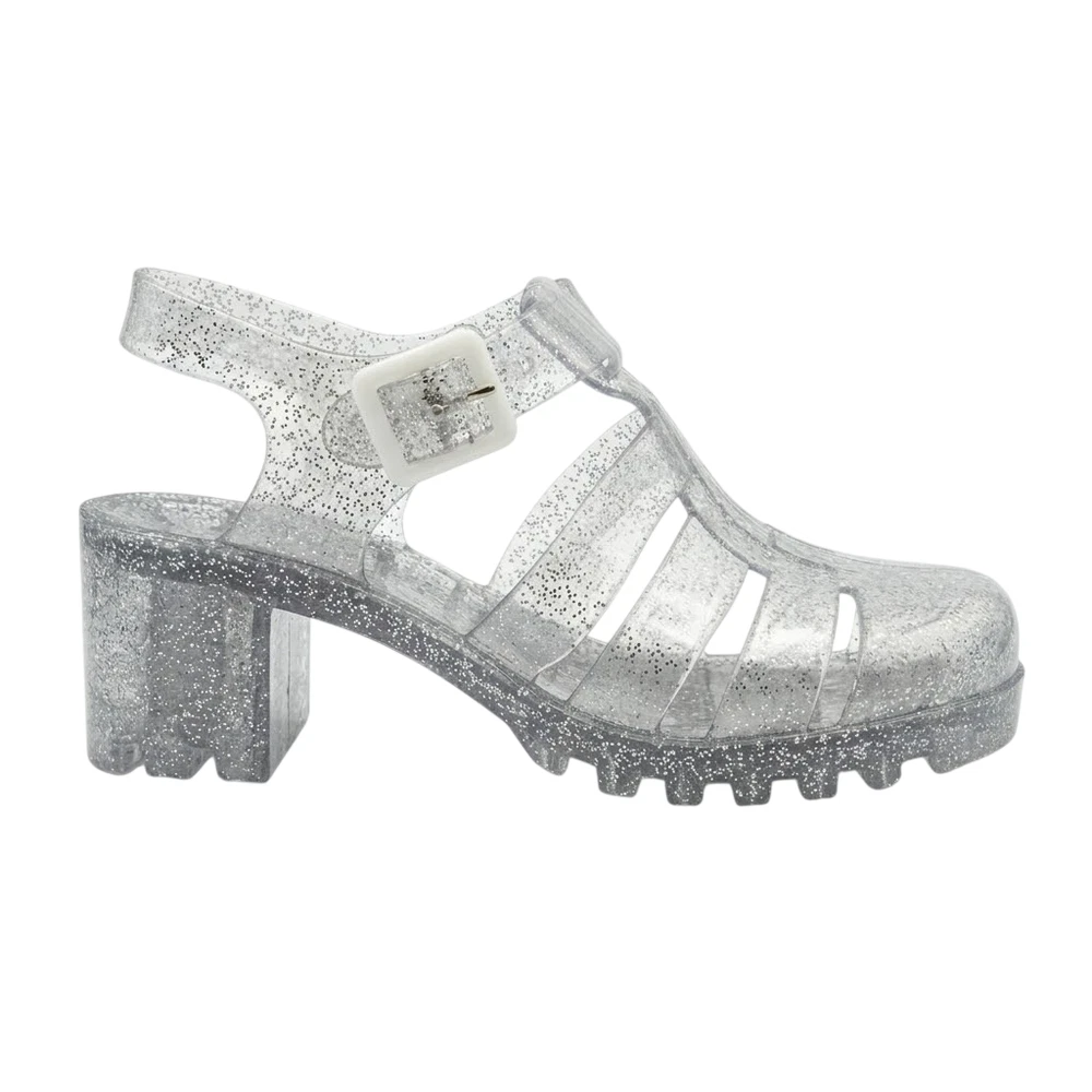 The product is a pair of women's jelly shoes by the brand FGM, specifically clear sandals with a block heel design. They are perfect for summer beach outings, offering a slip-on style for easy wear. Made with jelly material for the upper, these sandals provide a comfortable and stylish option for women looking for a chic and casual footwear choice for beach settings.