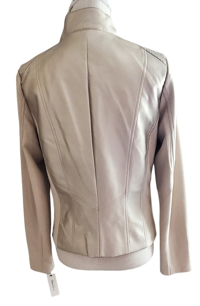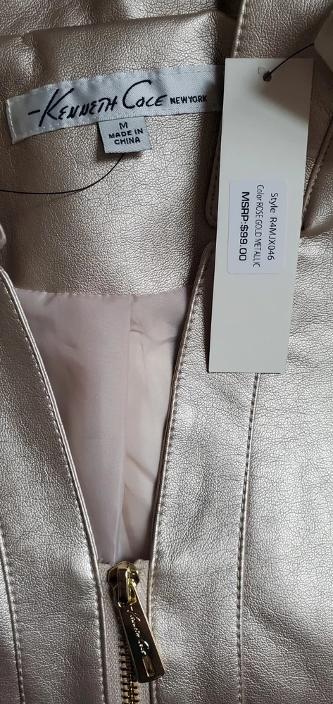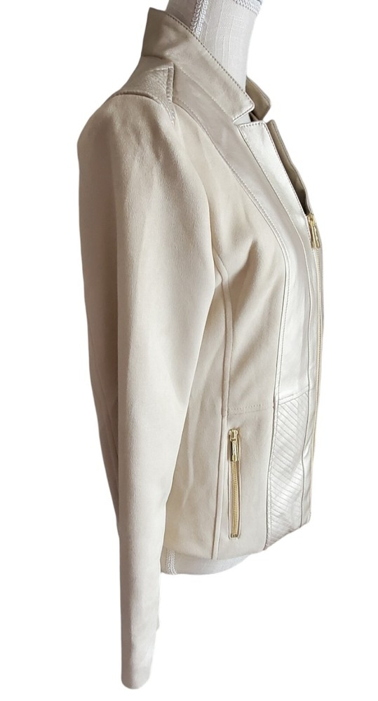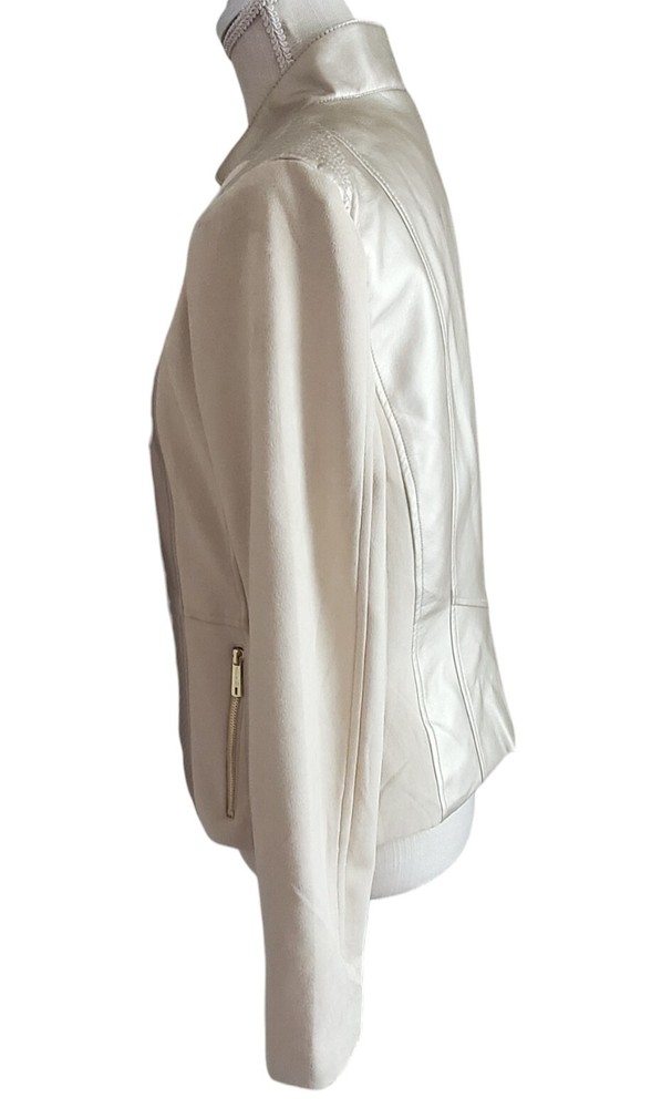 Measurements laying flat unstretched Pit to pit: 18" Waist: 17" The Women's Kenneth Cole Reaction Full Zip Faux Leather Jacket in Ivory, size XL, is a stylish mid-length jacket perfect for casual occasions. Made of faux leather with a polyester lining, this jacket features a solid pattern and a full zip closure for easy wear. The biker-style design and regular fit make it a fashionable and versatile addition to any woman's wardrobe. Easy to care for with its machine washable material, this jacket combines both style and practicality for a timeless look.